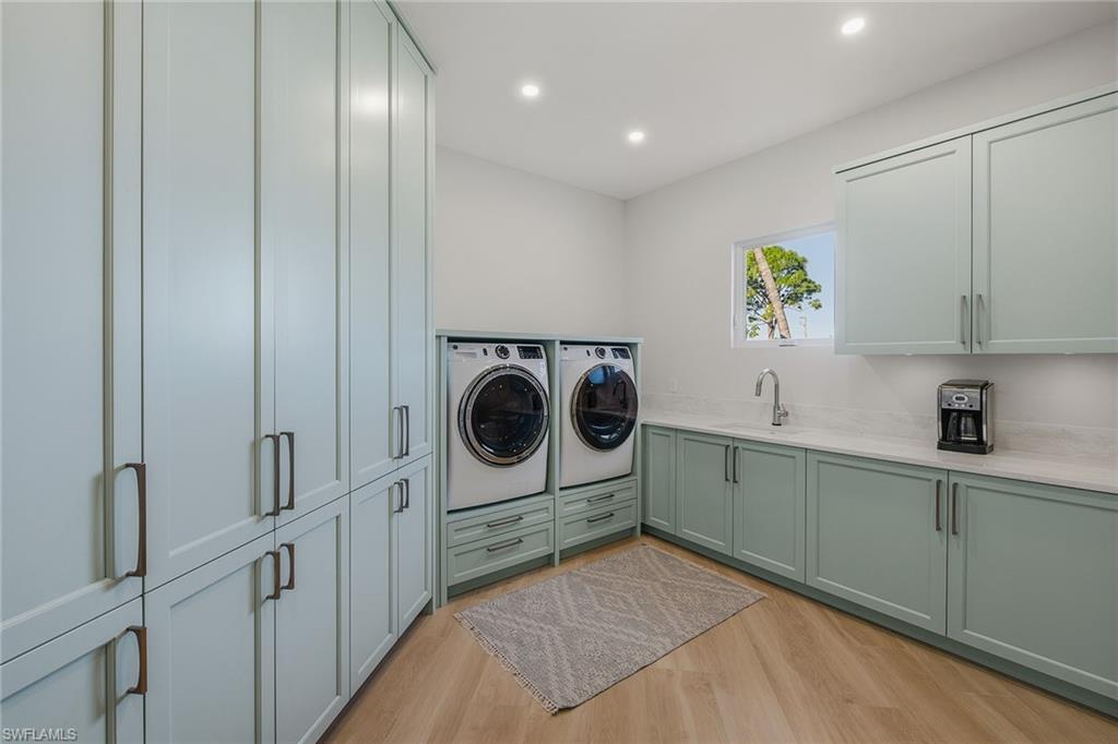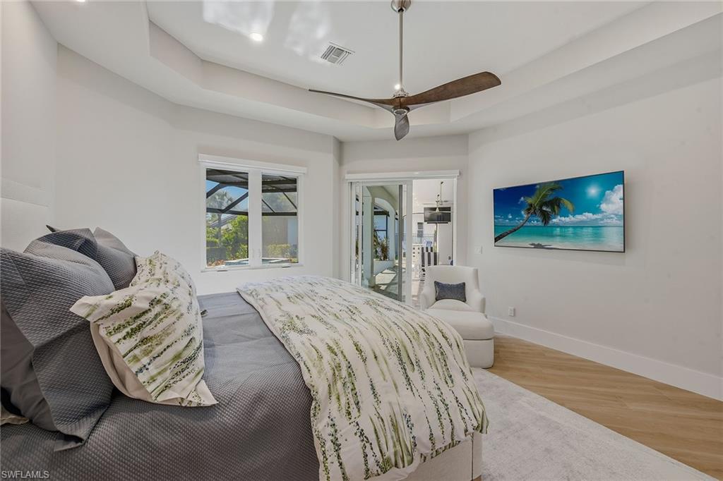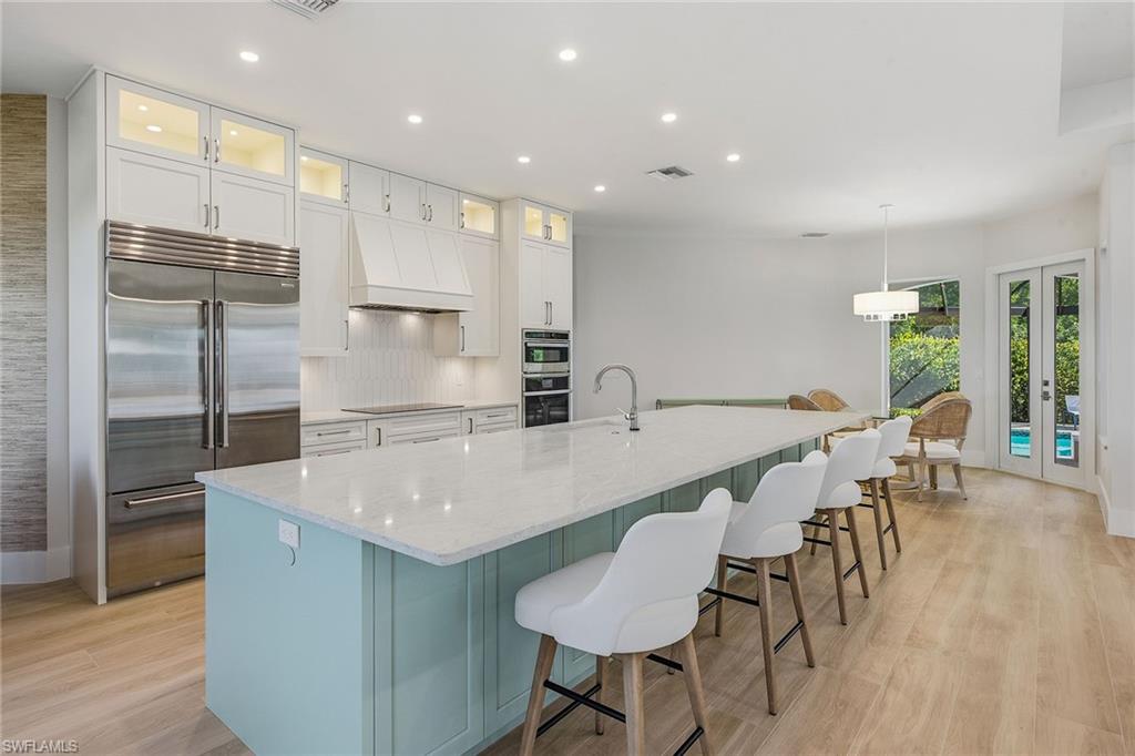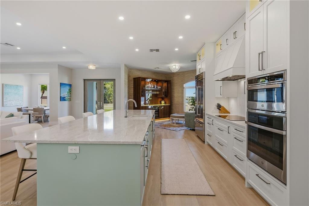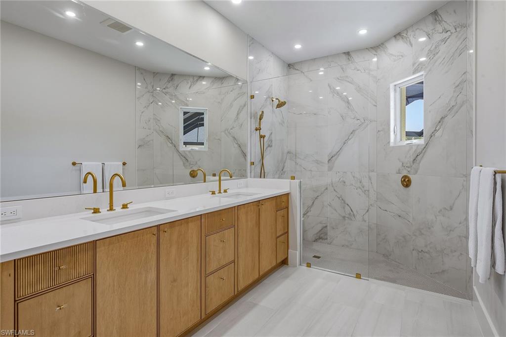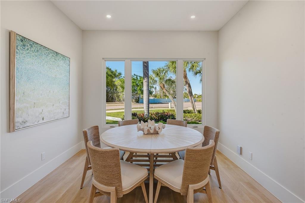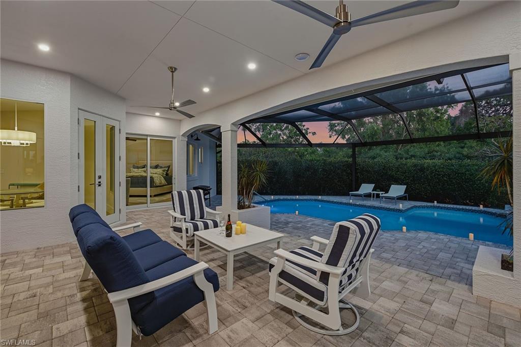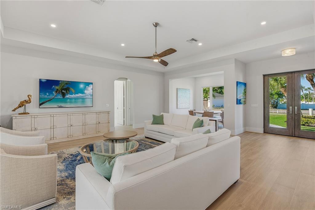 This exceptional, fully rebuilt in 2023 coastal residence is in the prestigious Estate area and was taken down to the slab and meticulously reconstructed, resulting in a rare blend of sophisticated design, modern systems and high-end craftsmanship throughout. The home is highlighted by a new whole-house Generac generator, fresh exterior paint, and all-new designer light fixtures inside and out, along with a curated Clive Daniel furniture package and designer rugs. From the moment you enter, the bright white interior and refined finishes set a luxurious tone, while premium Sub-Zero, Wolf and Cove appliances, custom cabinetry, and a striking custom bar with a backlit natural stone top create a home designed for elegant entertaining and everyday comfort. The thoughtfully designed floor plan offers three bedrooms plus a den, three full baths, and an impressive six-car garage configuration with attached and detached options. Wood-look tile flooring flows throughout the home, complemented by recessed lighting, ceiling fans and new statement light fixtures that enhance the airy coastal feel. The living room enjoys serene pool and lush landscaping views through expansive glass sliders leading to the screened lanai, with the nearby bar featuring a beverage refrigerator that further elevates the entertaining experience. The kitchen is a showpiece, open to the living area and positioned to capture pool and lush greenery views. It features white cabinetry with under-cabinet lighting, a tile backsplash, a four-seat island and seamless access to the lanai through glass sliders, creating an effortless indoor-outdoor connection. The primary suite is a private retreat with tranquil pool views, lanai access, a tray ceiling and custom walk-in closet. Its spa-inspired bath offers a double vanity with a separate vanity area, a frameless glass walk-in shower with floor-to-ceiling tile and a private water closet. Guest accommodations are equally refined, with one guest suite offering lanai access and an en-suite bath, an additional light-filled guest bedroom, all supported by beautifully finished baths featuring frameless glass showers and full-height tile. A well-equipped laundry room includes a GE front-load washer and dryer, utility sink and ample storage. Outdoor living is exceptional, centered around a large screened lanai with an electric-heated pool and spa featuring a sun shelf, ceiling fans and lush tropical views. Extensive upgrades include impact-rated CAT5 PGT windows and doors, new HVAC systems and ductwork, new plumbing and electrical, water filtration, an 80-gallon water heater with recirculating pump, new pool cage and equipment, paver lanai and walkways, and a detached air-conditioned garage with new doors and openers. In an X flood zone, this move-in-ready Estate-area home delivers luxury, function and long-term value in a premier island setting.
