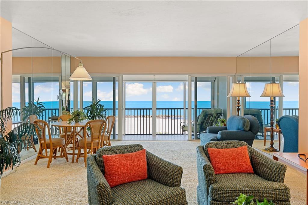 Direct front-row Gulf views take center stage in this three bedroom, three bath end-unit at Gulf View Beach Club, positioned on the south end of the building with sweeping west-facing Gulf and beach views and spectacular sunsets. This light-filled floor plan features an expansive great room opening to a screened, covered Gulf-front balcony, creating an ideal backdrop for coastal living and entertaining. A second, east-facing balcony invites refreshing front-to-back breezes. The generous primary suite enjoys Gulf views and balcony access, while two guest suites each feature en-suite baths. This residence presents an exceptional opportunity to customize and create your ideal beachfront retreat in one of Naples’ premier coastal settings. Gulf View Beach Club has one of the most desirable beachfront locations south of Doctor’s Pass, and is an intimate building with just 32 residences, offering direct beach access, a beachfront pool and patio, social room, fitness center, on-site manager, individual storage rooms, paddleboard and kayak racks. Just minutes from luxury shopping and fine dining of downtown Naples, this is beachfront living at its finest.