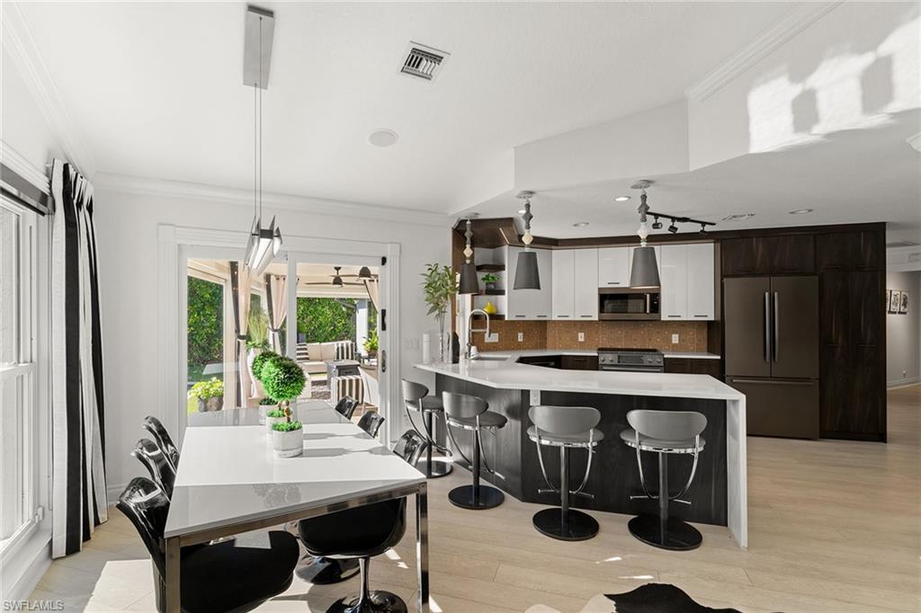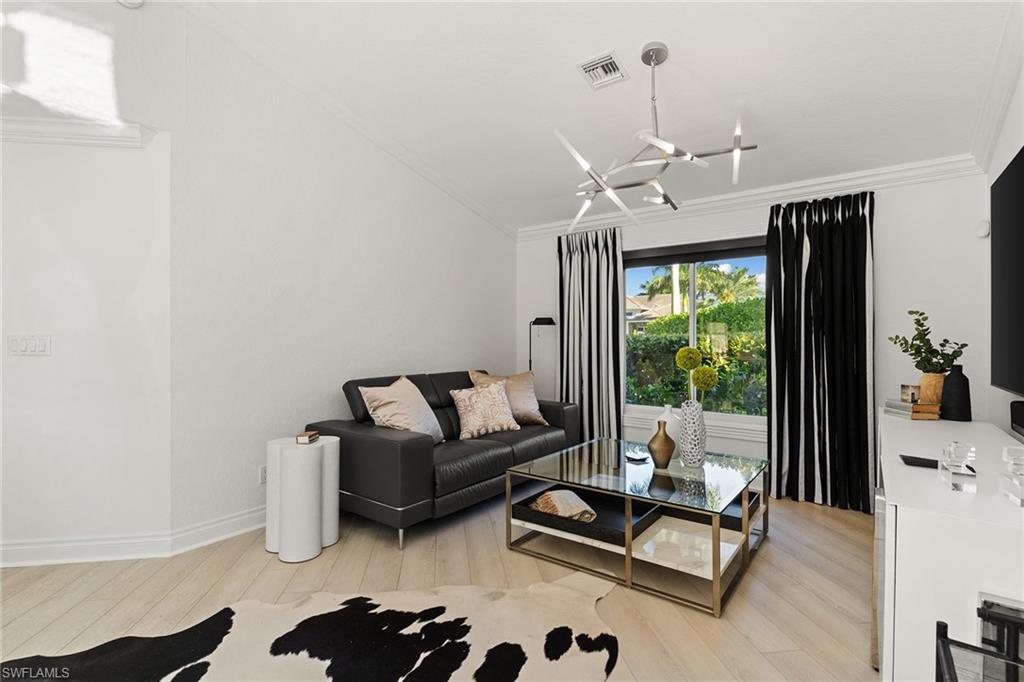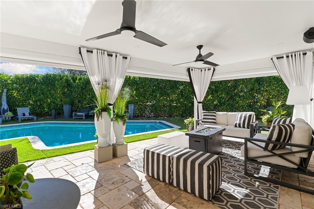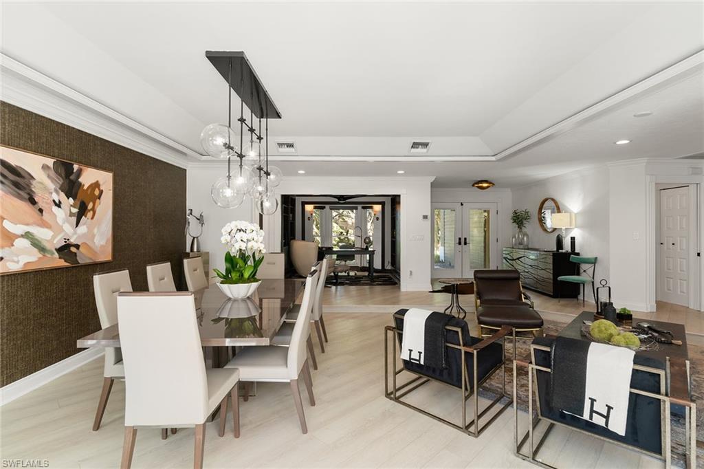 Set on a lush corner lot shaded by majestic banyan trees, this Moorings single-family home blends refined charm with contemporary comfort. The single-story residence features a light-filled, open floor plan with two distinct living and dining areas framed by vaulted and tray ceilings, creating a bright, airy flow throughout. The interior has been thoughtfully updated with clean, modern finishes and a relaxed, polished aesthetic. Designed for effortless indoor-outdoor Florida living, expansive glass doors open to an enchanting backyard retreat with covered and uncovered seating areas, sparkling pool, mature tropical foliage and ample green space, creating a private, resort-style setting ideal for entertaining or everyday enjoyment. The primary suite offers generous closet space and a well-appointed bath, while two guest bedrooms and a den provide flexible living options. Next to the Moorings Country Club, an 18-hole private club with optional golf or social memberships. Prime location is minutes from beach access and downtown Old Naples. No HOA fees. Voluntary Moorings Property Owners Association membership offers exclusive beach park privileges. An exceptional setting for relaxed, refined living in one of Naples desired neighborhoods.