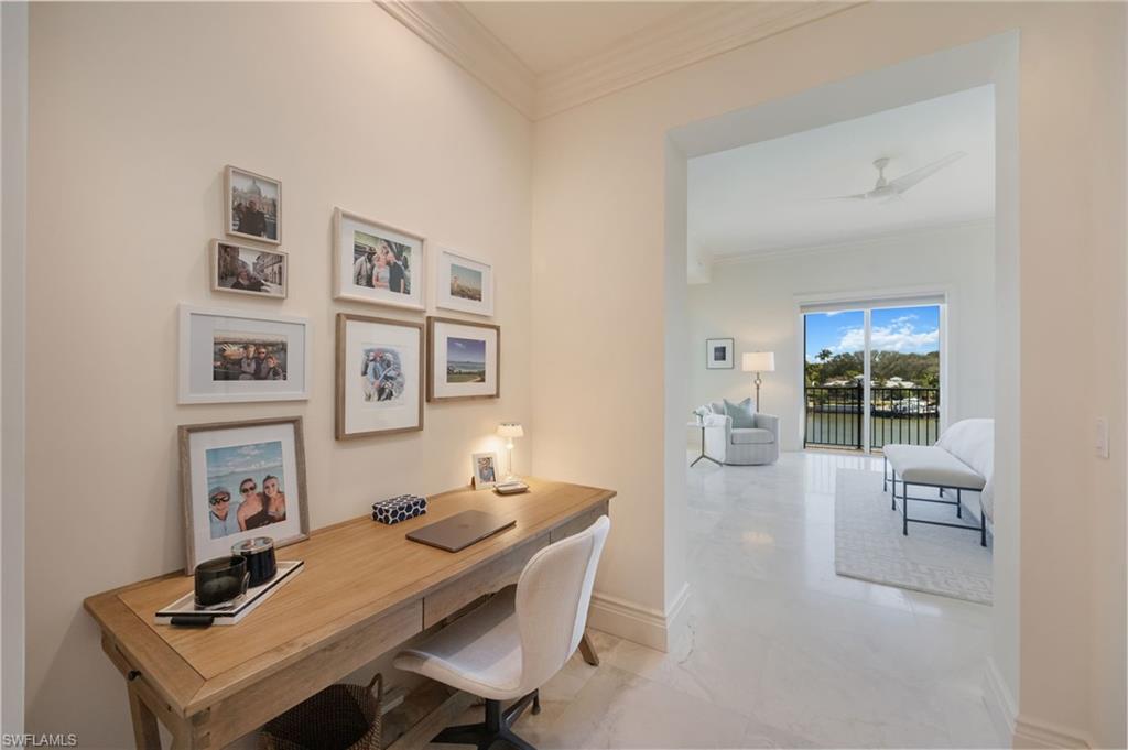 Impeccably maintained and filled with natural light, this exceptional residence is ideally located directly across from Lowdermilk Beach and just moments from the newly developed Four Seasons Naples Beach Club. The thoughtfully designed three-bedroom, 3½-bath split-bedroom floor plan features beautifully maintained marble flooring throughout. Enjoy tranquil views of Hurricane Harbor with partial Gulf glimpses, creating a serene coastal backdrop for everyday living and entertaining. The spacious open lanai—offering both sun and shade—provides unobstructed water views and is the perfect setting to relax bayside with a favorite beverage. This pet-friendly residence welcomes up to two dogs, up to 50 pounds (total), and boating enthusiasts will appreciate the convenience of a personal deeded dock with an 8-ton hoist, just steps away. Charleston Place is a secure, boutique community with a locked entrance and amenities that include a rooftop pool, fitness room, and community gathering space. With only 24 total residences, this low-density building offers privacy, distinction, and a true coastal lifestyle.