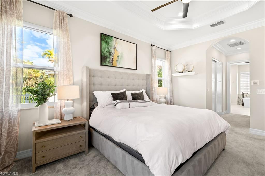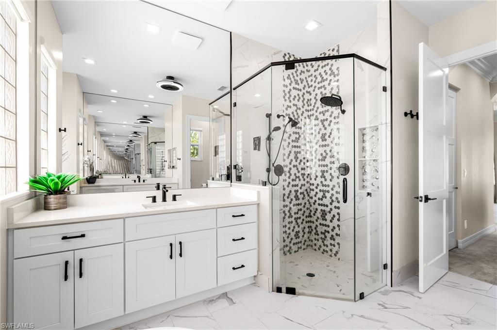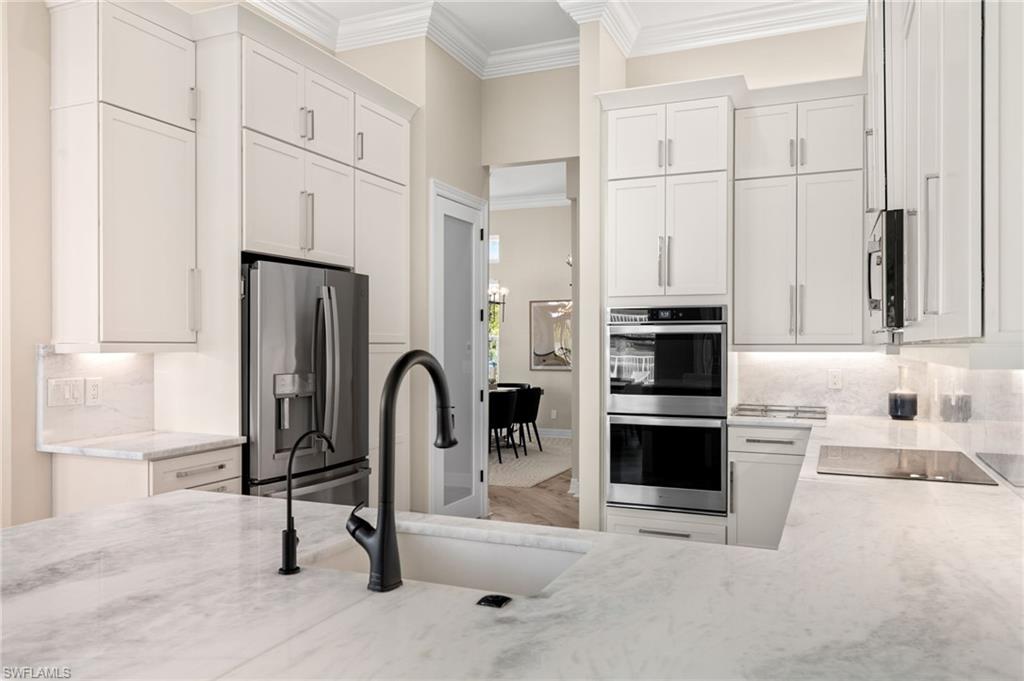 BEST VIEW IN THE COMMUNITY! FULLY UPDATED LUXURY HOME ON AN OVERSIZED LAKEFRONT LOT & CUSTOM INFINITY-EDGE POOL. Tucked away at the end of a quiet cul-de-sac in the prestigious gated community of Saturnia Lakes, this stunning Aquamarine floor plan is positioned on one of the largest lots in the neighborhood and offers the most expansive lake views. This beautifully updated 3-bedroom plus den, 3-bath residence with a 3-CAR GARAGE sits on an oversized pie-shaped, .33 acre lot, providing exceptional privacy and an ideal setting for seamless indoor-outdoor living. The FULLY FENCED BACKYARD showcases a show-stopping custom infinity-edge pool complete with a sun shelf, oversized spa, rock waterfall, and new pool equipment—perfect for entertaining or relaxing in your own private oasis. Inside, the home has been thoughtfully updated over the past two years with high-end finishes and modern craftsmanship throughout. The DESIGNER KITCHEN features custom double-stacked cabinetry, GE Profile stainless steel appliances, double wall ovens, an induction cooktop, and QUARTZ COUNTERTOPS with a full quartz backsplash and waterfall detail. Spa-inspired bathrooms include custom tile work, upgraded vanities, and refined fixtures, while SOLID-CORE INTERIOR DOORS, contemporary LED lighting, Restoration Hardware fixtures, and built-in closets elevate the overall aesthetic. Additional upgrades include two HVAC systems updated in 2019 and 2023, EPOXY GARAGE FLOORING, custom garage storage and cabinetry, updated electrical switches and outlets, and newly sealed patio pavers. NOT LOCATED IN A FLOOD ZONE and equipped with IMPACT WINDOWS AND DOORS, this home offers peace of mind along with refined style. Saturnia Lakes is a highly sought-after North Naples community offering a 24-hour manned gate and resort-style amenities including a resort pool, lap pool, spa, children’s pool, fitness center with saunas, tennis courts, basketball court, billiards room, and ballroom. Ideally located near I-75, Seed to Table, top-rated schools, beaches, shopping, and dining, this exceptional property combines luxury, privacy, and convenience in one of Naples’ most desirable communities. THIS PROPERTY QUALIFIES FOR A 1% LENDER INCENTIVE IF USING PREFERRED LENDER, INQUIRE FOR MORE DETAILS*