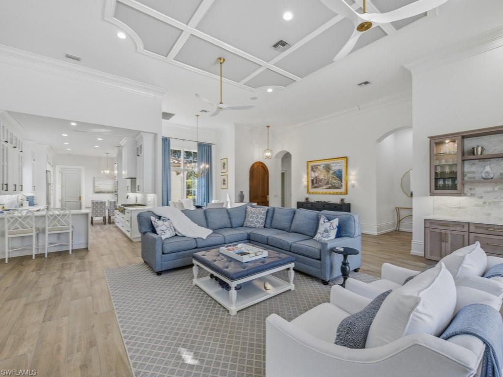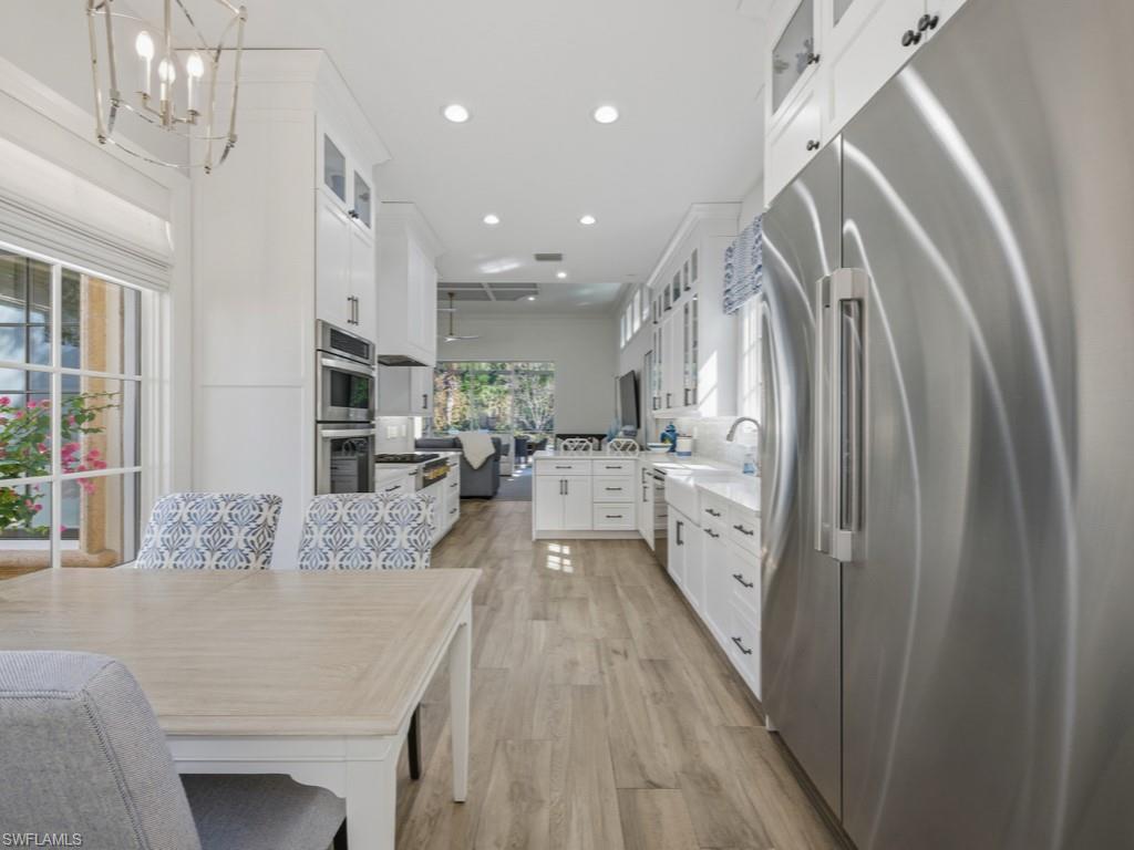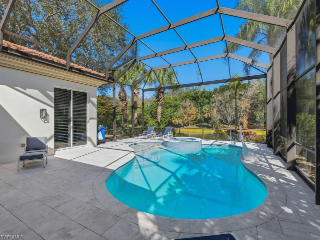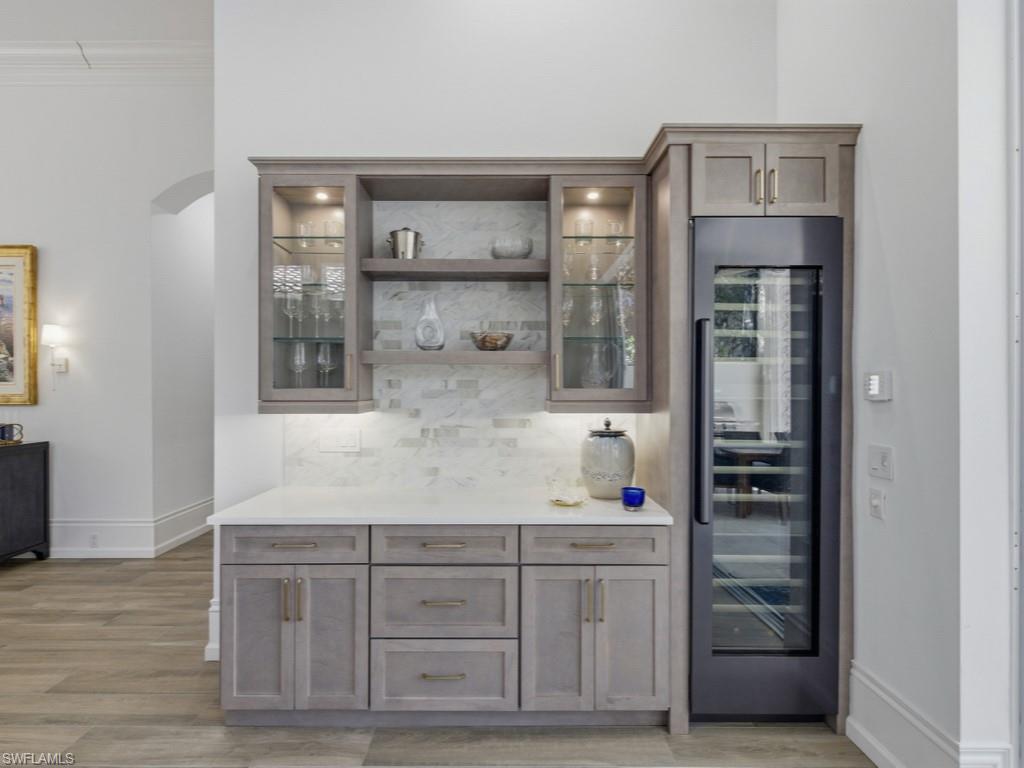 Located in the Mediterra Golf & Beach Club of Naples, on a secluded lakefront homesite within the Villoresi neighborhood, this extensively renovated single-story residence offers refined luxury, thoughtful upgrades, and timeless architectural details throughout. A private front courtyard entry sets an elegant tone, leading into light-filled interiors enhanced by soaring ceilings, arched passageways, crown moldings, and custom millwork. The expansive living room showcases dramatic 14-foot ceilings, transom windows, and pocketing sliding glass doors that seamlessly connect indoor living to the screened lanai and pool area—ideal for entertaining. A custom dry bar with quartz countertops, marble backsplash, display cabinetry, and a Dacor 100-bottle wine refrigerator adds both function and style. The chef’s kitchen is beautifully appointed with quartz countertops, a glass-tile backsplash, custom cabinetry, a GE Monogram six-burner gas cooktop with a Zephyr hood, double-wall ovens, an LG dishwasher, and a premium Dacor refrigerator and freezer. Neutral wood-inspired plank tile flooring flows throughout the home. The primary suite is a private retreat featuring a sitting area or workspace, dual custom walk-in closets with extensive built-ins, and a spa-inspired bath with dual vanities, a walk-in shower, and a Victoria & Albert freestanding soaking tub. Outdoor living is equally impressive, featuring a newly resurfaced pool and glass-tiled spa, an updated stone pool deck with leathered marble finishes, a panoramic picture-frame pool cage, and an outdoor bar with a beverage refrigerator. Additional highlights include a whole-house generator, newly installed AC systems and ductwork, an air-conditioned garage with epoxy flooring, updated landscaping and lighting, a freshly painted exterior, and a new garage door system. Mediterra is one of Naples’ most prestigious luxury golf & beach club communities, offering 2 Tom Fazio championship golf courses, a private beach club w/ restaurant & bar, tennis, pickleball, bocce, a state-of-the-art fitness center, scenic biking & jogging trails, and dining at the private country club. The Mediterra beach club provides an exclusive Gulf-front escape with a 2-story, 10,000-sq-ft facility featuring indoor & outdoor dining, a heated pool, a sundeck, and full cabana beach service.