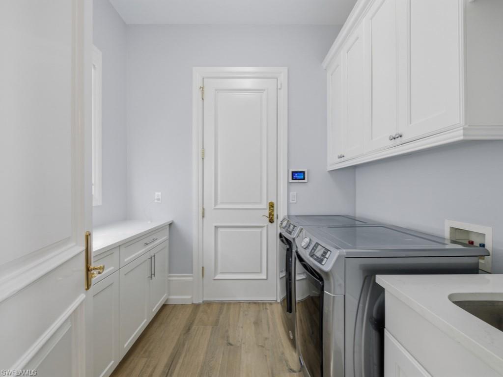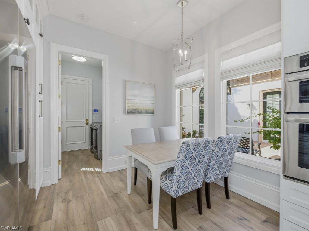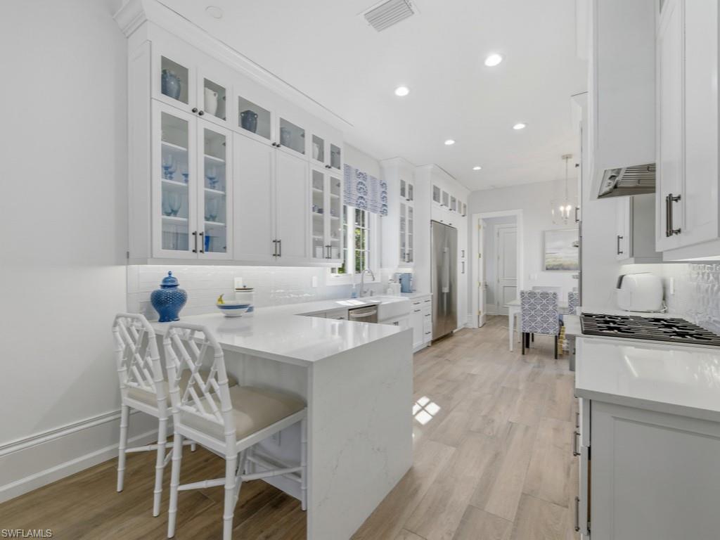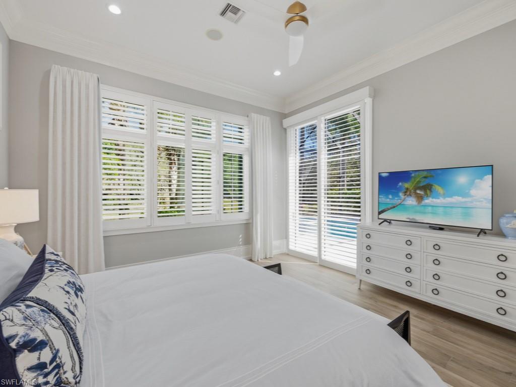 Located in the Mediterra Golf & Beach Club of Naples, on a secluded lakefront homesite within the Villoresi neighborhood, this extensively renovated single-story residence offers refined luxury, thoughtful upgrades, and timeless architectural details throughout. A private front courtyard entry sets an elegant tone, leading into light-filled interiors enhanced by soaring ceilings, arched passageways, crown moldings, and custom millwork. The expansive living room showcases dramatic 14-foot ceilings, transom windows, and pocketing sliding glass doors that seamlessly connect indoor living to the screened lanai and pool area—ideal for entertaining. A custom dry bar with quartz countertops, marble backsplash, display cabinetry, and a Dacor 100-bottle wine refrigerator adds both function and style. The chef’s kitchen is beautifully appointed with quartz countertops, a glass-tile backsplash, custom cabinetry, a GE Monogram six-burner gas cooktop with a Zephyr hood, double-wall ovens, an LG dishwasher, and a premium Dacor refrigerator and freezer. Neutral wood-inspired plank tile flooring flows throughout the home. The primary suite is a private retreat featuring a sitting area or workspace, dual custom walk-in closets with extensive built-ins, and a spa-inspired bath with dual vanities, a walk-in shower, and a Victoria & Albert freestanding soaking tub. Outdoor living is equally impressive, featuring a newly resurfaced pool and glass-tiled spa, an updated stone pool deck with leathered marble finishes, a panoramic picture-frame pool cage, and an outdoor bar with a beverage refrigerator. Additional highlights include a whole-house generator, newly installed AC systems and ductwork, an air-conditioned garage with epoxy flooring, updated landscaping and lighting, a freshly painted exterior, and a new garage door system. Mediterra is one of Naples’ most prestigious luxury golf & beach club communities, offering 2 Tom Fazio championship golf courses, a private beach club w/ restaurant & bar, tennis, pickleball, bocce, a state-of-the-art fitness center, scenic biking & jogging trails, and dining at the private country club. The Mediterra beach club provides an exclusive Gulf-front escape with a 2-story, 10,000-sq-ft facility featuring indoor & outdoor dining, a heated pool, a sundeck, and full cabana beach service.