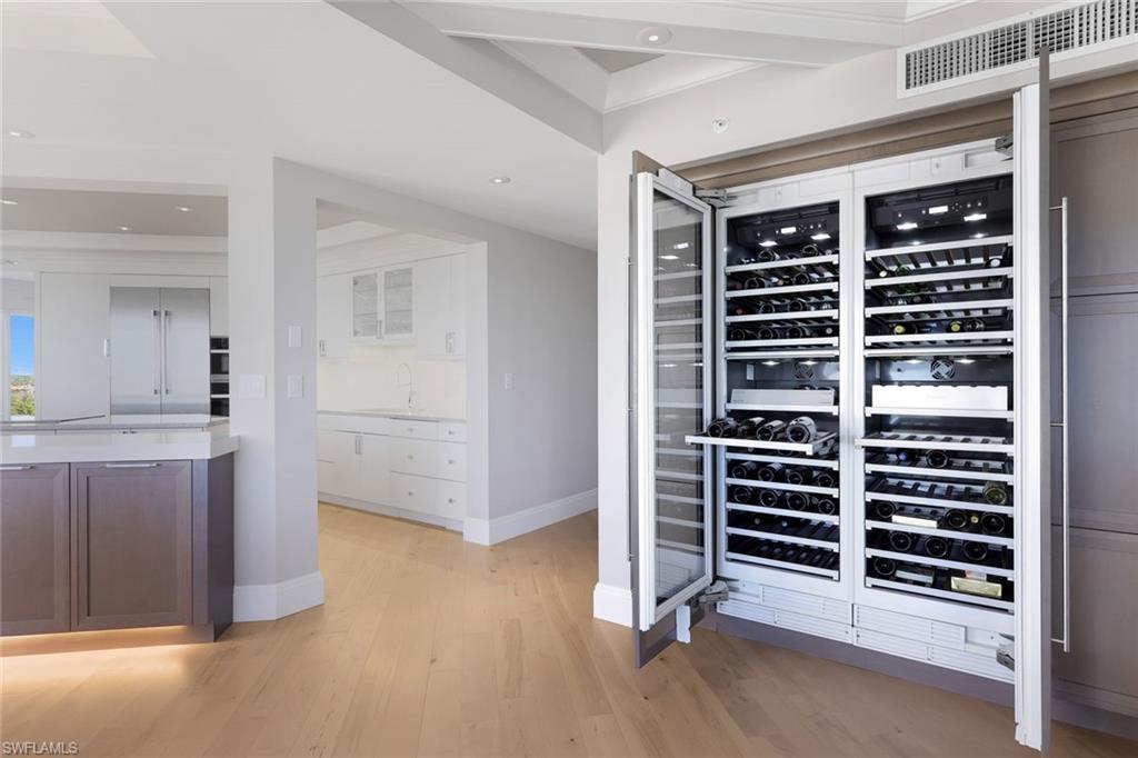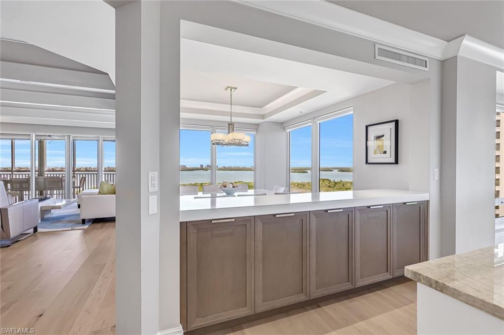Experience the view of a lifetime from the 10th floor of this exquisitely designed, updated, and fully furnished residence in Estancia at Bonita Bay. This rare three-bedroom plus den, three-bath end unit showcases sweeping panoramic views of Estero Bay and the Gulf of Mexico, with breathtaking sunsets enjoyed year-round from the expansive screened lanai. From the moment you enter, this home makes a statement—spectacular water views meet refined designer finishes and architectural detail throughout. The open-concept living space is both grand and inviting, featuring rich maple wood flooring, custom ceiling treatments with striking wood beams, and a beautiful gas fireplace that anchors the living area with warmth and sophistication. Walls of glass flood the home with natural light, enhancing the elegance and coastal beauty of the space. At the heart of the home, the chef’s kitchen is as stunning as it is functional, outfitted with Thermador appliances including an induction cooktop and two wine coolers, a steam oven, Miele wall oven and microwave, and a spacious walk-in pantry. The kitchen flows effortlessly into the dining and living areas, creating a seamless backdrop for everyday living. An additional space off the kitchen features panoramic floor-to-ceiling windows with northern and eastern exposures, offering a tranquil setting to enjoy morning light and ever-changing skies. The luxurious primary suite is privately positioned on one side of the residence and includes custom California Closets and a spa-like bath, while two generously sized guest suites are thoughtfully tucked away on the opposite side for maximum privacy. This residence is thoughtfully equipped with electric hurricane shutters, and the AquaLatch water detection system, ensuring both comfort and peace of mind. Every element of this home reflects quality, craftsmanship, and timeless coastal elegance—truly a move-in-ready showpiece. Residents of Estancia enjoy exceptional amenities including a social room, fitness center, pool and spa, gas grills, two guest suites, and an on-site resident manager. Bonita Bay offers an unparalleled lifestyle with miles of hiking and biking trails, canoe and kayak access, a private marina with on-site restaurant, a private beach club, and a vibrant calendar of activities. Residents of Bonita Bay enjoy an unmatched lifestyle with access to a private beach club, kayaking, canoeing, pickleball/tennis, multiple parks, and more than 12 miles of walking/biking paths. Golf enthusiasts will appreciate five championship courses, along with multiple dining venues, a state-of-the-art fitness center, and a full-service marina (additional fees apply). Ideally located just minutes from world-class dining, shopping, beaches, and nature preserves, with easy access to Downtown Bonita Springs, Downtown Naples, and RSW International Airport, this residence offers the perfect balance of luxury, convenience, and coastal living.
