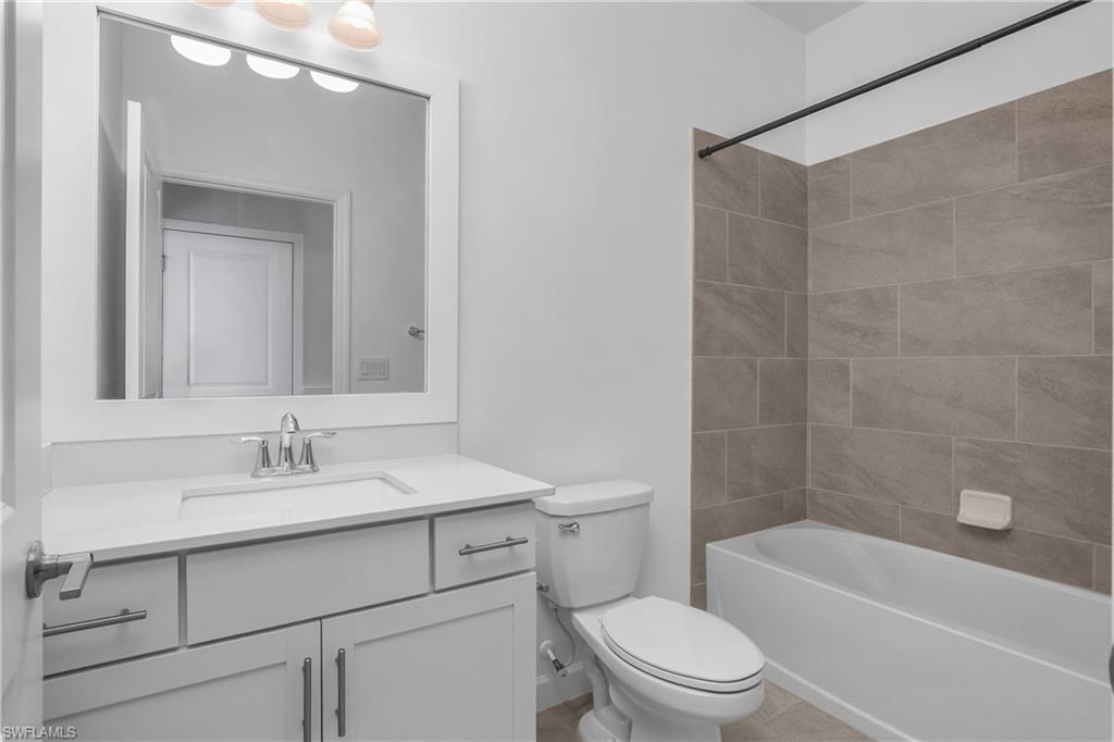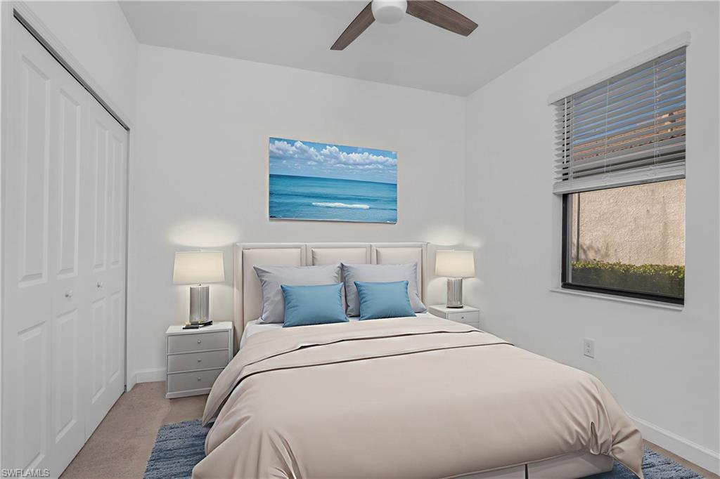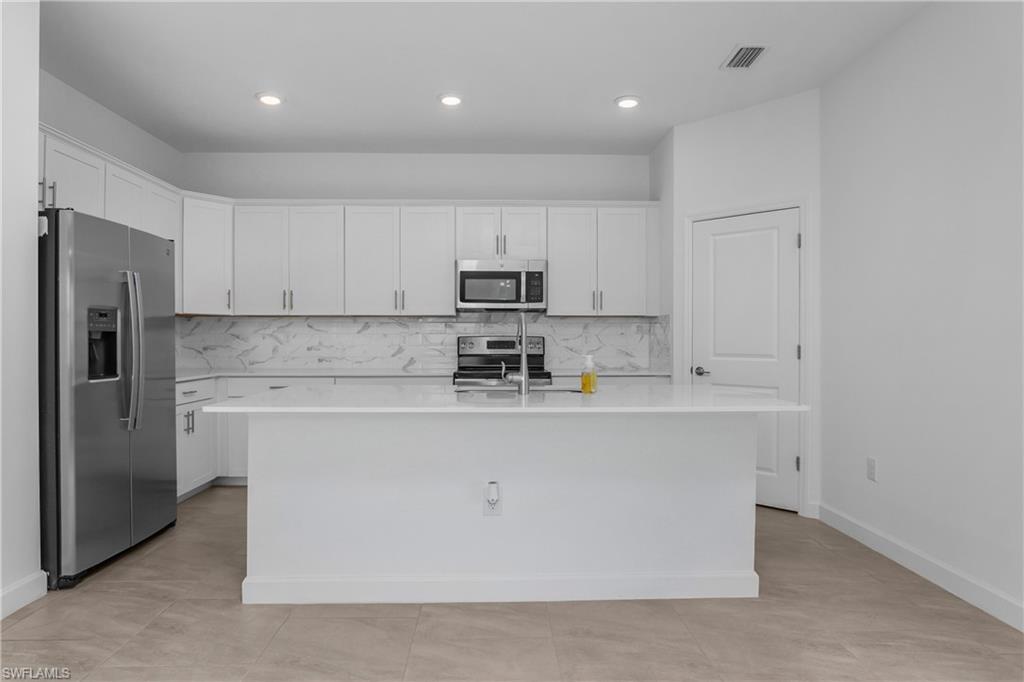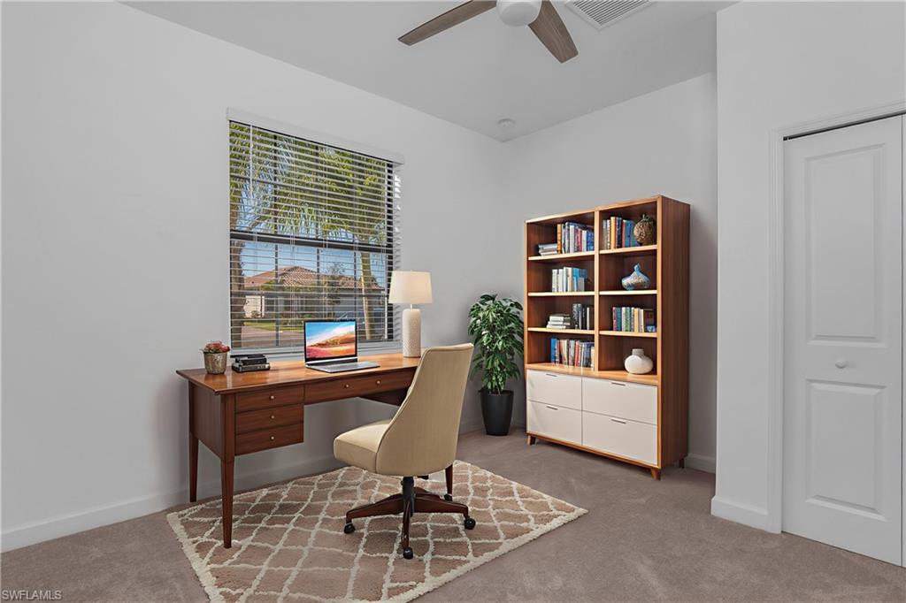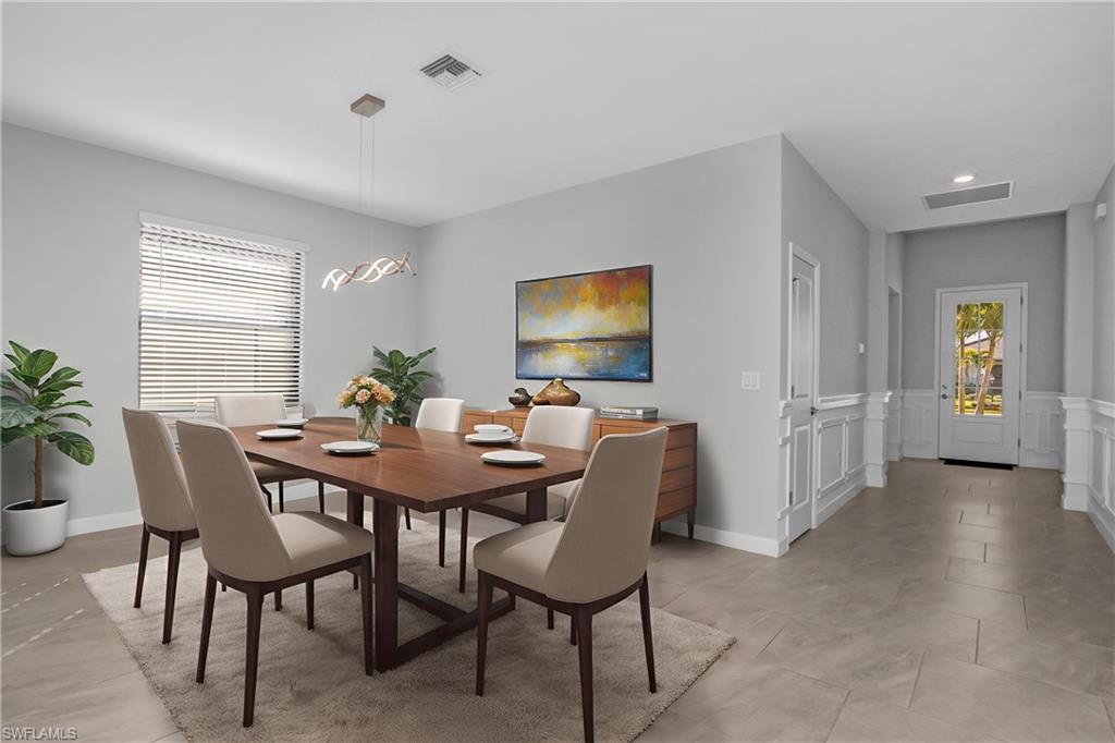 This four bedroom, three bathroom home with a two car garage is located in the sought after Verdana Village community in Estero, Florida. The exterior features a paver driveway that leads to a clean and well maintained front elevation, while the paver lanai at the rear of the home provides a finished outdoor space that connects directly to the interior living area. Inside, the home offers a functional and well defined layout with a comfortable flow between rooms. The main living area opens to the lanai through sliding glass doors, allowing natural light to fill the space and creating a seamless connection between indoor and outdoor areas. Custom wall molding accents the entryway, adding visual interest as soon as you enter the home. The living room features custom TV wall molding that serves as a focal point without overpowering the space. The kitchen is centrally located and includes an island that provides additional prep space and seating, along with a pantry for storage. A backsplash adds a finished look and complements the overall design. The kitchen is positioned to remain connected to the living and dining areas, supporting everyday use and gatherings without feeling crowded. The primary bedroom is finished with plank flooring and offers a comfortable retreat within the home. The ensuite bathroom includes a framed mirror and a clean, cohesive layout. Both additional bathrooms also feature framed mirrors, maintaining a consistent design throughout. The remaining bedrooms are well proportioned and offer flexibility for a variety of needs, with easy access to the secondary bathrooms. A custom paint job throughout the home adds character while keeping the overall look neutral and polished. Each space feels intentional, with finishes that work together to create a cohesive interior. Verdana Village offers a wide range of community amenities designed for daily enjoyment. Residents have access to a resort style pool, fitness center, indoor pickleball and tennis courts, and additional recreational spaces. The community also includes walking paths, green spaces, and gathering areas that encourage an active and connected lifestyle. Verdana Village is conveniently located near shopping, dining, and major roadways, making it easy to enjoy everything Estero and the surrounding areas have to offer. Some photos have been digitally staged