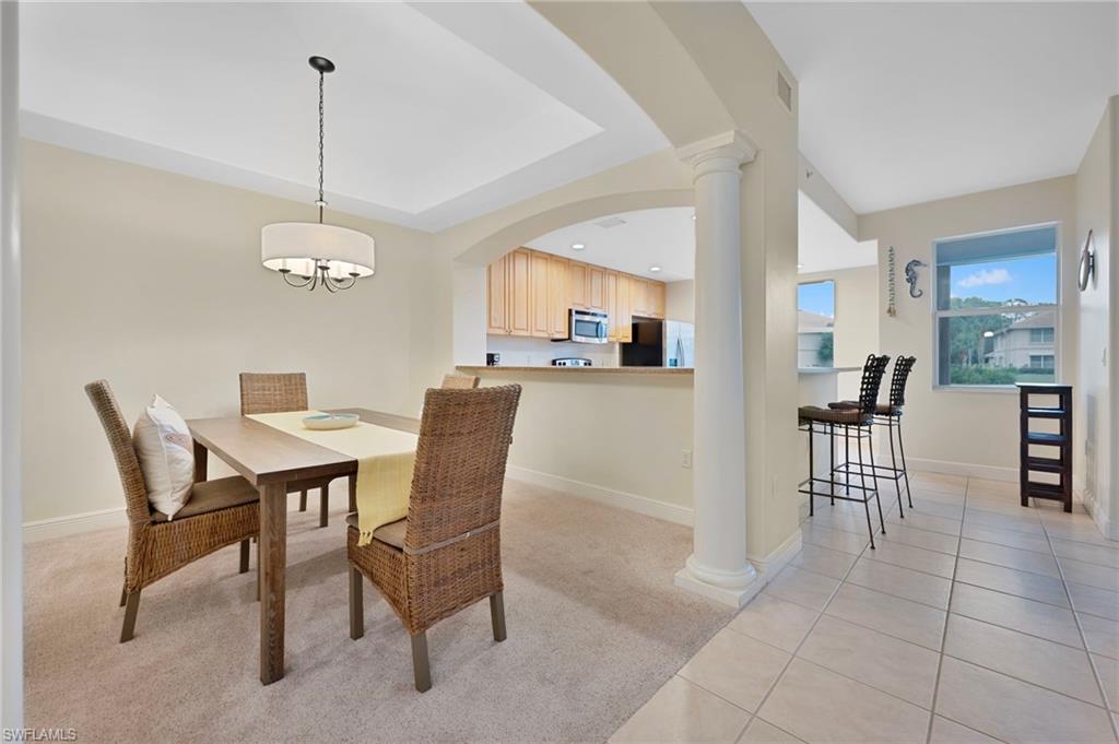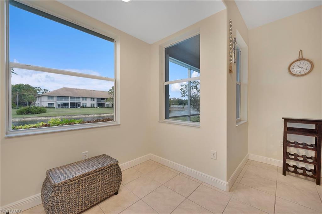 Enjoy effortless Florida living in this 2-bedroom, 2-bath first-floor condo featuring a bright, open layout and serene lake views. Neutral tile flooring flows through the main living areas, offering both style and easy maintenance. The open kitchen connects seamlessly to the family room and includes a breakfast bar, stainless steel appliances, and ample cabinetry, while a separate formal dining area provides space for entertaining. The spacious primary suite offers comfort and privacy. This residence is turnkey furnished with higher-end pieces, making it move-in or rental ready. Step onto the screened lanai and relax while overlooking peaceful lake views. Additional highlights include a detached garage and a strong rental history, making this an excellent investment or seasonal retreat. The community offers resort-style amenities including a pool with cabanas, BBQ areas, and tennis courts. Ideally located in North Naples, just minutes from Mercato’s dining and shopping, and a short drive to area beaches