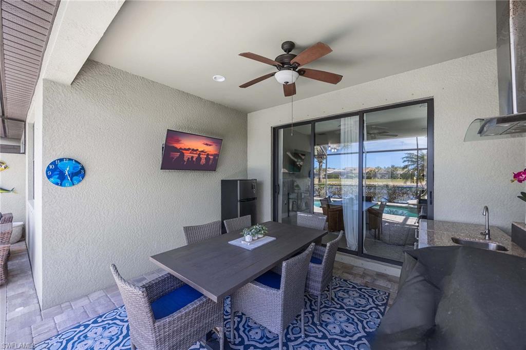 Sunset water views stretch across a sparkling long lake from your private pool and spa, creating a breathtaking backdrop for everyday living and entertaining from the fully equipped natural gas outdoor kitchen. This beautifully maintained home stands out with major recent upgrades including a brand new AC system (2026), new washer and dryer, new hot water heater, and new carpet, offering peace of mind and allowing the home to live comfortably and effortlessly from day one. The open floor plan feels light, bright, and inviting with updated flooring and elegant quartz and granite surfaces throughout. The thoughtfully designed layout offers two spacious bedrooms plus a flexible den with an alcove ideal for adding a closet, making it perfect for guests, a home office, or additional sleeping space. The gourmet kitchen blends style and function with granite countertops, a tasteful tiled backsplash, staggered cabinetry, and bar seating for casual gatherings, while natural gas service and ceiling-mounted garage storage racks add everyday convenience. Gently lived in as a pet-free, smoke-free seasonal residence, the property shows like new. Located in the resort-style community of Winding Cypress, residents enjoy more than 800 acres of preserved natural landscape and exceptional amenities including a clubhouse with a heated pool, on-site restaurant, fitness center, white sand beach, tennis and pickleball courts, dog park, and scenic nature trails, all with low HOA fees and an ideal location just 25 minutes to Fifth Avenue South, 20 minutes to Marco Island, and minutes to major shopping and dining, creating a lifestyle that blends luxury, convenience, and unforgettable views.