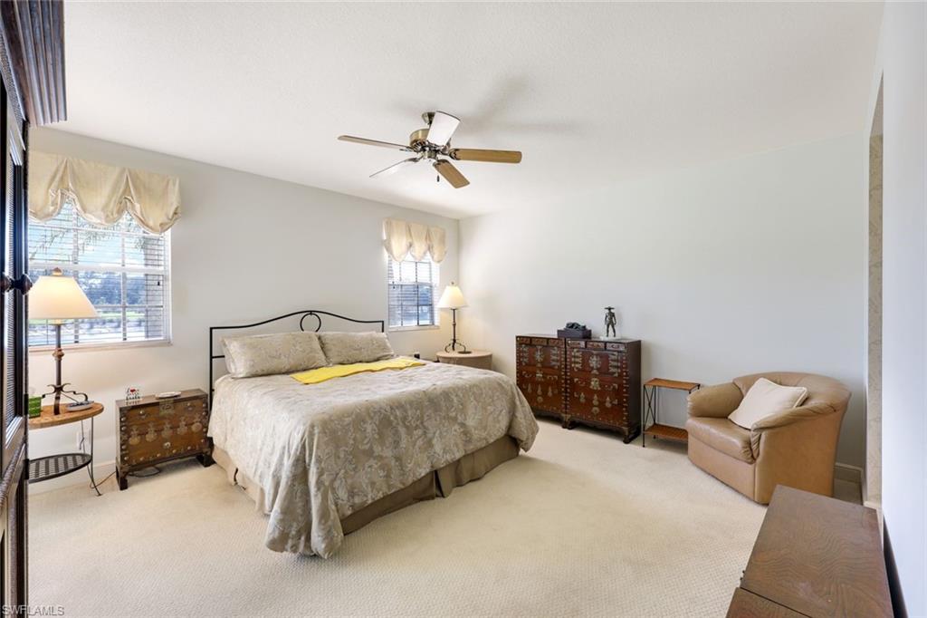 This meticulously maintained first-floor end unit features an open floor plan, a single-car garage, and impressive views of the lake, fountain, and golf course. The primary suite includes a generous walk-in closet, a spacious bathroom with both a separate tub and shower, and a double-sink vanity. Additional highlights include a large screened lanai with electric storm shutters, freshly painted interiors, expansive tile flooring throughout the living areas, as well as in-unit laundry with extra storage. The unit is offered tastefully furnished and ready for immediate occupancy. For added peace of mind, a one-year home warranty is provided. Laguna Royale benefits from recently replaced roofs (approximately 2.5 years ago) and newly painted exteriors. The community pool and spa offer panoramic views of the lake, fountain, and golf course, providing an ideal setting for relaxation. Centrally positioned, Laguna Royale offers convenient access to all that Naples has to offer, making it one of the best values within Vineyards.