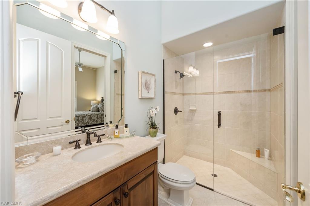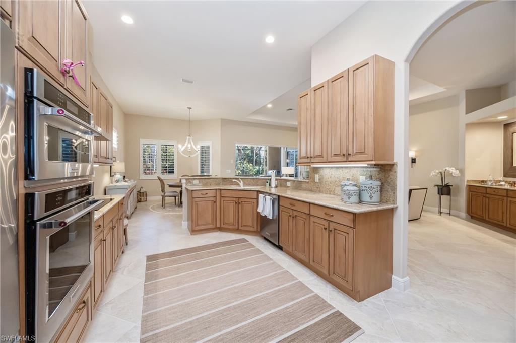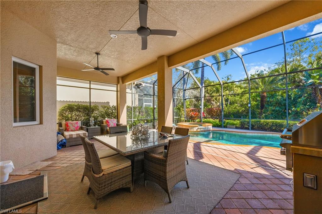 Hammock Isles in The Vineyards! This beautifully maintained single-family residence offers three bedrooms plus a den, three full baths, and a two-car garage. Designed for effortless indoor-outdoor living, the home features a pavered, screened lanai with pool, spa, outdoor kitchen, and a covered area ideal for relaxing or outdoor dining. Perfect for entertaining! The spacious great-room floor plan is complemented by neutral finishes and décor, creating a light, bright, and move-in-ready home. Quality craftsmanship and thoughtful upgrades are evident throughout, including tray ceilings, wainscoting, plantation shutters, and updated light fixtures. Glass front doors invite abundant natural light, while serene, private garden views provide a peaceful backdrop. Additional features include electric hurricane Kevlar screens, offering added security and peace of mind. Membership at the Vineyards Country Club is optional and offers an exceptional array of amenities, including 36 holes of championship golf, 12 Har-Tru tennis courts, pickleball, bocce, a resort-style pool and spa, an outdoor bar, and a state-of-the-art wellness center featuring a fitness facility, café, halotherapy salt room, saltwater lap pool, and full massage and salon services.