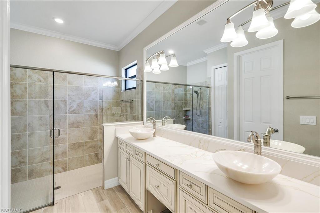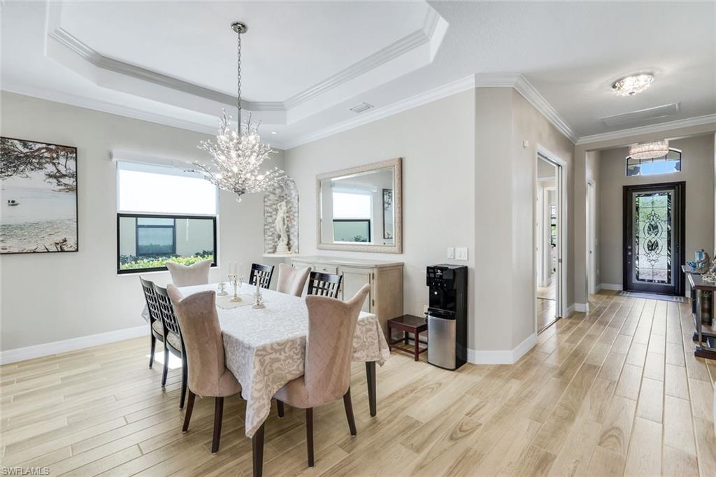 Experience the ultimate in Southwest Florida living with this simply irresistible Maria floorplan, thoughtfully enhanced with luxurious upgrades throughout. Marvel at wide, panoramic lake views from your southeast-facing lanai, where every sunrise and sunset paints a breathtaking backdrop. Step through the elegant glass-inset front door into a gracious foyer, illuminated by a beautiful chandelier, then into an expansive great room with striking tray ceilings, refined crown molding, and designer tile flooring. Entertain effortlessly in the open-concept space, anchored by an oversized island that seamlessly connects the gourmet kitchen, living area, and formal dining room—perfect for gatherings both intimate and grand. The chef’s kitchen impresses with premium cabinetry, a sleek single-bowl sink, custom rollout drawers, abundant storage, a large pantry with extra shelves, and sophisticated ambient lighting. Enjoy the upgraded kitchen exhaust, which vents outside the home for optimal freshness. Indulge in the tranquil primary suite, featuring a spacious walk-in closet with custom California Closets and a spa-inspired bath with dual sinks, gleaming quartz countertops, an oversized shower, and a built-in quartz bench. Bedroom closets are outfitted with California Closets for superior organization. Two additional bedrooms and a flex room ensure comfort and privacy for family and guests alike. Enjoy unparalleled resort amenities with Social Membership privileges: a sparkling pool with a waterfall, dedicated lap lanes, poolside cabanas and café, the exclusive Utopia Spa, and a state-of-the-art fitness center. This home is ideally located near award-winning Gulf beaches, vibrant dining and entertainment, and central to Naples, RSW International Airport, and premier shopping, arts, and recreation. It offers the pinnacle of luxury, comfort, and convenience.