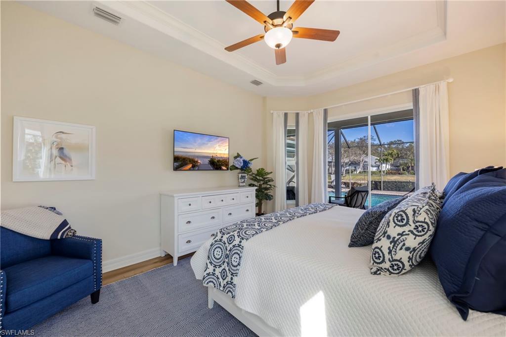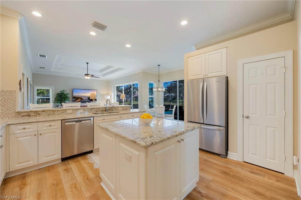 This pristine lakefront residence is located in the Wedgewood enclave of The Vineyards and has been thoughtfully updated and designed to suit a wide range of lifestyles. Offering four bedrooms plus a versatile den or office and three full baths, the home is perfectly positioned on a tranquil lakefront lot with a picturesque water feature. A well-designed floor plan welcomes you with formal living and dining rooms that flow seamlessly into the heart of the home, where the kitchen, breakfast nook, and family room create an inviting space for everyday living and entertaining. The upgraded kitchen is appointed with a Bosch gas cooktop and dishwasher, GE Profile wall oven, convection microwave, and a Whirlpool refrigerator, all set against transitional white cabinetry and granite countertops. Sliding doors lead to the screened lanai, where peaceful lake views provide the ideal backdrop for outdoor relaxation. The spacious primary suite features two walk-in closets and a well-appointed bath with dual vanities, a walk-in shower, and linen storage. Three additional guest bedrooms are complemented by two guest baths, one of which also serves as a convenient pool bath. Recent upgrades include two newer air conditioning systems (2021), water heater (2022), tile roof (2021), epoxy floor and overhead storage in garage, whole-house generator with a 500-gallon propane tank, impact-resistant windows, gutters, and Storm Catcher screens on the lanai, offering both comfort and peace of mind. Membership at the prestigious Vineyards Country Club is optional and provides access to an exceptional lifestyle, including 36 holes of championship golf, 12 Har-Tru tennis courts, 8 pickleball courts, bocce, a world-class Wellness Center and Spa, a resort-style pool with food and beverage service, multiple dining venues, and more. The club’s newly renovated North Course has earned national recognition from Golf Digest as one of the country’s most significant recent golf course redesigns.