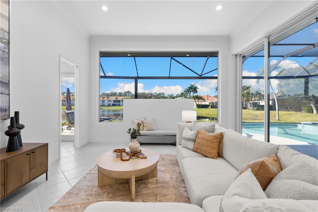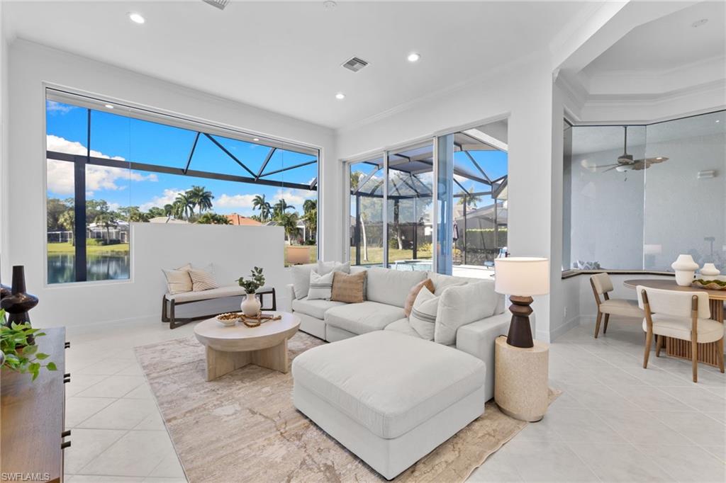 There's a reason Stonebridge estates on quarter-acre lots with water and golf views don't stay available long—and 1624 Manchester Court makes that reason clear the moment you step onto the covered lanai. Southwest exposure means afternoon light dances across the water while the 16th tee box frames the backdrop. The 21x40 heated pool runs parallel to 1,471 square feet of outdoor living space—fully enclosed with dark-finish picture window screening that preserves views while creating year-round usability. This is where Sunday mornings feel less like routine, more like ritual. Inside, 3,526 square feet unfold with a floor plan builders stopped producing: primary suite tucked privately off the living room with lake views through sliders that open to the lanai, while three guest bedrooms cluster on the opposite wing—true separation that means visiting family stays a week, not just a weekend. The 23-foot den isn't a repurposed bedroom. It's actual workspace with a door, built-in desk, and room to think. The kitchen opens completely to the family room and morning room—a 40-foot sightline that means Thanksgiving prep happens while conversation flows, not from behind walls. Granite counters, center island, stainless appliances. The kind of kitchen where Sunday breakfast extends into afternoon without anyone needing to relocate. Generator for peace of mind. Bundled Stonebridge golf membership with Kipp Schulties' redesigned championship course, Bistro dining, resort saltwater pool—all included. Three miles to the beach, fifteen minutes to 5th Avenue. Quarter-acre estates with 3,526 square feet, separated bedroom wings, and water-plus-golf views are measured in years between listings in Stonebridge. This one rewards buyers who recognize that floor plans like this—with 1,471 square feet of screened outdoor living, actual entertaining space, and true guest privacy—don't get replicated in modern construction.