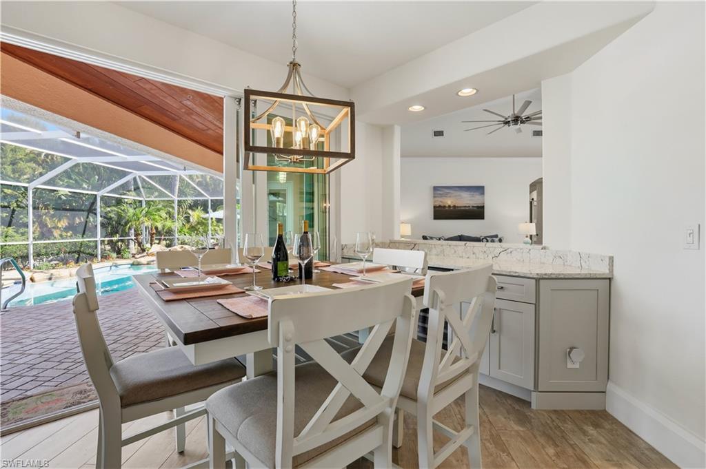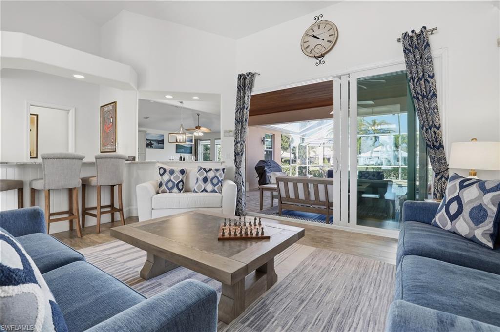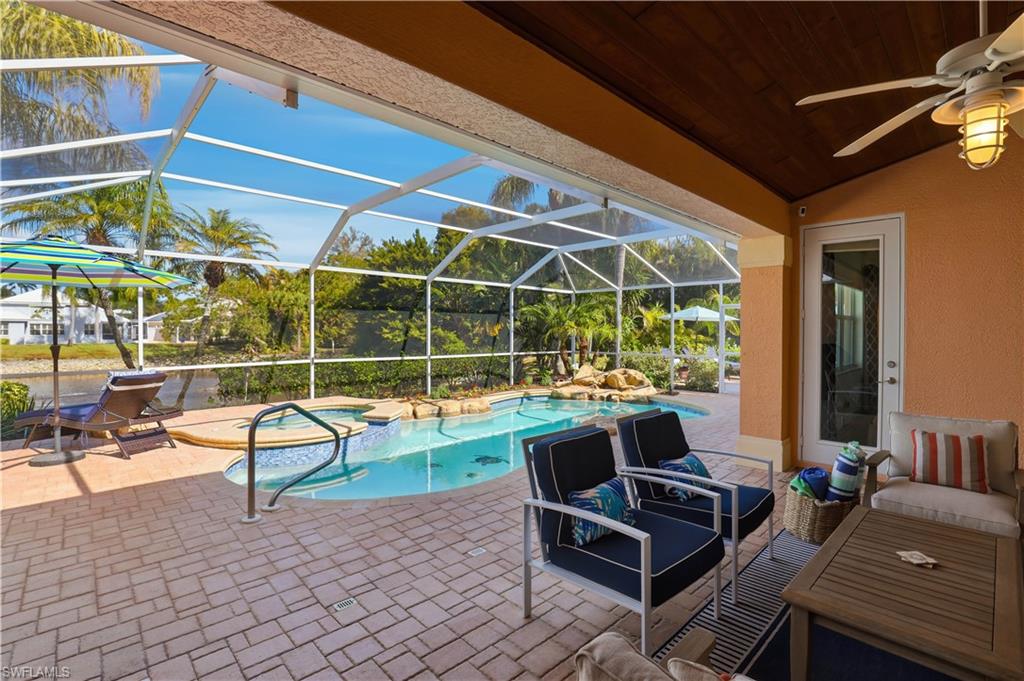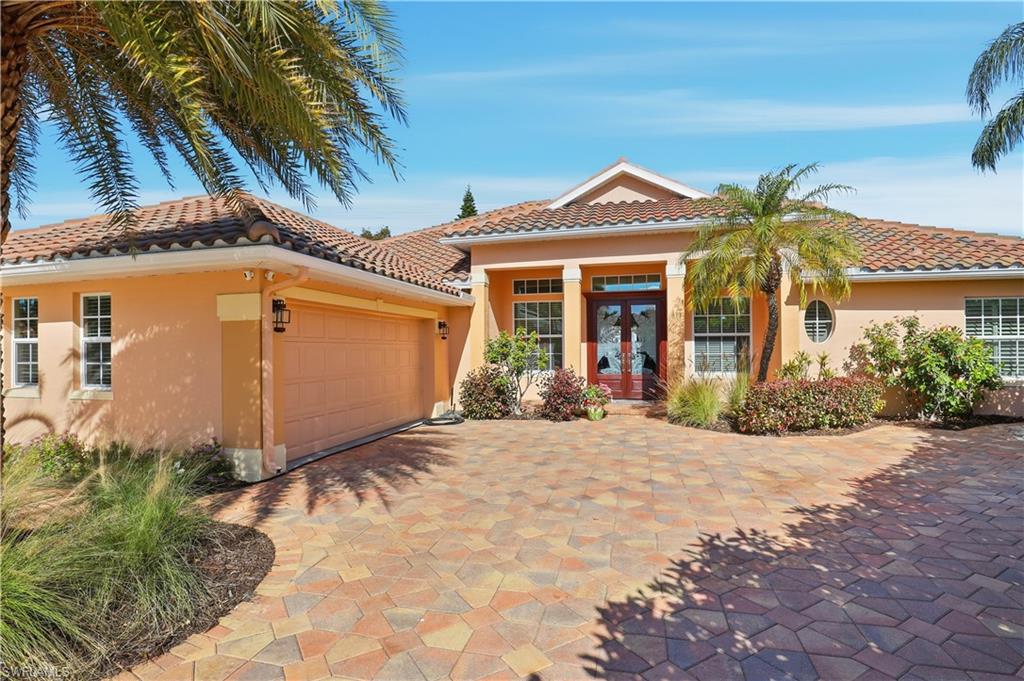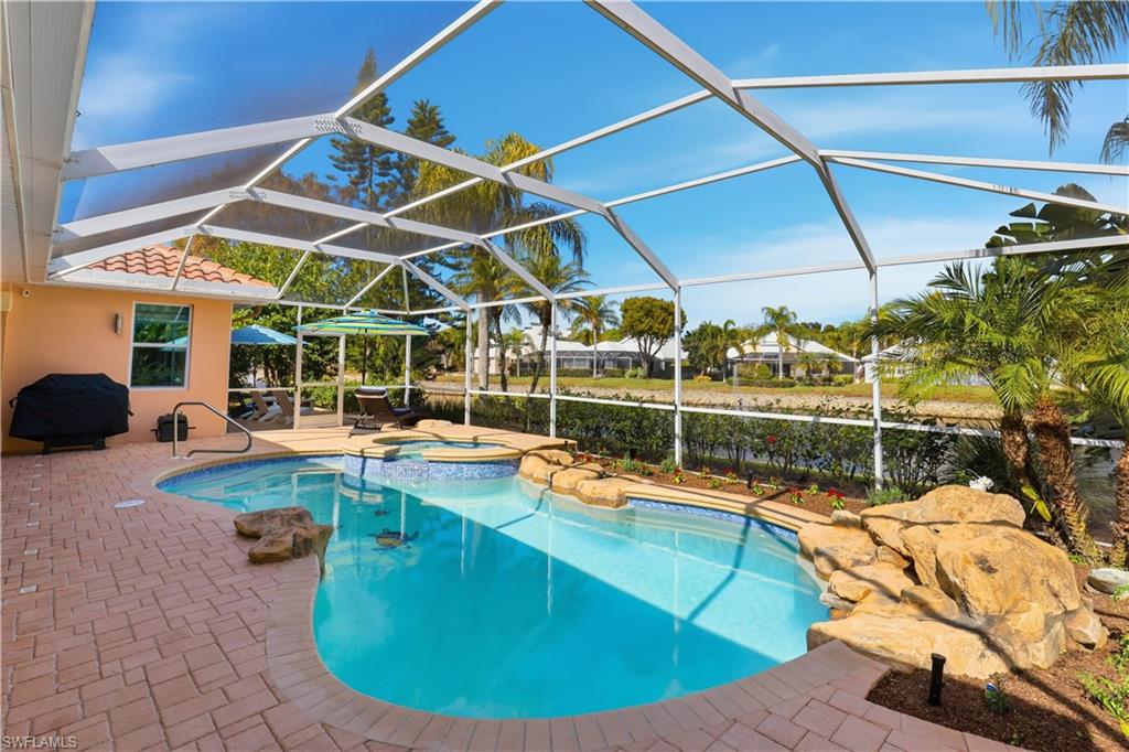 Rarely available waterfront estate home on one of the largest lots in Sterling Oaks. Enjoy expansive water and fountain views from extended paver patios designed for refined indoor-outdoor living. This beautifully updated residence offers three spacious bedrooms, three full baths, and a private den/office. The generous primary suite provides comfort and privacy, while open living areas flow seamlessly to the outdoor entertaining spaces. The remodeled kitchen features quartz countertops and updated cabinetry, complemented by tastefully renovated bathrooms. Tile flooring spans the main living areas, with luxury vinyl plank in the guest bedrooms. Step outside to your private backyard retreat — an oversized lot with sweeping lawn space, a beautiful pool and hot tub, and an expansive paver deck overlooking tranquil waterfront views. The setting offers both privacy and picturesque scenery rarely found in the community. Major improvements include impact windows and sliders, newer A/C and ductwork, newer water heater, and a 2019 roof for peace of mind. An oversized paver driveway accommodates up to five vehicles in addition to the two-car garage with finished floor. Also fresh exterior paint. Offered furnished, presenting a true move-in ready luxury opportunity in one of North Naples’ most desirable gated communities.
