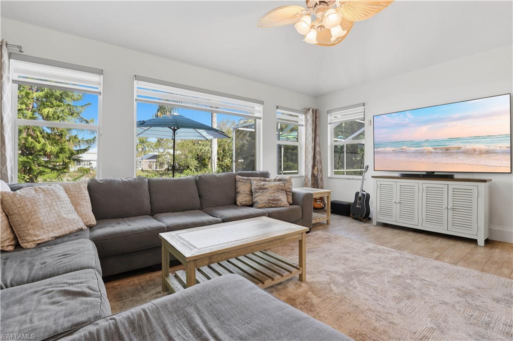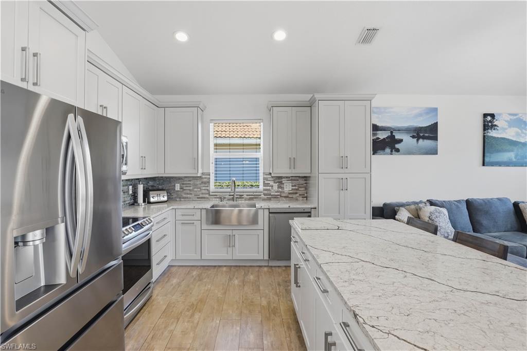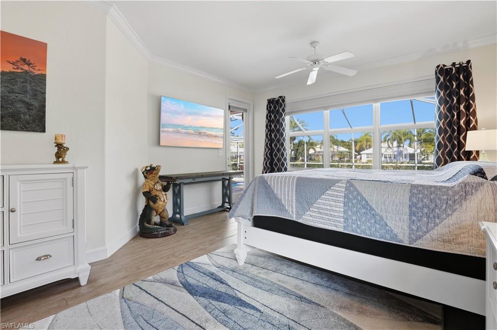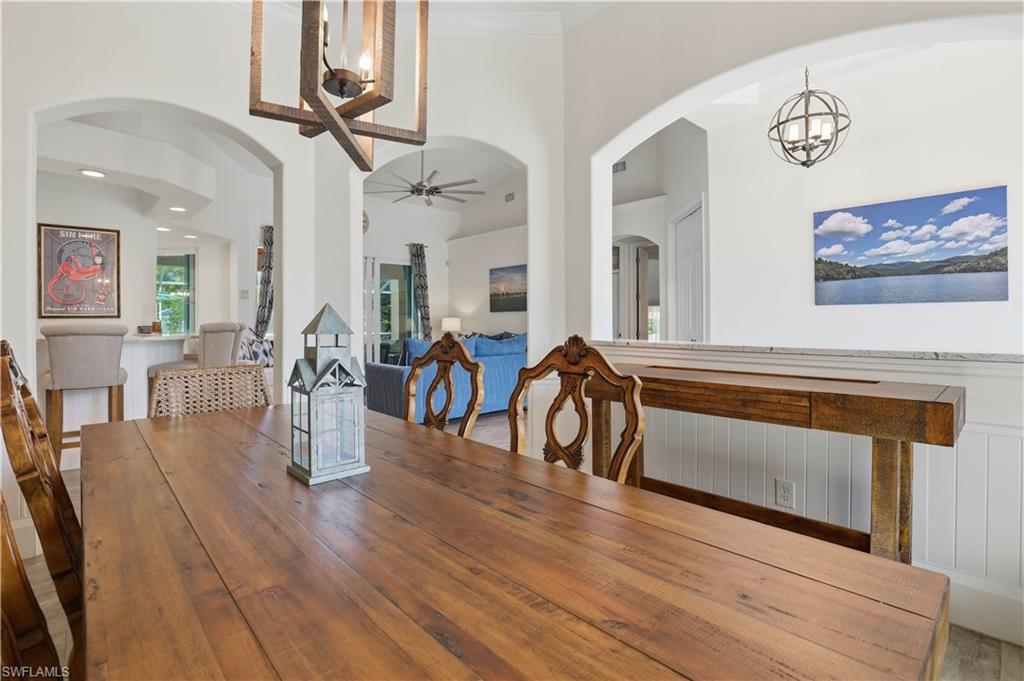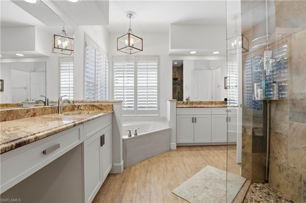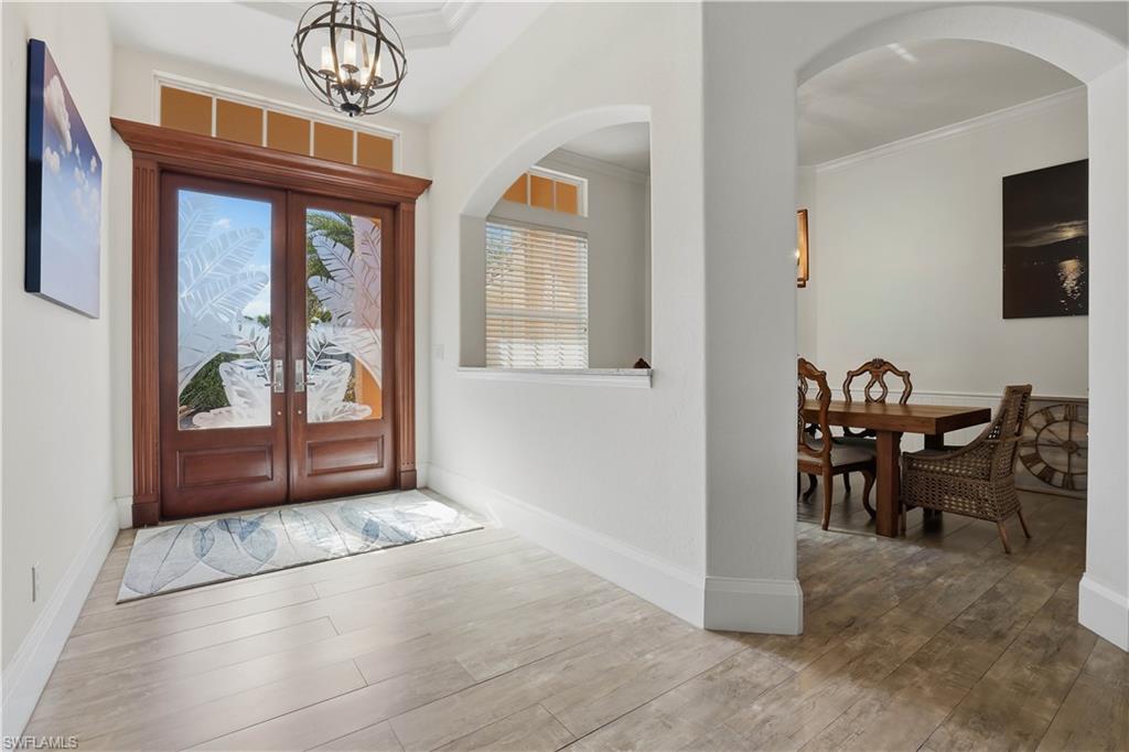 Rarely available waterfront estate home on one of the largest lots in Sterling Oaks. Enjoy expansive water and fountain views from extended paver patios designed for refined indoor-outdoor living. This beautifully updated residence offers three spacious bedrooms, three full baths, and a private den/office. The generous primary suite provides comfort and privacy, while open living areas flow seamlessly to the outdoor entertaining spaces. The remodeled kitchen features quartz countertops and updated cabinetry, complemented by tastefully renovated bathrooms. Tile flooring spans the main living areas, with luxury vinyl plank in the guest bedrooms. Step outside to your private backyard retreat — an oversized lot with sweeping lawn space, a beautiful pool and hot tub, and an expansive paver deck overlooking tranquil waterfront views. The setting offers both privacy and picturesque scenery rarely found in the community. Major improvements include impact windows and sliders, newer A/C and ductwork, newer water heater, and a 2019 roof for peace of mind. An oversized paver driveway accommodates up to five vehicles in addition to the two-car garage with finished floor. Also fresh exterior paint. Offered furnished, presenting a true move-in ready luxury opportunity in one of North Naples’ most desirable gated communities.