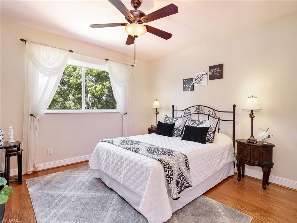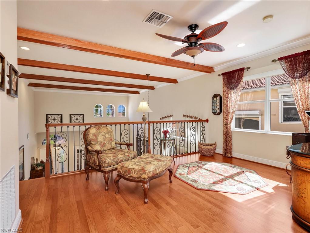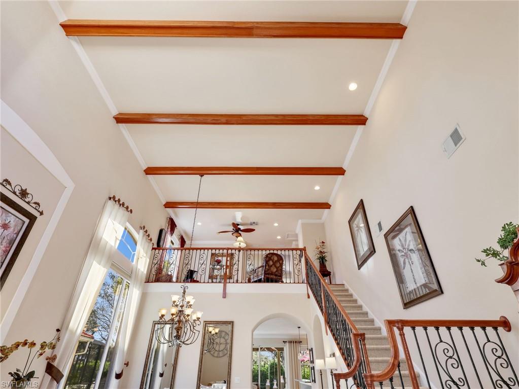 Welcome to this elegant and meticulously maintained three bedroom plus den, two and a half bathroom residence located in the sought after Belle Lago community. This Toll Brothers Marena floor plan offers 2,647 square feet of thoughtfully designed living space across two levels, combining comfort, style, and everyday livability. The first floor features a spacious primary suite, a private office or den, and inviting main living areas highlighted by soaring volume ceilings and oversized windows that fill the home with natural light. Plantation shutters and decorative ceiling beams add timeless character. Thoughtful upgrades include custom closet organization and overhead garage storage. The well appointed kitchen features newer stainless steel appliances and connects seamlessly to the main living spaces, ideal for both daily living and entertaining. Upstairs, two guest bedrooms, a full bathroom, and a versatile loft provide flexible space for a media room, home office, or additional living area. A dramatic iron staircase adds architectural interest and sophistication. Step outside to the expansive oversized screened lanai, offering a peaceful setting for entertaining or quiet relaxation. Electric hurricane shutters provide added functionality and peace of mind. Belle Lago is a natural gas community known for its active lifestyle, scenic beauty, and prime Estero location west of I 75. The home is situated in preferred Flood Zone X with no flood insurance required and no CDD. Residents enjoy resort style amenities including pickleball, tennis, bocce, a fitness center, clubhouse, pool, and walking paths surrounding tranquil lakes. A private golf cart path offers direct access to the neighboring Estero Country Club, where golf memberships are available with no waitlist. Move in ready and meticulously cared for, this exceptional home delivers luxury, value, and lifestyle in one of Estero’s most desirable communities. Schedule your private showing today.