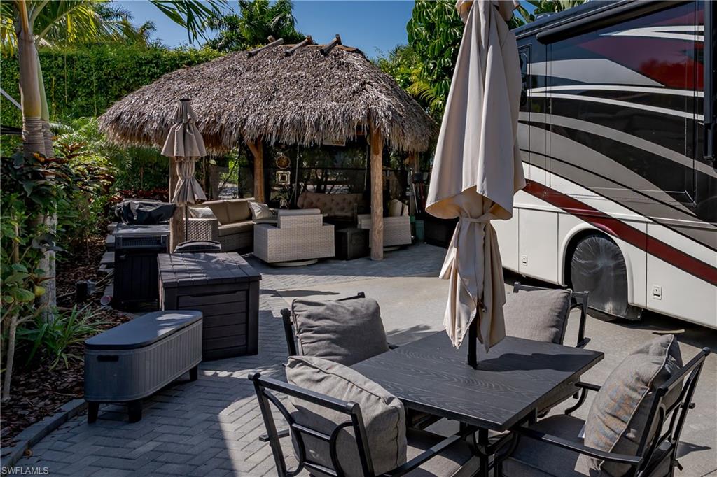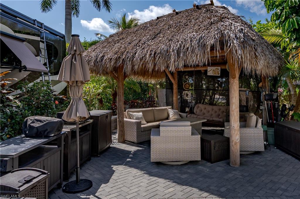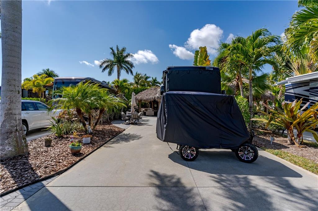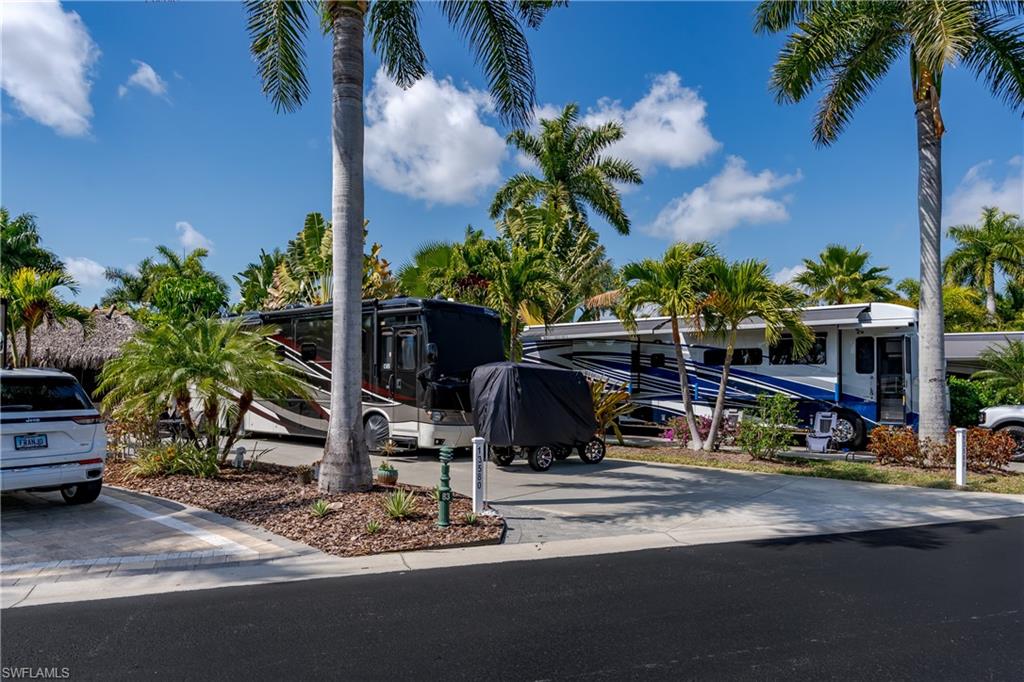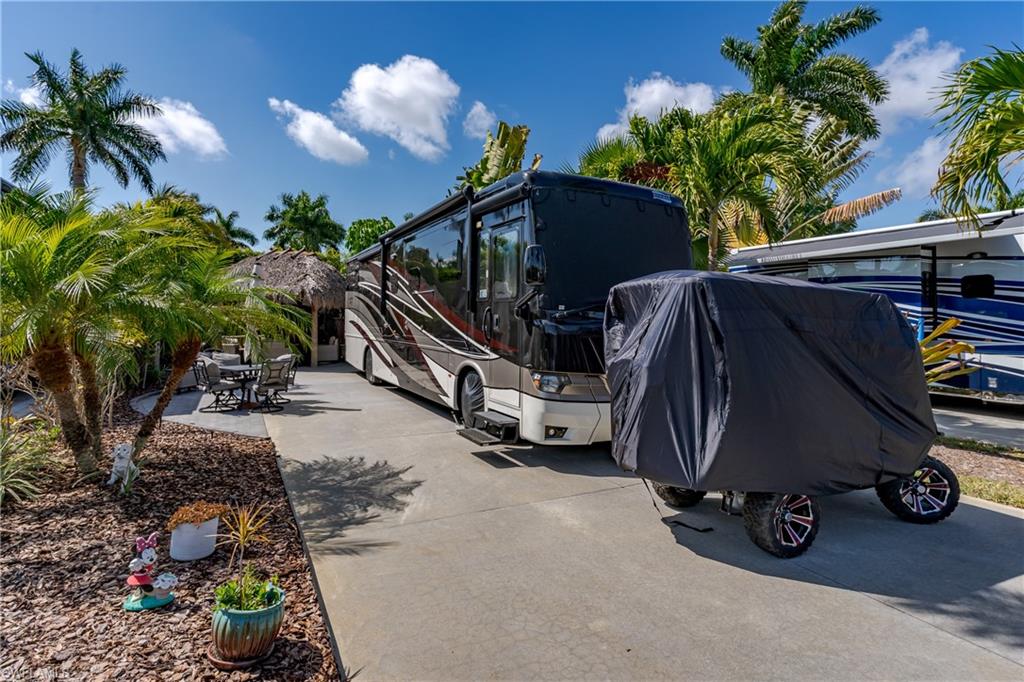 Lot 83 - Step through the gates of Naples Motorcoach Resort and be instantly transported to a tropical paradise, welcomed by manicured gardens, Royal Palm lined avenues, and elegant fountains leading to the grand clubhouse. Continue along picturesque, palm framed streets to arrive at your beautifully partially paved lot, enhanced by formal tropical landscaping and exceptional privacy. The property features a stunning tiki retreat perfect for relaxing or entertaining while enjoying tranquil breezes and illuminated palms at dusk. A privacy hedge creates a serene backyard oasis, ideal for outdoor dining, lounging, and future enhancements such as an additional water feature. Naples Motorcoach Resort is a premier Class A only community offering outstanding amenities, including an infinity pool, spa, fitness center, men’s and women’s saunas, catering kitchen, three pickleball courts, two additional satellite pools with spas, laundry facilities, and a dedicated dog park. Boating and nature enthusiasts will appreciate indirect Gulf access via the community boat ramp with kayaks available, providing easy access to Rookery Bay, nearby beaches, and waterfront dining. Investors take note: this deeded lot is mortgage-eligible and may be placed into the professionally managed rental program, making it an excellent opportunity for income or a 1031 exchange. Welcome to the lifestyle and magic of Naples Motorcoach Resort.