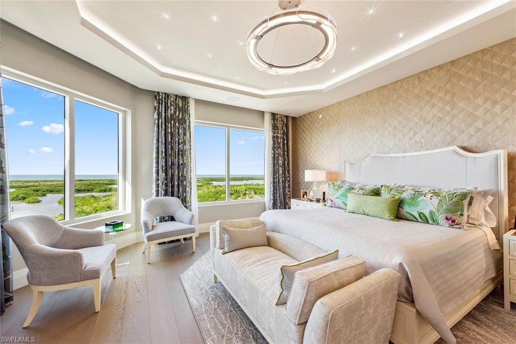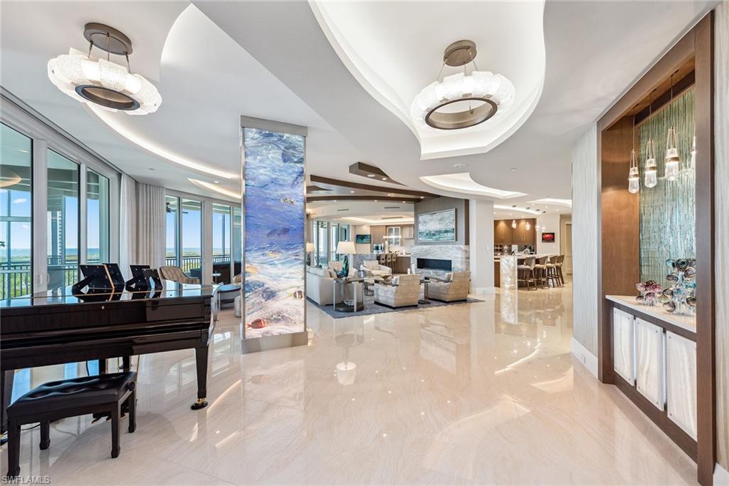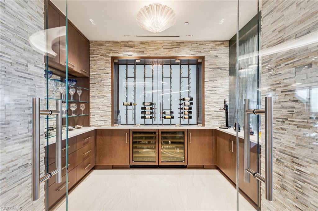 Majestically atop Aqua at Pelican Isle, this rarely available furnished penthouse is the epitome of sophisticated living. Go directly into this exquisite home boasting over 6,600 square feet under air and 9,453 square feet total. Enjoy luxurious living spaces with views of the Gulf to the west and Kinsale Golf Course views to the east. This penthouse offers indoor-to-outdoor entertaining spaces. The 1,315-square-foot entertaining outdoor terrace has an outdoor kitchen including an ice maker and beverage refrigerator, sitting area with heaters, grill (never used) and a million-dollar view, which cannot be overstated. No expense was spared in this custom home to bring the finest craftsmanship and unique one-of-a-kind features. This residence offers custom ceiling treatments, luxurious lighting, remote shades on all windows and doors, marble/wood flooring, an enclosed, temperature-controlled wine room, humidor and quartz countertops with custom light features. The open concept grand salon blends seamlessly with the gourmet kitchen with top-of-the-line appliances, two dishwashers, sleek custom quartz countertops and a large entertaining island/sitting area. A separate custom bar area with an icemaker, sink, refrigerator and beautifully designed cabinetry creates the epitome of entertaining. A separate glass-enclosed family room and spacious formal dining area complete these well-thought-out areas. There are three guest e-suite rooms, each unique with countless features. The primary suite has two separate built-out closets, stunning views of the gulf, a large bath with dual sinks and a spacious shower plus a soaking tub. Two of the guest suites are used as offices but can instantly be returned to bedrooms with little or no additional work. Hurricane shutters on all outdoor terraces provide peace of mind protection. An enclosed oversized two-car garage comes with this residence plus additional storage space in garage as well as in the service hall of the residence. Aqua is amenity-rich with 24-hour security, kayaks, two social rooms, golf simulator, outdoor putting green, two dog parks, fitness and theater, just to name a few. This home was meticulously designed and completed in 2023 by Collins and Dupont with the purpose to wow you! Seller is offering membership to the Pelican Isle Yacht Club (next door). This membership includes shuttle to the beach, restaurant, pool, tennis, pickleball and bocce. A 55-foot boat slip in the Aqua Marina (only five minutes out to the Gulf) is available.
