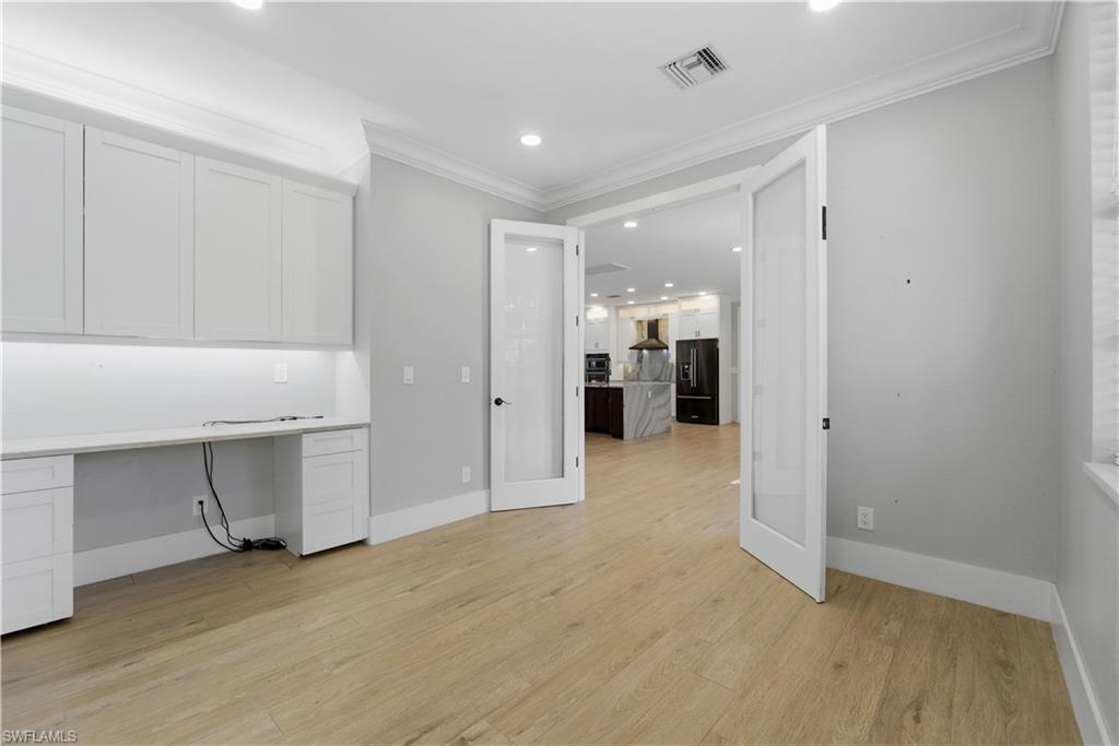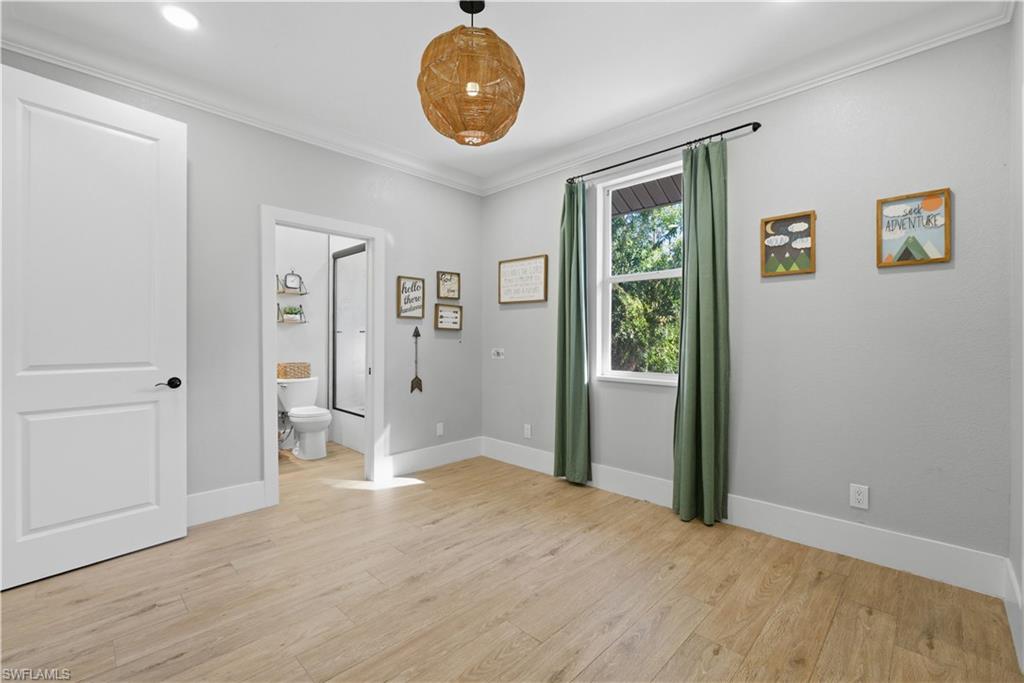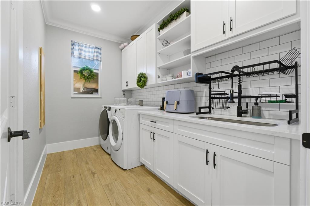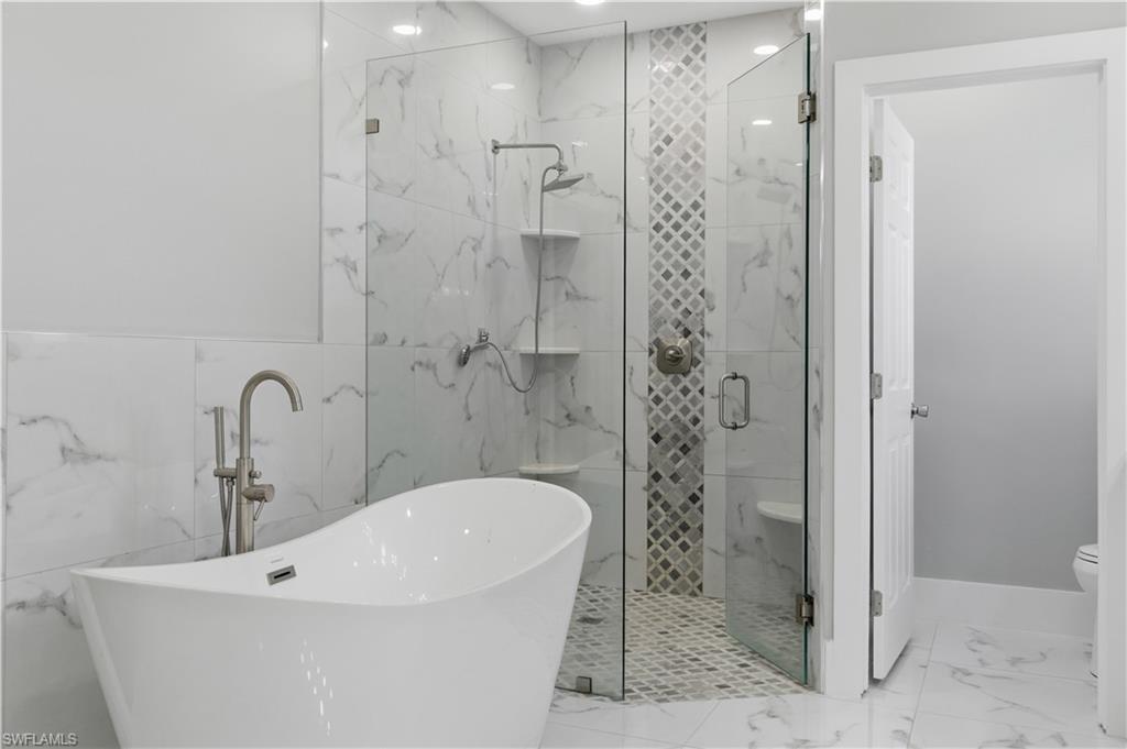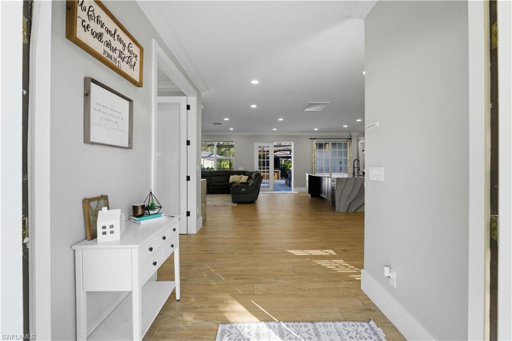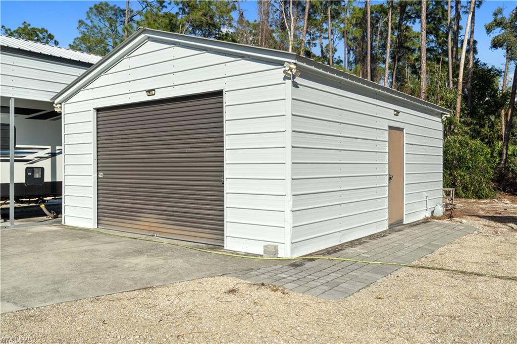 Stunningly renovated home in sought after San Carlos Estates a fully upland lot with NO flood insurance and NO HOA. With a WHOLE HOME GENERATOR 500lb Propane Tank. Property includes two metal open buildings one 40x16 for an RV, a 50 Amp Service, a 35x30 for Boat or toys plus an additional 20x25 metal garage/workshop ideal for storage, hobbies, or business use. Enjoy a brand-new heated modern pool with sundeck and a custom outdoor entertainment area featuring a luxury outdoor kitchen with HyGrill, Awoco hood, beverage center, Kraus sink, solid-surface waterfall island, and 100” outdoor TV. Contemporary finishes include wood slat acoustic panels, 3D decorative wall features, and a finished wood slat ceiling. Home also offers a whole home reverse osmosis system and the LUXURY kitchen offers KitchenAid Black Stainless Steel appliances with PrintShield™ finish, built-in French door refrigerator with ice maker, combination microwave/oven, statement hood, and a stunning quartzite waterfall island that continues to a matching beverage center bar in the living area. The primary bath features a freestanding soaking tub, a beautifully appointed walk-in shower, and a huge double vanity. Conveniently located near beaches, dining, and shopping literally around the corner. This property offers rare flexibility, modern design, and exceptional outdoor living space, this home will not last it is beautiful, functional a rare find.