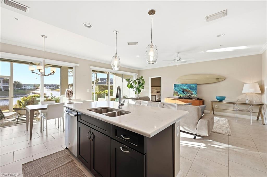 Enjoy breathtaking lake views from this ground-floor residence, offering what is truly one of the best views in the community. Designed with a contemporary aesthetic and thoughtful upgrades throughout, this home combines style, comfort, and functionality in every detail. The spacious floor plan features a generous primary suite with an oversized walk-in custom closet, a large guest bedroom with ample closet space, and a well-appointed family bath with tub and shower. An abundance of storage is found throughout the home, including a fully upgraded laundry room with custom cabinetry, and an enhanced garage complete with built-in cabinets and high-gloss epoxy flooring. The gourmet kitchen is a standout, showcasing custom cabinetry with slide out drawers, quartz countertops, stainless steel appliances, and a large center island—perfect for entertaining. The oversized lanai is ideal for relaxing while enjoying serene lake views, enhanced by top-of-the-line Hunter Douglas sun and privacy shades. Professionally tracked blackout blinds in the main living and dining areas provide both comfort and convenience. Additional highlights include hurricane-impact windows and doors, premium window treatments throughout, and meticulous attention to detail that elevates this home above the rest. Located in Avalon of Naples, a boutique gated community of just 152 coach homes, this property is perfectly positioned at Davis Blvd and County Barn Road—only 5 miles from downtown Olde Naples, the Naples Pier, and the beach. Situated high and dry in a non-flood zone, this is an exceptional opportunity to own a beautifully upgraded home in one of Naples’ most desirable locations. This one won’t last—schedule your showing today.