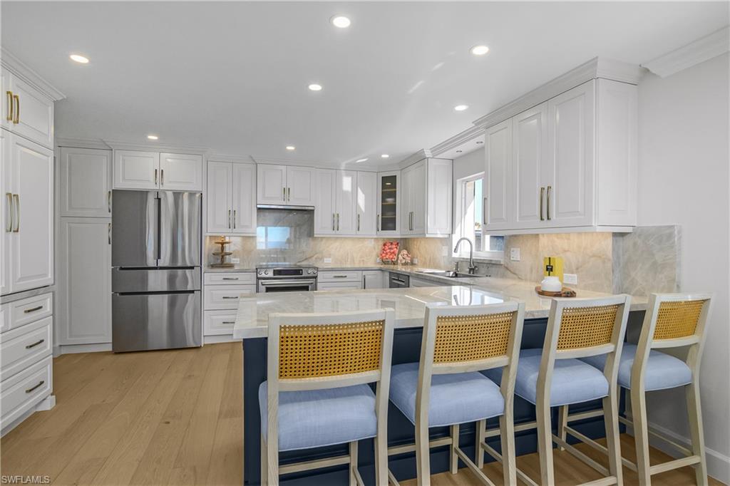 This is the one you have been waiting for! Quick close and Move in ready. Enjoy the Direct Western Gulf Views on the Naples Miracle mile, from this Fully Renovated, 3 bedroom with 2 1/2 baths, Southern exposure, End-Unit Residence in The Embassy Club – Luxury Coastal Living at Its Finest. Experience breathtaking, unobstructed western panoramas of the Gulf of Mexico and spectacular year-round sunsets. This impeccably renovated 1st floor(2nd level) is in the highly desirable and well managed Embassy Club. This spectacular condo is next door to the new Rosewood Residences, same sunset view, same beach but Millions of dollars less. The meticulous attention to detail and premium finishes define this exceptional beachfront residence. Key Features & Upgrades: Designer Renovation — Completely remodeled from floor to ceiling with high-end selections throughout. Gourmet Kitchen — Spacious, open-concept kitchen featuring custom cabinetry, pull out drawers, abundant counter space, and top-of-the-line stainless appliances — perfect for both everyday living and entertaining. Luxury Flooring & Finishes — Elegant wood flooring, solid wood doors, plantation shutters, and fresh designer paint create a refined coastal aesthetic. Sophisticated Baths — All three bathrooms have been thoughtfully updated with modern fixtures, custom vanities, and premium tilework. Comfort and Convenience-Sip morning coffee on your private east-facing balcony with sunrise views, then relax for sunsets on your glass-enclosed western lanai with impact sliding glass doors and the soothing sound of the waves just steps away. Enjoy a Secure, climate-controlled lobby, under-building parking with extra storage, and elevator access. The Embassy Club – A Premier Beachfront Address, walking distance to Laudermilk park and to the newly finished Four Seasons hotel. Nestled on the quiet south side of Doctor’s Pass, The Embassy Club offers an intimate, low-density setting with only 36 residences. Residents enjoy: Expansive beachfront pool and sundeck Tranquil tropical landscaping Private access to pristine Gulf shoreline Proximity to Olde Naples Historic District, world-class shopping, fine dining and cultural amenities This thoughtfully updated residence presents the quintessential Naples lifestyle — refined, relaxed, and directly on the Gulf. Don’t miss the opportunity to make this extraordinary property your own.
