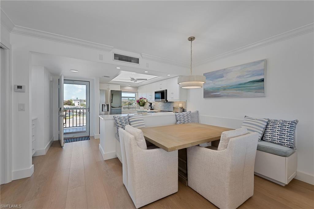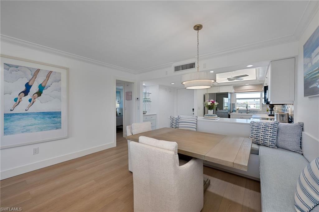 Welcome to your new home at High Point Country Club. Casual elegance best describes this upgraded, move-in-ready 2 bed, 2 bath, 4th floor condo with beautiful golf course and lake views. A great entertaining space with custom built-in banquette with Sunbrella cushions from Boca Bargoons, Alison Craig leather sectional with Serena & Lilly and Theodore Alexander furnishings, complete this turnkey home. Beautifully appointed with gorgeous new floors, new water heater, ceiling fans, window treatments and appliances. Immediate 9-hole golf membership for two, six pools, clubhouse, restaurant, fitness room, pickleball, tennis and many social activities, plus 1 carport, with plenty of guest parking. This is not a 55+ bldg and owners can rent right away! Nestled off the beaten path with easy access to all Naples has to offer! Just 1.8 miles to the beach, 1.2 miles to Venetian Village, 3 miles to 5th Ave and 1.0 mile to Publix. Make a point to see this beautiful unit!