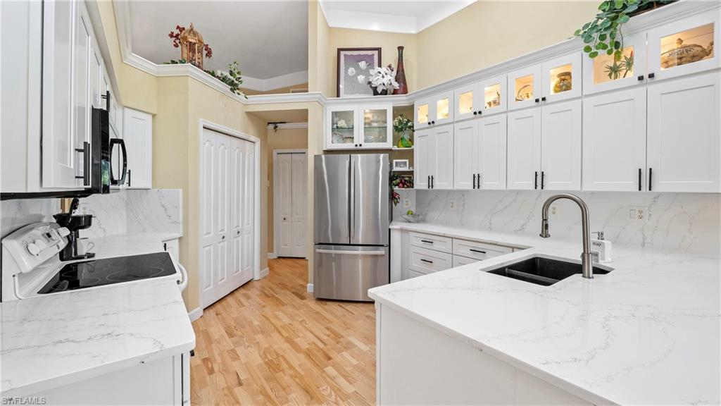 Prepare to fall in love! If you’ve been waiting for something special in North Naples, something that doesn’t feel cookie-cutter, this is it. Located in Heritage Greens, the Canterbury’s signature angled walls create architectural character you simply don’t see every day. From the moment you step through the grand entry, this home feels expansive, light-filled, and unforgettable. Designed with a spacious split-bedroom floor plan, this 3-bedroom, 2-bath residence offers over 2,000 square feet under air with rooms that feel even larger thanks to soaring ceilings and walls of windows pouring in natural Florida sunshine. At the heart of the home, a beautifully renovated kitchen that anchors the space. It's open, elegant, and perfectly positioned for entertaining. Whether you’re hosting family holidays or casual evenings with friends, the flow between the living and dining areas makes every gathering effortless. Then step outside…Your oversized lanai and brick paver patio overlook the shimmering lake and the lush greens of Hole #10 at Arrowhead Golf Course. Morning coffee with tranquil water views. Golden hour sunsets reflecting off the fairway. Peace, privacy, and picture-perfect scenery every single day is waiting for you here. And the upgrades? Already done for you - water pipes for whole house (2023), roof (2019), AC (2025), water heater (2022), kitchen (2025) and flooring (2025). Plus, this home is located in desirable Flood Zone X (a huge insurance advantage in SW Florida) This is the kind of home buyers wait for and then regret missing. Located in highly desirable North Naples, you’re minutes from A-rated schools, dining, shopping, medical facilities, parks, and the stunning Gulf of America beaches. Easy access to major airports and even a convenient drive across to Florida’s East Coast. The setting feels like a private retreat yet you’re close to everything, including the communty pool and golf club restaurant. Homes with views, upgrades, location, and character like this rarely sit long. If it feels too good to be true… it’s not. But it won’t last. Schedule your private showing before someone else claims your view.