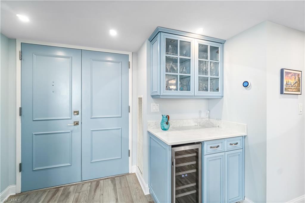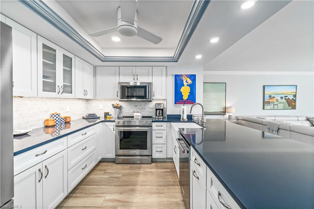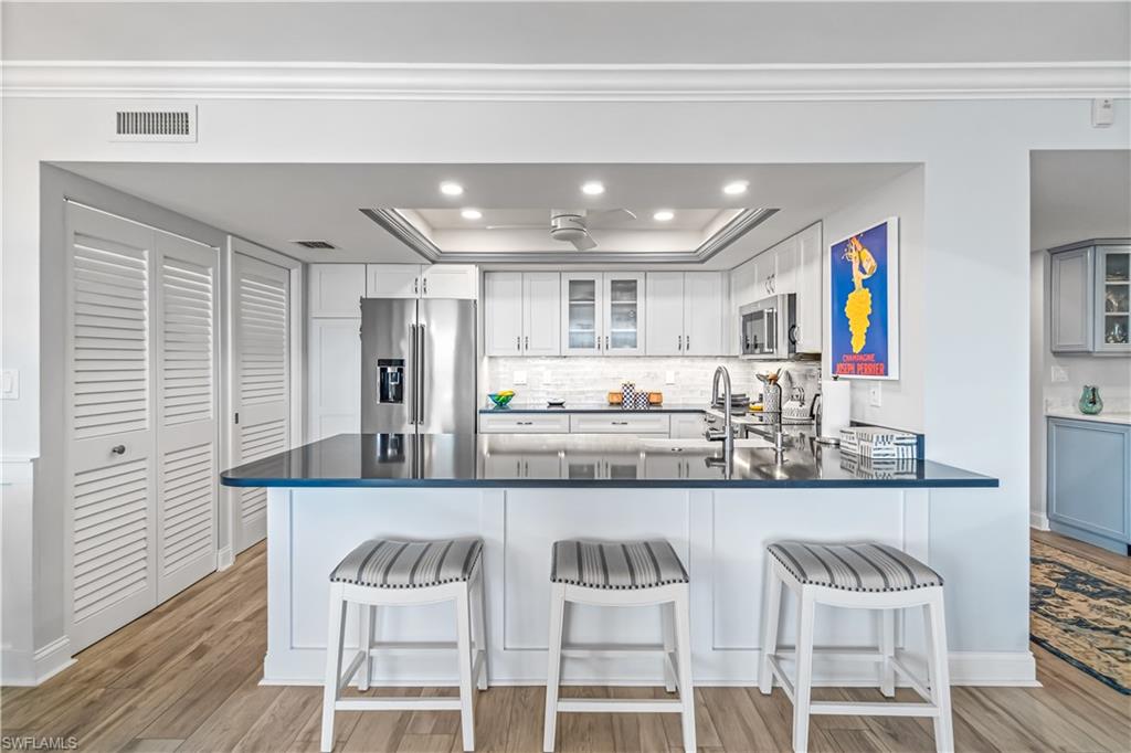 Positioned on the 7th floor of the esteemed Lausanne in The Moorings, this beautifully finished residence blends elegance, comfort, and coastal sophistication with stunning views of the Gulf, Moorings Bay and city skyline. This recently renovated 2-bedroom, 2.5 bath sanctuary offers over 1,500 square feet of thoughtfully designed living space, highlighted by a spacious open balcony where you can enjoy refreshing Gulf breezes. Every detail radiates warmth, from the refined custom finishes to the open concept layout that seamlessly connects the kitchen, great room, and dining area, creating an inviting setting for both relaxation and entertaining. The spacious primary suite is an oasis of tranquility with a generous walk-in closet while additional features include a bar with wine refrigerator, KitchenAid appliances, and in-residence laundry. Two deeded under-building parking spaces add convenience and value. Lausanne is a premier high-rise community on the largest beachfront parcel in The Moorings, offering a tropical pool oasis with a resort-style swimming pool, shaded pergola lounges, and a cozy fire pit. Residents also enjoy a fitness center, social room with full kitchen, game room, bike storage, library, and grill areas. Perfectly positioned just a short stroll to Venetian Village and moments from the best of Naples including Fifth Avenue South, Third Street South, Waterside Shops, and Mercato, this residence offers an exceptional lifestyle defined by beauty, comfort, and the very best of Naples beachfront living.