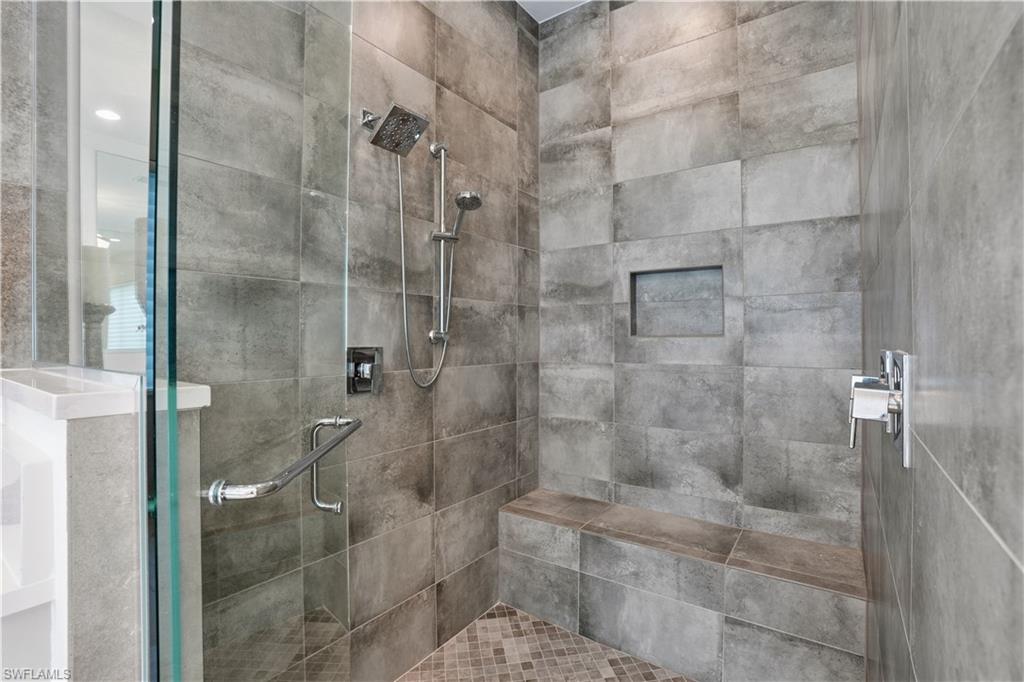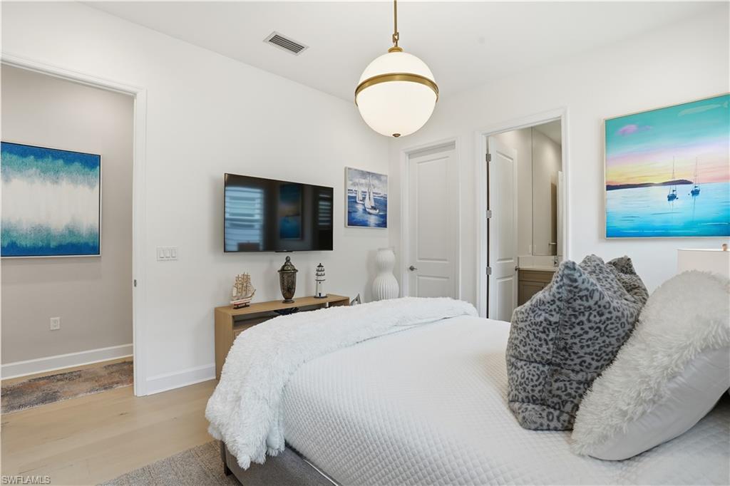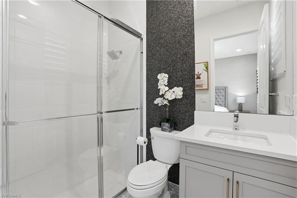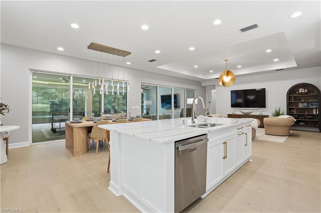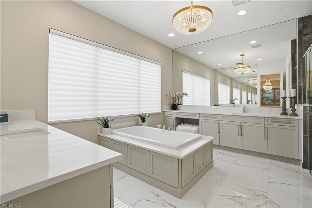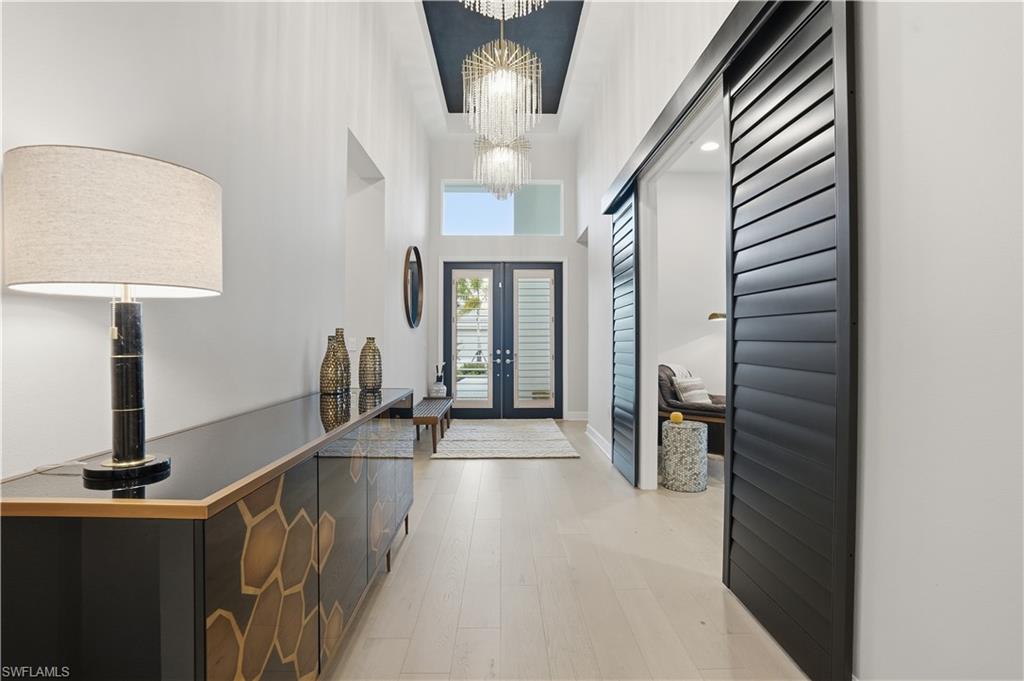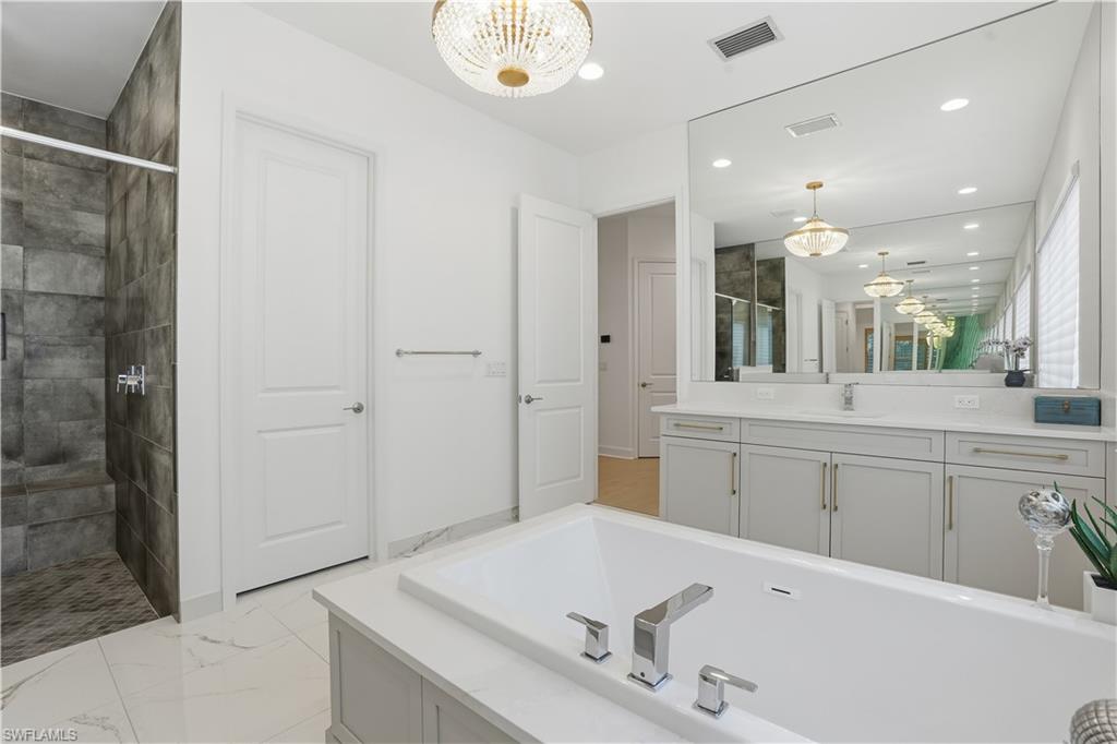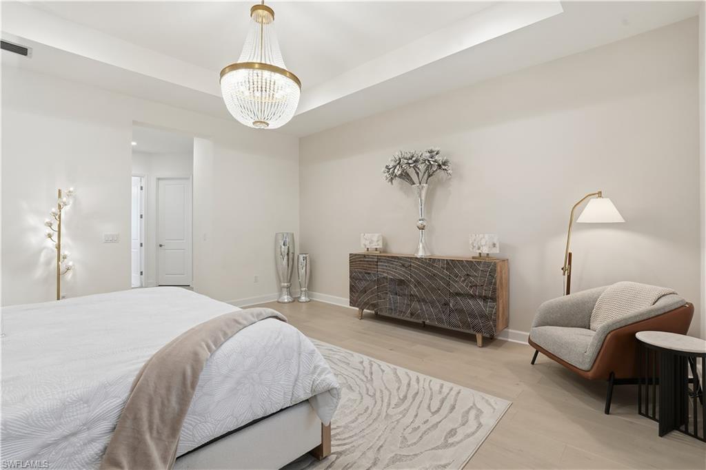 Welcome to this extensively upgraded Captiva model in Valencia Trails offering 4 bedrooms plus a club room, 4 full baths, and approximately 3,176 sqft, with a 3-car garage and an extended screened lanai. Designed for both elevated everyday living and seamless entertaining, a spacious great room with coffered ceiling and thoughtfully designed gourmet kitchen opens to the main living spaces. The kitchen features upgraded cabinetry, quartz countertops and backsplash, under-cabinet lighting, and GE Profile stainless steel appliance package, including wall oven, microwave, and chimney-style hood. The primary suite offers dual walk-in closets and a luxurious bath with dual sinks, separate tub and walk-in shower. Each additional bedroom is generously sized with access to its own full bath and upgraded with frameless shower enclosures, offering comfort and privacy for guests, while the dedicated club room provides flexibility for a media room or home office. This home reflects a significant investment in both visible design and behind-the-scenes upgrades. Engineered light oak hardwood flooring extends throughout the main living areas and bedrooms, enhanced lighting, and elevated finishes throughout the kitchen and baths. The cohesive design palette creates a sophisticated, move-in-ready aesthetic that reflects intentional investment and attention to detail. The HVAC system was upgraded to Carrier Infinity Series that is beyond builder standard specifications for enhanced efficiency and long-term performance. Additional mechanical and structural enhancements include impact glass throughout, tankless hot water heater, whole-house electrical upgrades, recessed LED lighting, and upgraded lighting fixtures. The outdoor living experience is exceptional and represents a significant upgrades. The custom pool and spa includes an enlarged footprint, a raised negative-edge spa, therapy jets, upgraded pump systems, saltwater chlorination, auto-fill, 400,000 BTU gas heater, and multiple colored LED lighting features throughout the pool, spa, and sun shelf. A fully equipped custom outdoor kitchen with built-in gas grill, refrigeration drawers, granite countertops, and ample prep space rounds out the space for true year-round living. Select furnishings will be negotiable pursuant to a detailed inclusion and exclusion list, providing flexibility for buyers seeking a turnkey opportunity. Living in Valencia Trails means embracing one of Naples’ premier 55+ resort communities. Residents enjoy a spectacular clubhouse with restaurant and bar, resort-style pool with cabanas, state-of-the-art fitness center, tennis and pickleball courts, bocce, card rooms, social clubs, walking paths, and a vibrant calendar of events that fosters connection and active living. The gated setting offers privacy and security while remaining conveniently located near Naples’ beaches, dining, shopping, and cultural amenities.