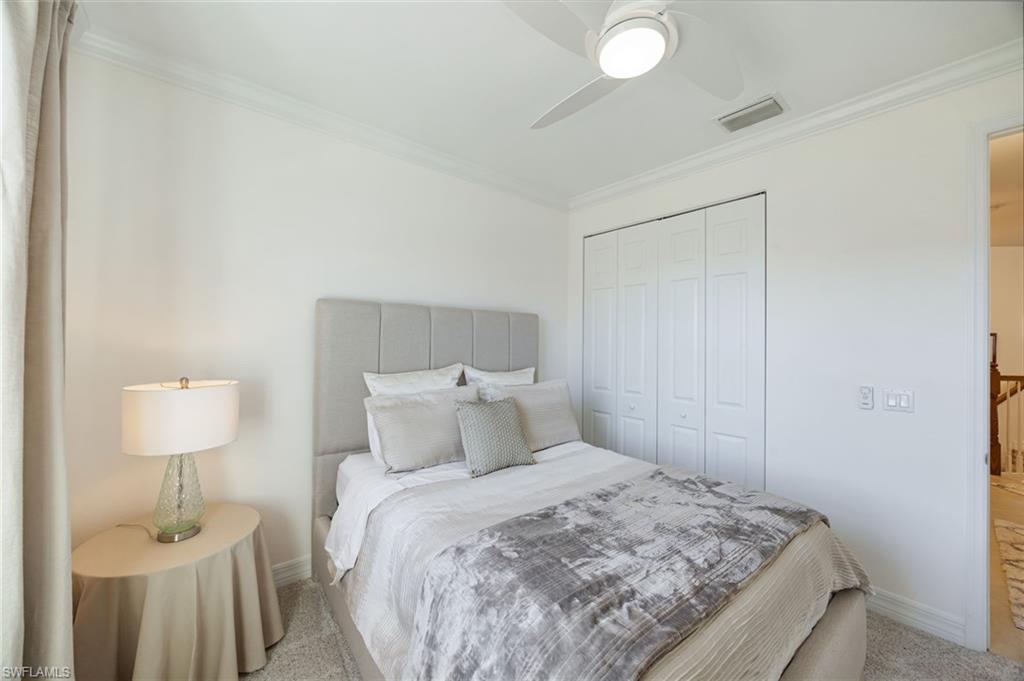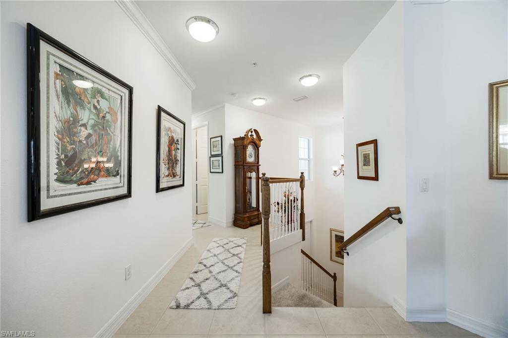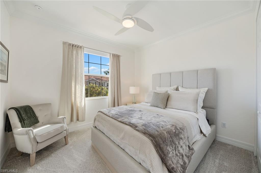 AMAZING VALUE!! Located in the highly sought-after, gated community of Marbella Lakes in the heart of Naples, this rarely available second floor “Napoli” coach home represents one of the most compelling values in the neighborhood, offering peaceful privacy with no road noise and an abundance of natural light throughout. Perfectly positioned within the community, this spacious and meticulously maintained 3-bedroom plus den, 2.5-bath residence with a private two-car garage truly lives like a single-family home and is available with a negotiable furnishings package for immediate enjoyment. Freshly painted in a crisp, contemporary palette, the kitchen showcases expansive shaker styled wood cabinetry, granite countertops, a large pantry, and a newer LG appliance package includes a refrigerator, electric oven, microwave, and dishwasher. The thoughtful floor plan offers multiple dining options with a breakfast bar, eat-in nook, formal dining space, and an expansive screened lanai ideal for indoor-outdoor entertaining. Premium crown molding, custom draperies and blinds, designer lighting, and dual custom walk-in closets in the luxurious primary suite elevate the residence, while the split-bedroom design provides exceptional privacy for guests away from the main living areas. Numerous significant updates include a newly replaced HVAC system (3/2025) and hot water heater (11/2025), ensuring peace of mind and long-term value. The large screened lanai captures tranquil lake and lush landscaped views, creating a serene outdoor retreat rarely found in coach home living. Residents enjoy access to an impressive 8,000-square-foot clubhouse featuring a resort-style pool and spa, indoor sports complex with basketball, tennis and pickleball courts, state-of-the-art fitness center, game room, splash pad, playground, social room, and 24-hour manned gate security, along with a full calendar of social activities that foster a vibrant and welcoming lifestyle. Built by GL Homes and known for quality construction and strong community design, Marbella Lakes offers unmatched convenience just minutes to the beach, Waterside Shops, Mercato, easy access to I-75, premier dining destinations, and the charm of Olde Naples. Impeccably maintained and absolutely in mint condition, this residence delivers luxury, location, lifestyle, and value in one exceptional offering.