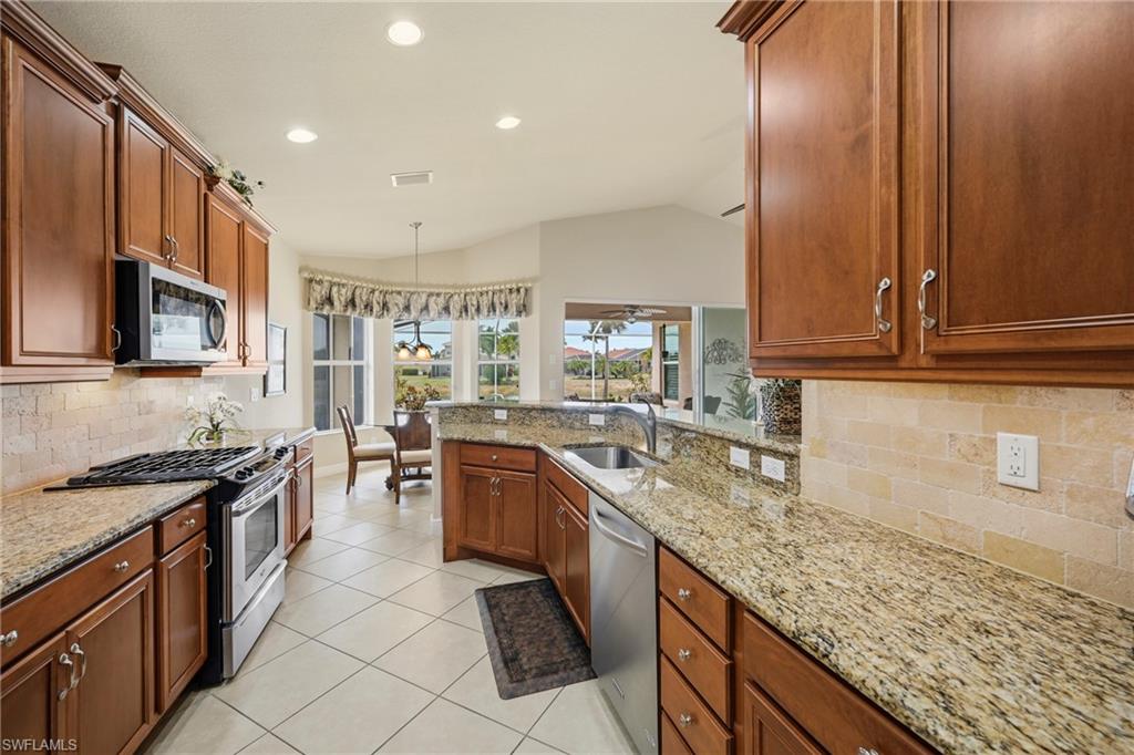 Welcome to one of the most sought after floor plans in The Reserve at Estero — the Toll Brothers Brevia model offering nearly 2,000 square feet of bright, open living space with 2 bedrooms, a den with Murphy bed, 2 baths, and a 2 car garage. Volume and tray ceilings, crown molding, plantation shutters, and tile throughout the main living areas give the home a clean, elevated feel. The great room layout flows easily into the dining space and breakfast area, creating a floor plan that simply makes sense for everyday living and entertaining. The kitchen delivers with granite countertops, solid wood cabinetry, stainless steel appliances, a gas cooktop, and classic tile backsplash — all open to the main living space so you are never cut off from the action. The primary suite is oversized and private with tray ceiling detail, a sitting area, walk in closets, and a spacious bath featuring dual sinks, a large walk in shower, and a garden tub. And then there’s the Western exposure — because in Southwest Florida, sunsets matter. The panoramic screened lanai overlooks the lake, giving you glowing afternoon light, peaceful water views, and the kind of backyard that makes you linger a little longer. Located in Flood Zone X, so flood insurance is not required. Residents of this natural gas, guard gated community enjoy a clubhouse, resort style pool and spa, fitness center, tennis, pickleball, basketball, and playground. Just minutes from Coconut Point Mall, Miromar Outlets, Florida Gulf Coast University, Southwest Florida International Airport, dining, and Gulf beaches, this location blends convenience with the privacy of a gated community.