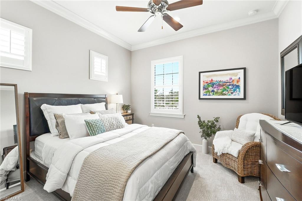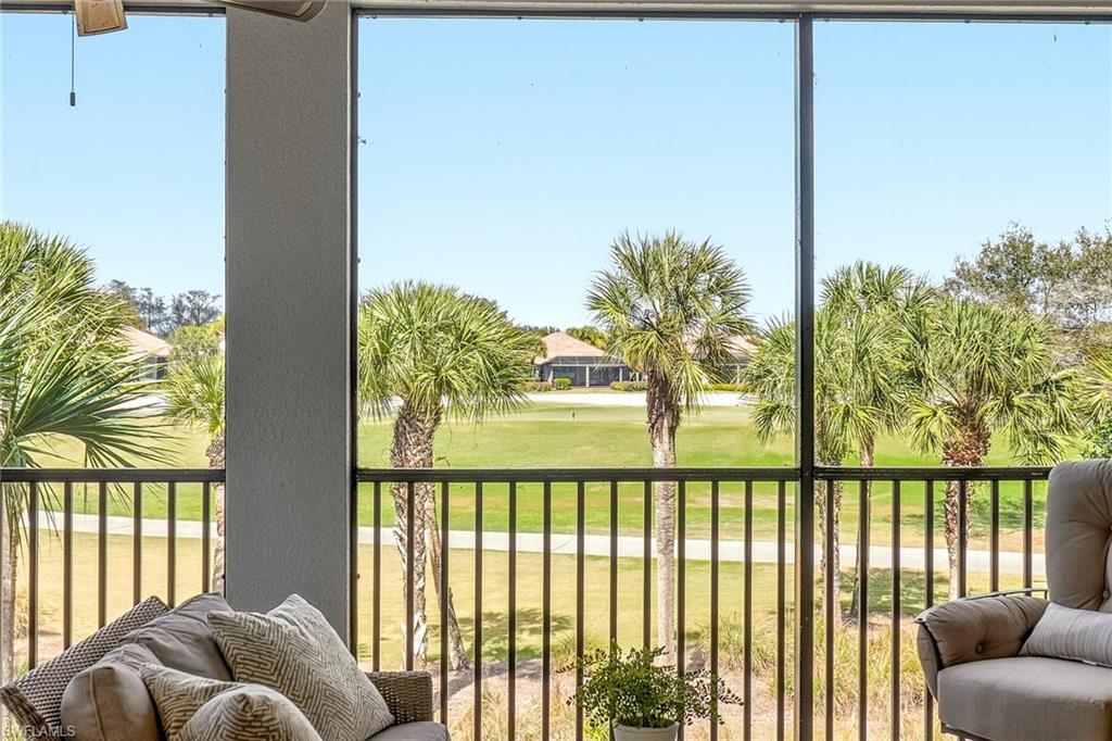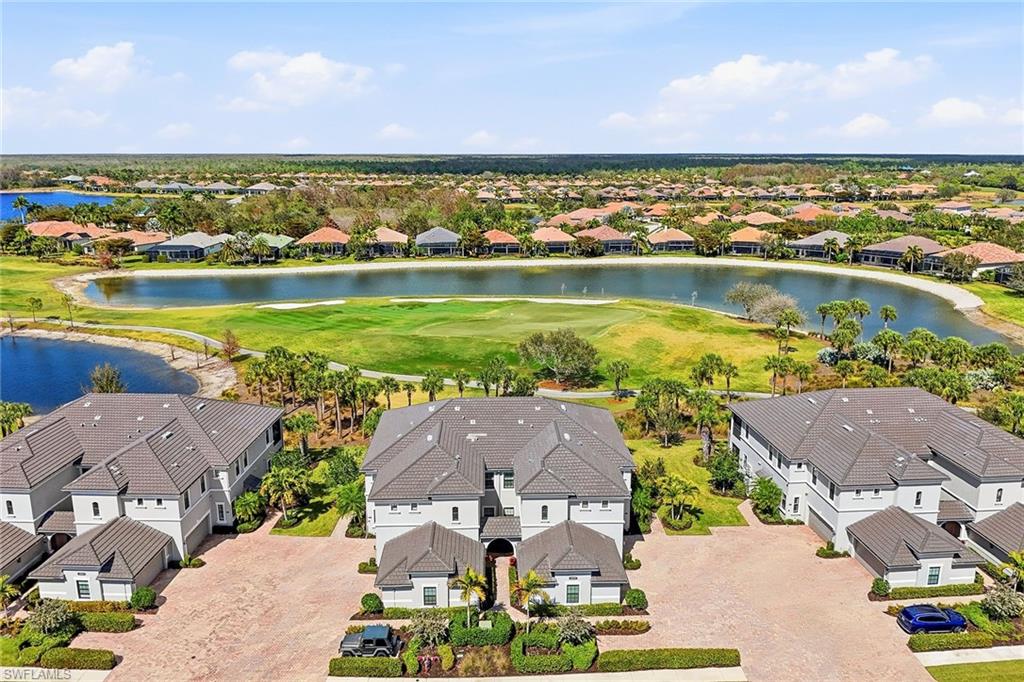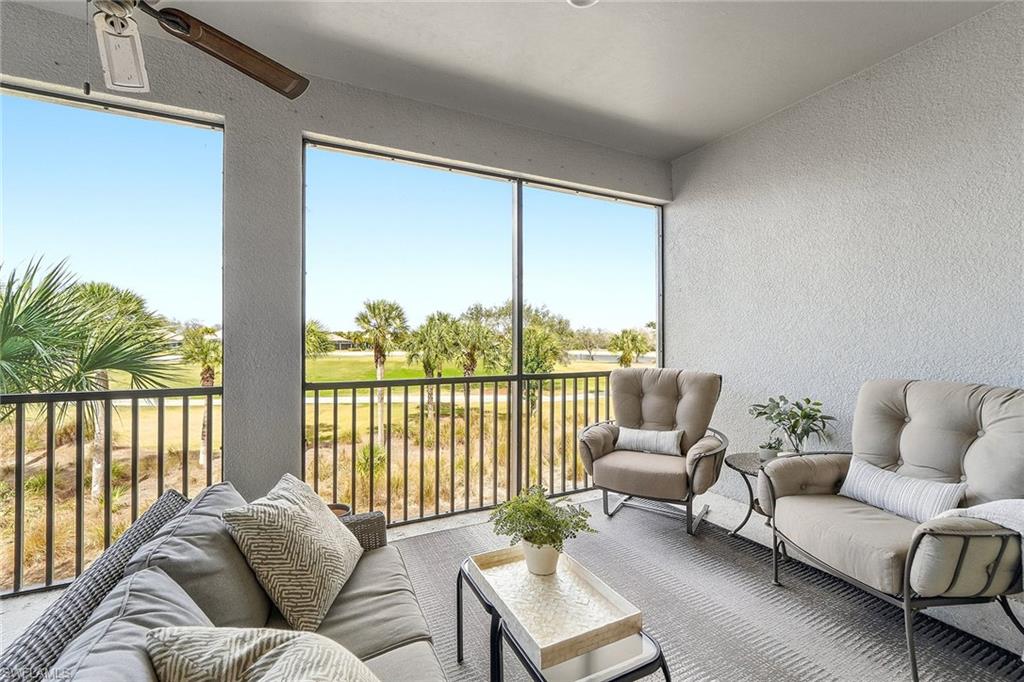 Full golf membership included for two championship courses. In gated golf community of TwinEagles, this second-floor condominium offers 2,291 square feet of living area plus a lanai area with lake and golf course views. The open floor plan is enhanced by soaring volume ceilings, creating a light-filled interior. The kitchen includes custom upgrades combining function with design. Neutral builder selections provide a versatile foundation for personalization. The residence includes three bedrooms, a den, two full baths and one half bath. Tile flooring is featured in the main living areas, with new carpet in the bedrooms. The kitchen is appointed with shaker-style cabinetry, quartz countertops and GE electric appliances. The open layout connects the kitchen to the dining and living areas, designed to maximize natural light and views. The primary suite includes dual vanities, a soaking tub and a separate shower. Plantation shutters are installed throughout the residence. A large screened lanai provides covered outdoor living space overlooking the lake and fairway. Additional features include a two-car attached garage, with new coating on the garage floor. TwinEagles offers two championship golf courses and a private club lifestyle, bocce ball, Himalayan course, pickleball, tennis courts, fitness center all in North Naples, with convenient access to shopping, dining and Gulf beaches.