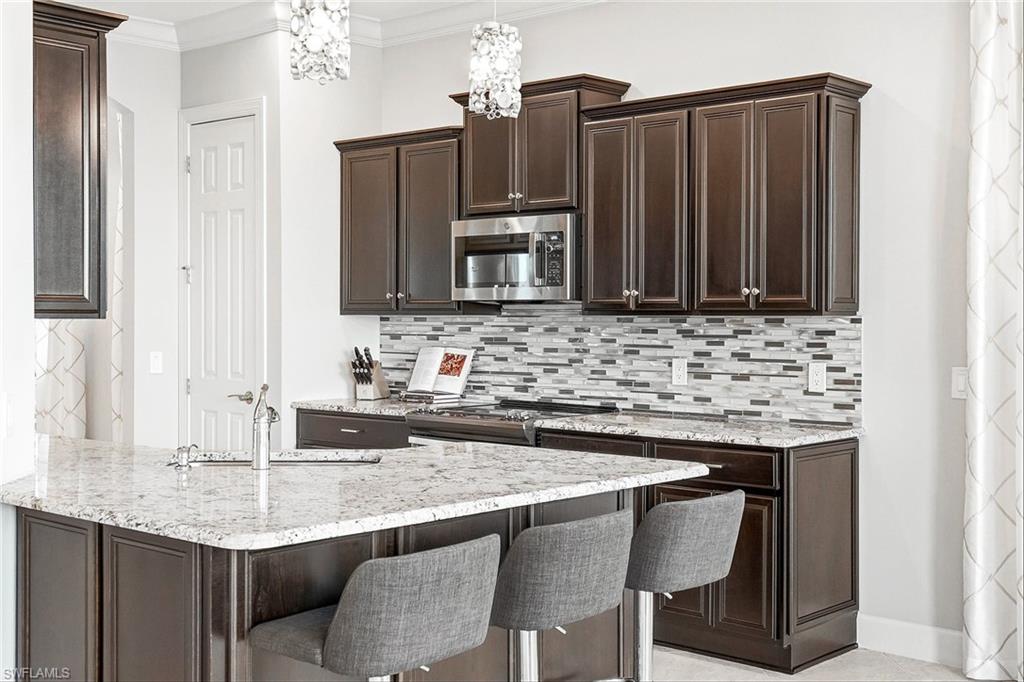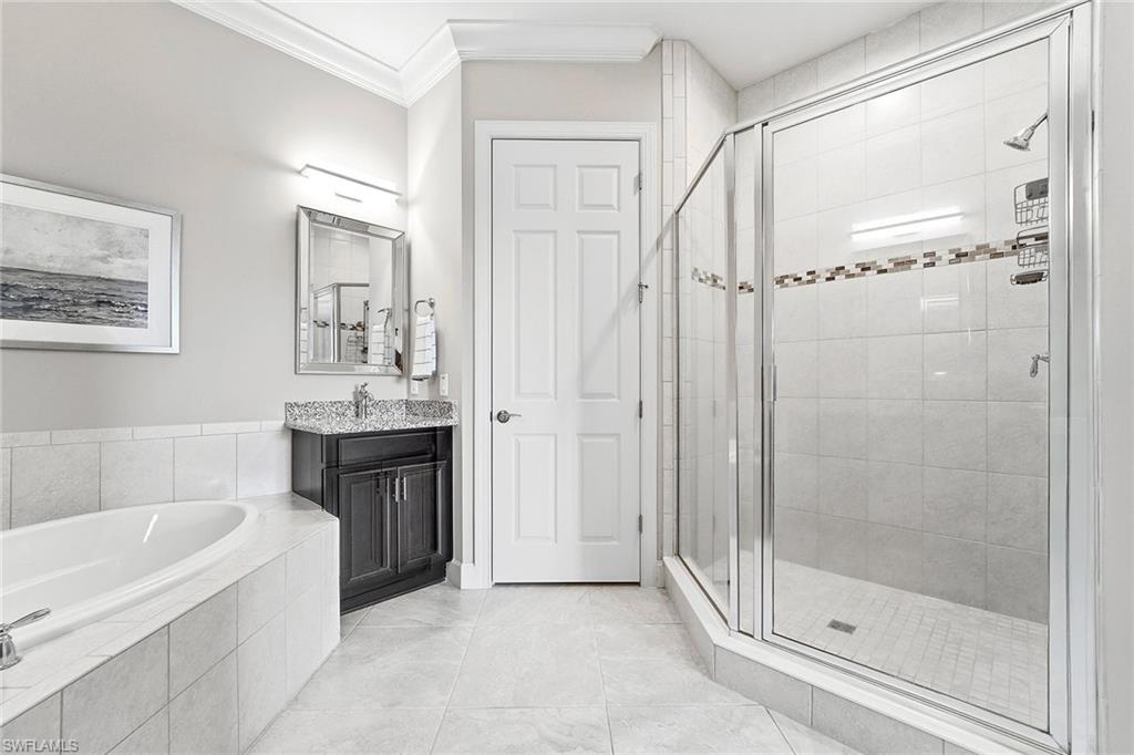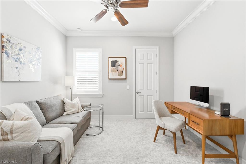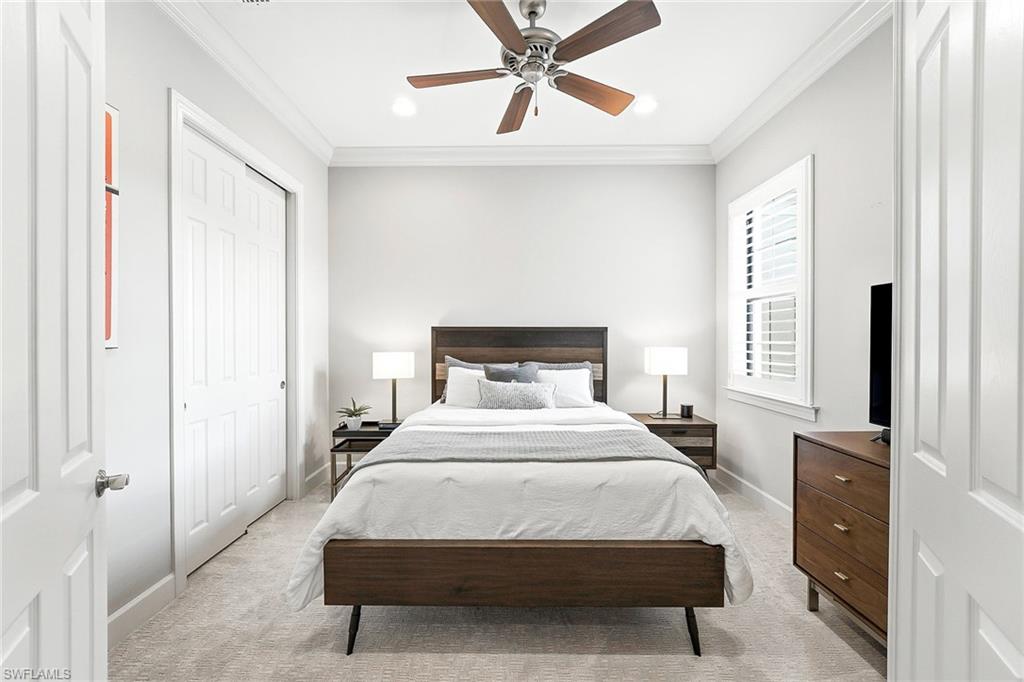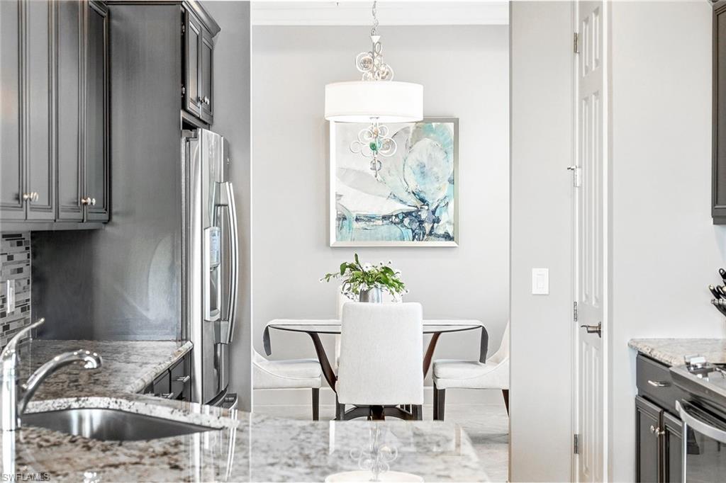 Full golf membership included for two championship courses. In gated golf community of TwinEagles, this second-floor condominium offers 2,291 square feet of living area plus a lanai area with lake and golf course views. The open floor plan is enhanced by soaring volume ceilings, creating a light-filled interior. The kitchen includes custom upgrades combining function with design. Neutral builder selections provide a versatile foundation for personalization. The residence includes three bedrooms, a den, two full baths and one half bath. Tile flooring is featured in the main living areas, with new carpet in the bedrooms. The kitchen is appointed with shaker-style cabinetry, quartz countertops and GE electric appliances. The open layout connects the kitchen to the dining and living areas, designed to maximize natural light and views. The primary suite includes dual vanities, a soaking tub and a separate shower. Plantation shutters are installed throughout the residence. A large screened lanai provides covered outdoor living space overlooking the lake and fairway. Additional features include a two-car attached garage, with new coating on the garage floor. TwinEagles offers two championship golf courses and a private club lifestyle, bocce ball, Himalayan course, pickleball, tennis courts, fitness center all in North Naples, with convenient access to shopping, dining and Gulf beaches.