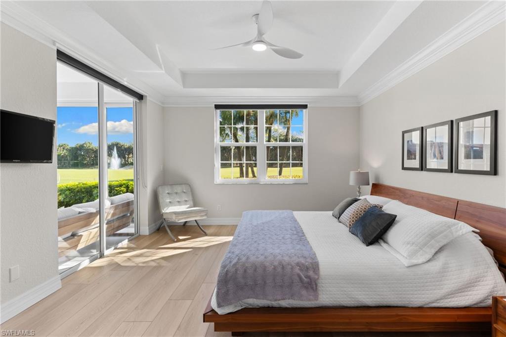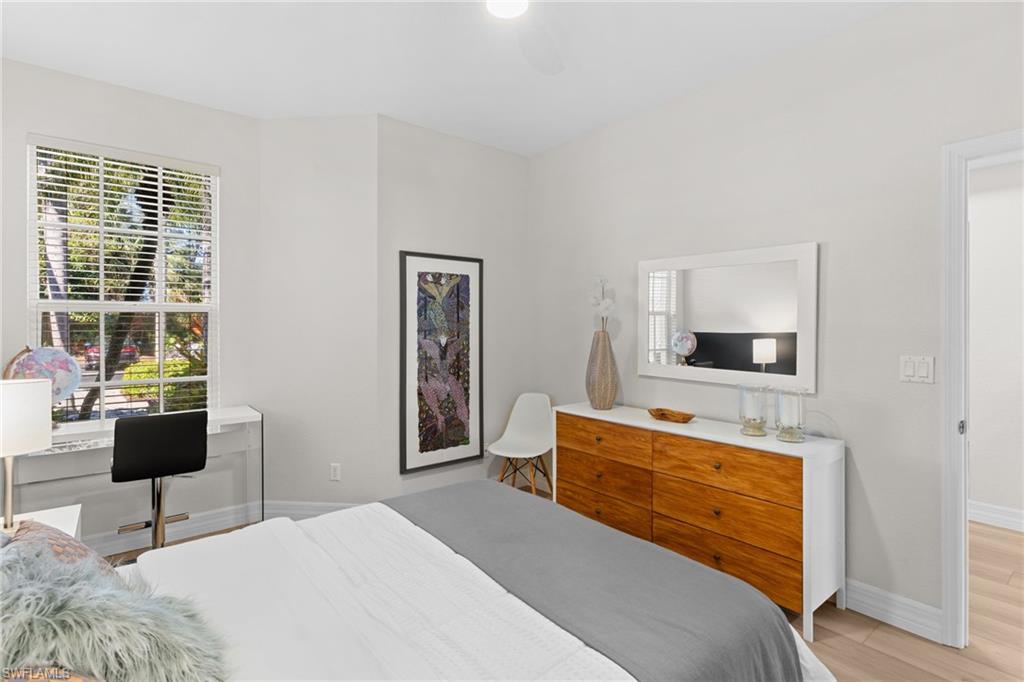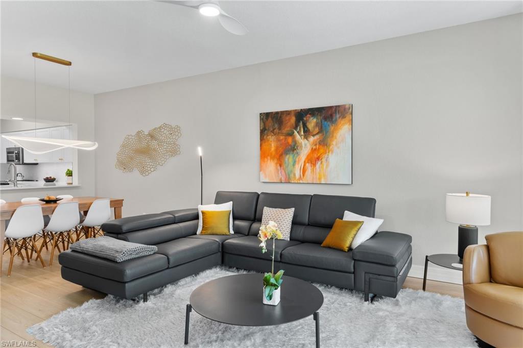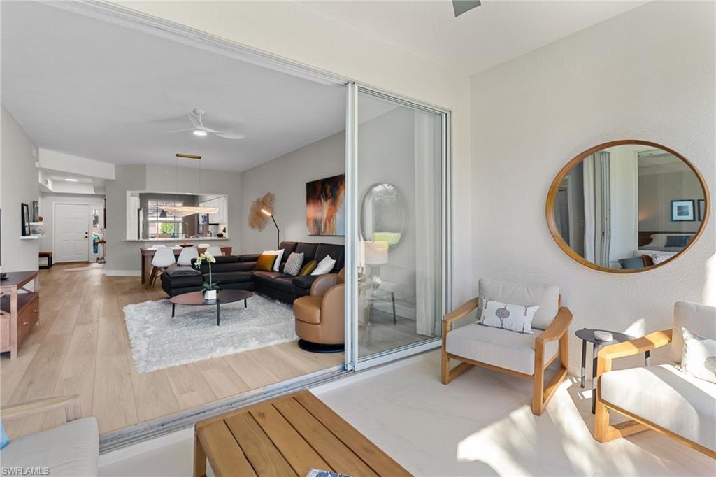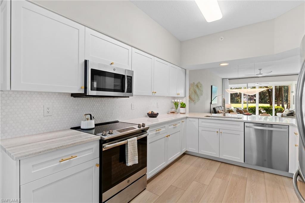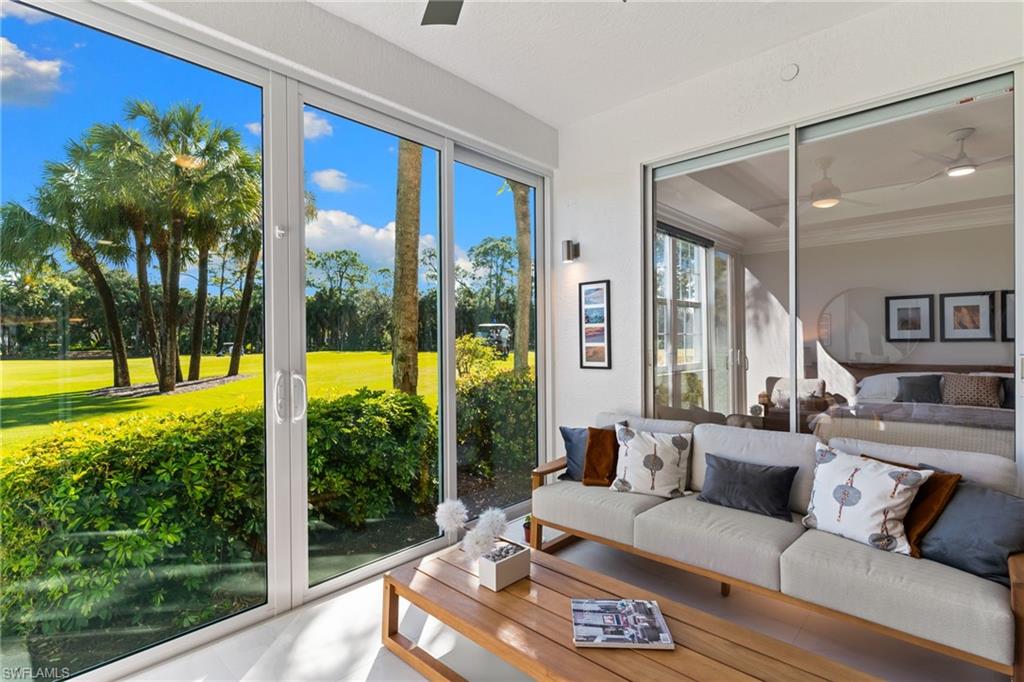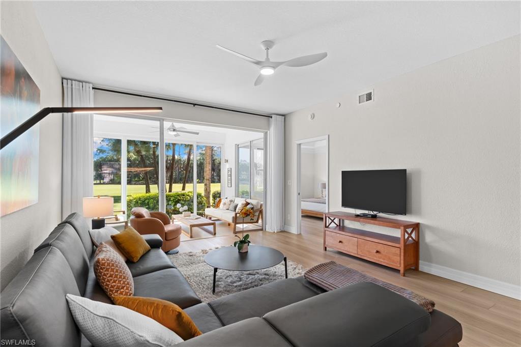 Most Stonebridge properties embrace traditional Florida coastal. 1960 Willow Bend Circle #102 took a different path—floor-to-ceiling glass framing the 10th green, contemporary finishes, and a mid-century modern aesthetic that prioritizes clean lines over ornate details. Morning light floods 1,568 square feet of first-floor living through eastern-facing windows where the 10th green becomes your backyard. The design language is deliberate: light wood-look LVP flowing throughout, white subway tile backsplash, minimalist hardware, and a neutral palette that lets the golf course views take center stage. This isn't builder-grade Stonebridge—it's thoughtfully curated modern design. The kitchen's quartzite counters and stainless appliances handle daily life with understated efficiency. The primary bedroom opens directly to the screened lanai where golf views and morning coffee become ritual. Roll-down screens extend usability year-round, whether you're watching golfers navigate the 10th or simply claiming the quiet before the day begins. The second bedroom provides guest flexibility or workspace that actually has separation. AC replaced July 2025 means immediate peace of mind. First-floor positioning means no elevator waits, immediate lanai access from the living room and primary suite. The kind of layout where indoor and outdoor living blur naturally. Bundled Stonebridge golf membership, Kipp Schulties' redesigned championship course, Bistro dining, resort-style pool—all included. But the real value is the aesthetic: a contemporary design approach in a community known for traditional finishes. This represents the increasingly rare intersection of modern design, golf course living, and first-floor convenience in Stonebridge. For buyers who've been waiting for Stonebridge to feel contemporary rather than traditional, this is it.