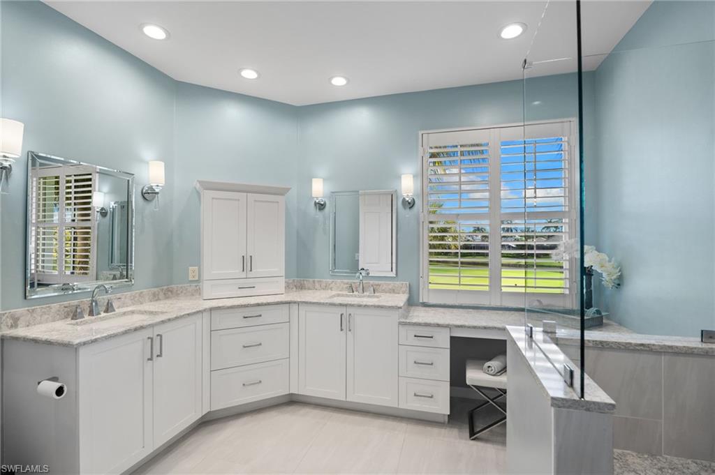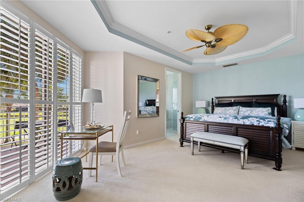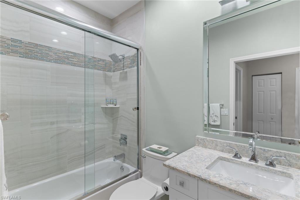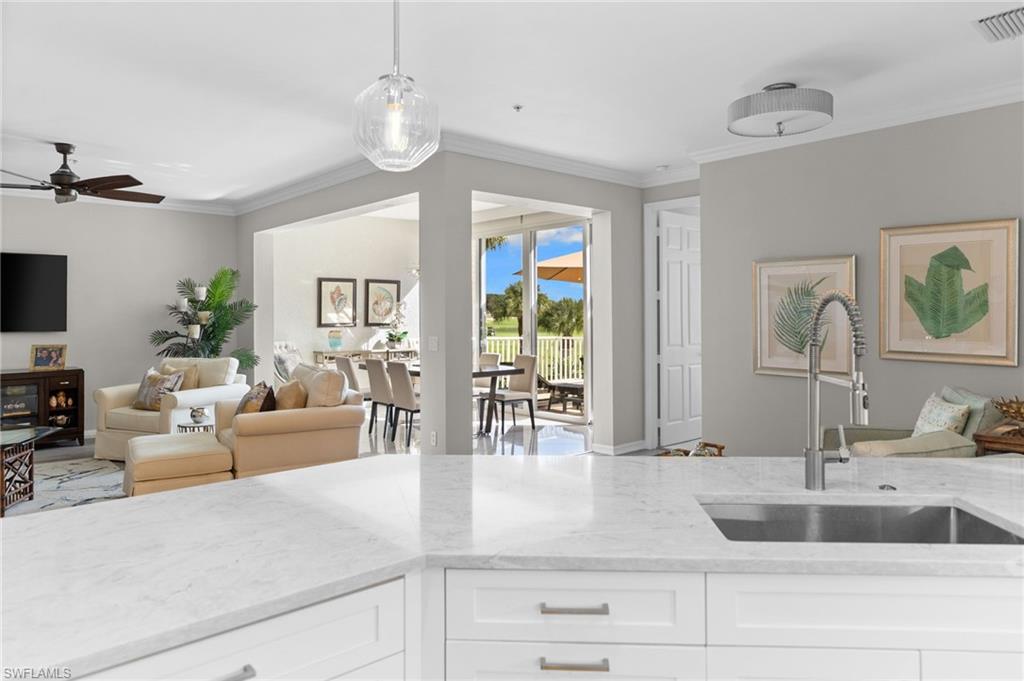 Set within the coveted gates of Pelican Marsh, this thoughtfully renovated first-floor residence offers a rare blend of privacy, light, and effortless Naples living. Facing southwest, the home is perfectly positioned to capture warm afternoon sun and tranquil sunset tones across the golf course and shimmering lake—views that feel both expansive and calming from nearly every main living space. Inside, a refined open-concept layout anchors the home, seamlessly connecting the kitchen and great room to create an inviting environment equally suited for quiet mornings or lively evenings with guests. The kitchen is both elegant and practical, featuring quartz countertops, premium stainless-steel appliances, a built-in wine cooler, casual seating for everyday dining, and sculptural glass pendants that provide refined visual punctuation. The residence has been comprehensively updated with a clear focus on quality and longevity. A new HVAC system installed in 2025 enhances year-round comfort and efficiency, while the primary bath has been fully transformed into a spa-inspired retreat—complete with a custom walk-in glass shower, bespoke cabinetry, and refined designer finishes. The guest bath echoes this elevated aesthetic with its own glass enclosure, quartz surfaces, and sophisticated detailing. One of the home's most compelling features is its oversized enclosed dining room, finished in marble flooring and wrapped in panoramic views. This defined yet light-filled space offers flexibility rarely found in open floor plans, making it ideal for formal dining, a private office, or a refined sitting room. Glass sliders open to a private, wrap-around elevated terrace—an extension of the living space that invites outdoor dining, morning coffee, or sunset unwinding, all framed by sweeping golf course and water vistas. Additional comforts include custom closet systems throughout, an oversized walk-in garage with upgraded electrical panel, and assigned additional parking. The expansive dining room windows are protected by hurricane shutters, offering both peace of mind and practical storm preparation—thoughtful details that enhance daily living and long-term ease. Residents of Pelican Marsh can enjoy access to championship golf, resort-style amenities, and a central Naples location just minutes from beaches, world-class dining, shopping, and cultural experiences. Offered in move-in-ready condition, this residence presents a compelling opportunity to enjoy a polished, low-maintenance lifestyle with enduring appeal—ideal for those seeking immediate enjoyment and lasting value in one of Naples' most established communities.