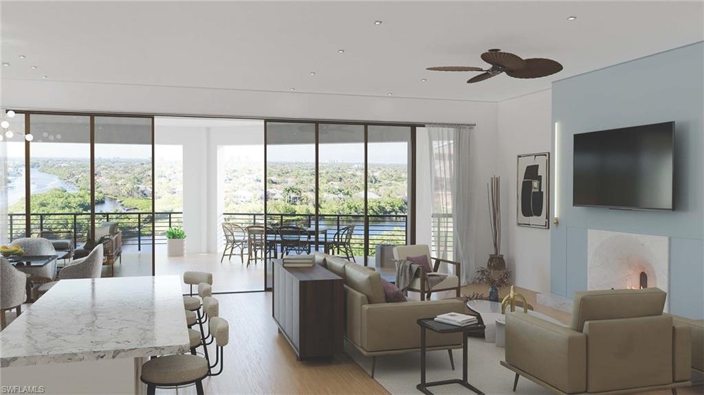 Aurora was meticulously planned and designed to provide its residents carefree living with all the features and amenities of a waterfront single family luxury home. The impressive interior features include open floorplans designed to maximize the wide views of the Imperial River, state of the art kitchens with gas Wolfe ranges, SubZero refrigerators custom kitchen cabinets to the ceiling, Quartz countertops, wood flooring throughout, 11’ ceilings, fireplaces, lanais with electric screens shutters, summer kitchens with gas grills, all bedrooms have en suite bathrooms, 2-4 garages with large storage areas, plus piece of mind of latest hurricane codes, a whole building natural gas generator and ISO 4 non-combustible construction for the lowest possible insurance rates. The exterior amenities are just as impressive with gated entry, state of the art boat docks with lifts provide premier boating and direct Gulf access, Clubhouse with fitness, kitchen for parties, indoor outdoor bar all overlooking the tropical resort style pool and the marina, plus optional air-conditioned cabanas. Aurora also offers the perfect location, a private riverfront setting yet easy access to US 41, shopping, entertainment and the beach. Condo 405 in Building II is located on the 4th floor end where all views are of the Imperial River and Nature. This condo offers over 3,409 total square feet of living space plus the garage and storage. Features include 4 bedrooms with den option, 4 1/2 baths, large living areas and over 690 sq ft outdoor covered lanai/balconies with summer kitchen with natural gas grill and electric screens & shutters. Now accepting reservations for fall 2027 delivery at initial pricing. All site work, pilings, and pads complete. Note: Coming soon - Windsor Road will be extended behind the Publix shopping center to US 41 for easy access from Aurora to US 41 without the need to drive to Bonita Beach Road. Property photos contain virtual renderings.