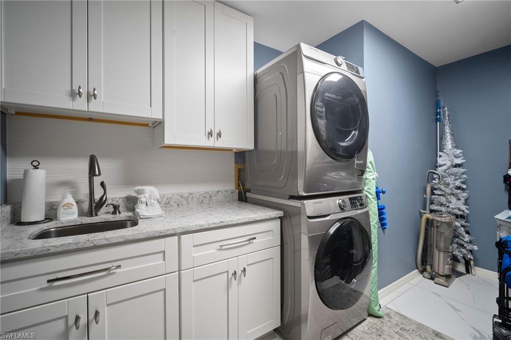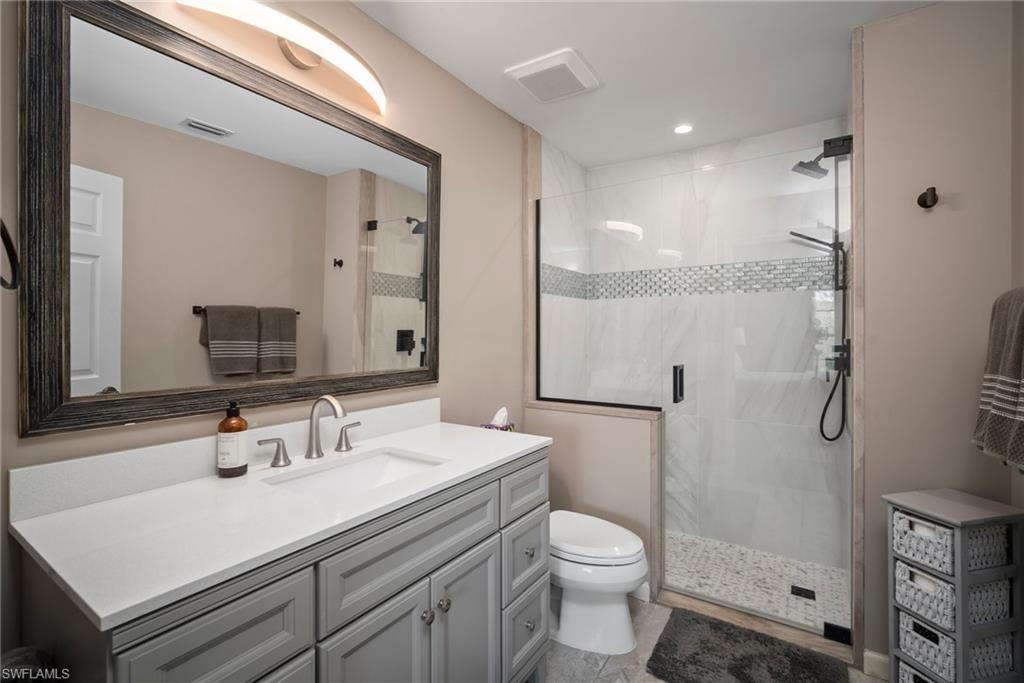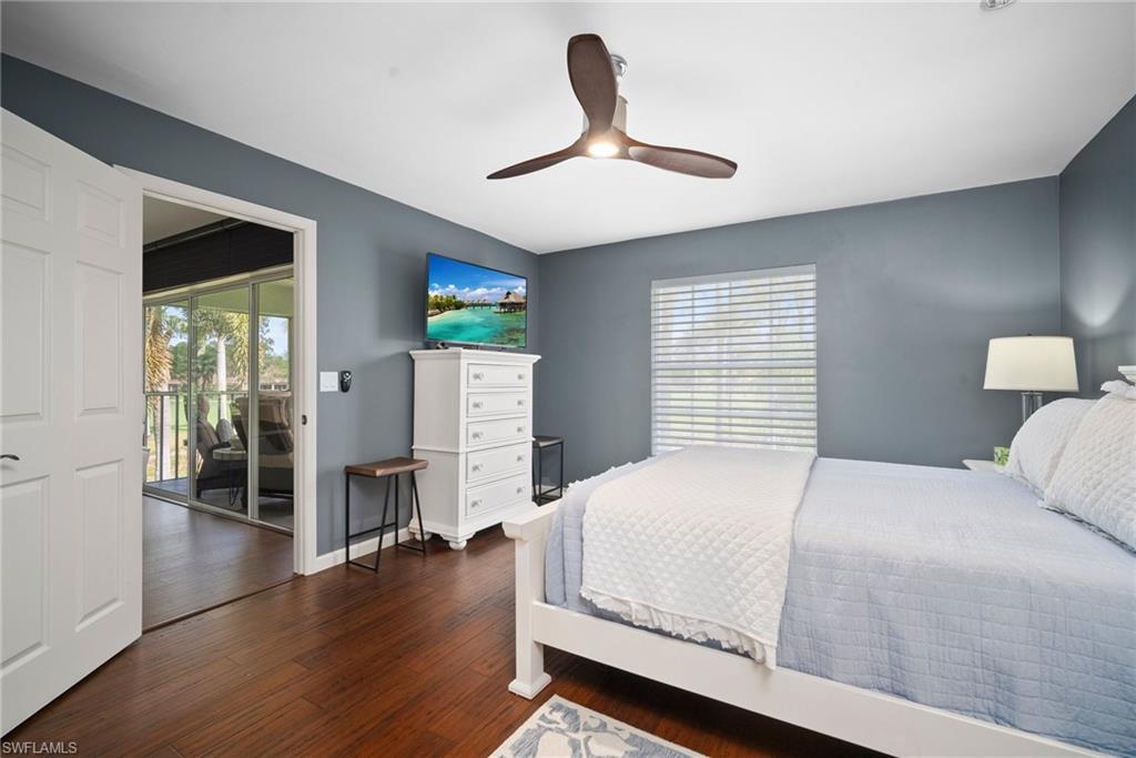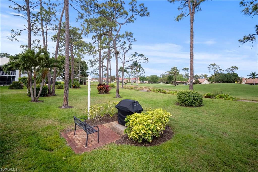 Enjoy sipping your morning coffee from the lanai of this beautifully renovated end unit at the end of a quiet cul de sac free from traffic and offering a great view of the first green of the Royal Palm Golf Course. The spacious kitchen is a cook's delight with outstanding custom cabinetry, upgraded charcoal fingerprint-less stainless steel appliances and quartz countertops with ceramic backsplash coordinated to cabinets and countertops. The glow of three sparkling pendant lights enhance the well-designed, utilitarian kitchen. There are wood floors throughout the main areas with tile in the laundry room and two bathrooms. The bathrooms have also been updated with large porcelain tiles and glass shower doors, quartz countertops and ample space vanity cabinets. The main living area with its vaulted ceiling and two windows provides a feeling of space and light. The split bedrooms offer privacy with bathrooms convenient to each bedroom. Remote custom shades throughout. The laundry room with additional storage space has a heavy duty stack washer/dryer combo including a stainless steel sink and beautiful countertops and backsplash. White Shaker cabinets provide for storage for your laundry goods and...more. Brand new HVAC system and hot water heater installed in January, 2025. This condo is move-in ready for you to enjoy the pool and all the wonderful amenities that Naples has to offer. Also, it's nearby to the beaches of Marco Island and Naples, shops, fine dining, Physicians Regional Hospital, and Florida Southwestern College. This is a must-see unit in a highly desired area of Naples.