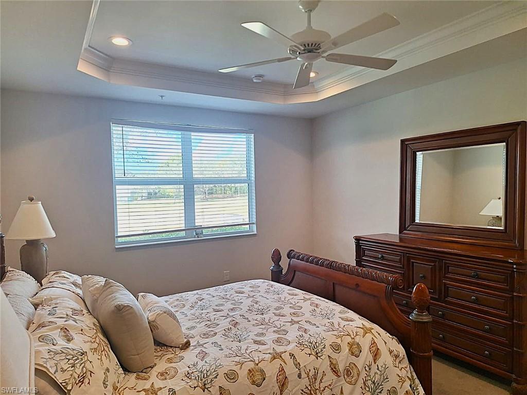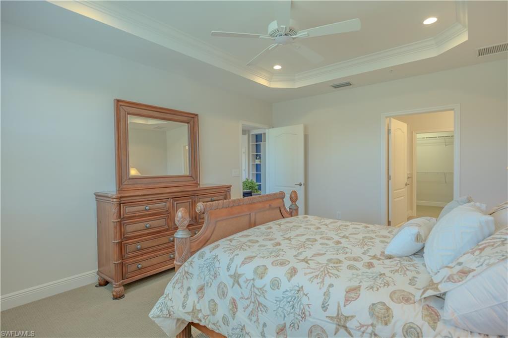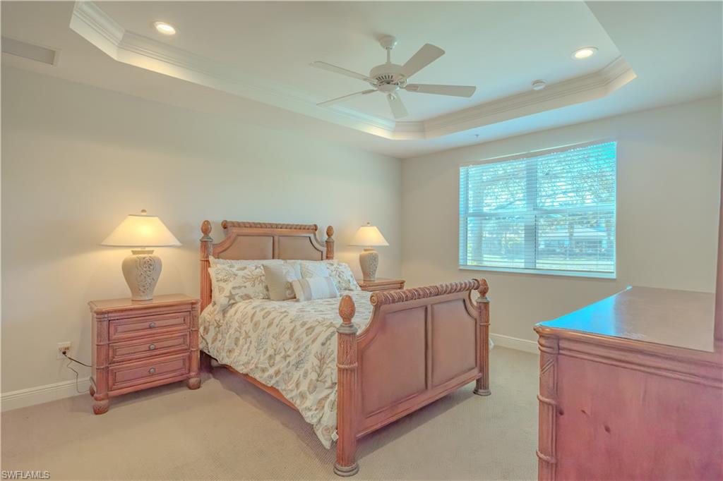 Experience the beauty of North Naples in this pristine first-floor carriage home located in the gated community of Richmond Park. This light and bright open-concept residence features 2 bedrooms, 2 bathrooms, and an attached garage. The modern kitchen, complete with a large island and spacious pantry, flows seamlessly into a living area distinguished by custom built-in decorative shelving and stylish blue accent walls. Step out onto the private screened lanai to enjoy peaceful western lake views, featuring custom shades and a ceiling fan for year-round relaxation. Significant updates include wood-look tile flooring throughout the main living areas, all-new designer ceiling fans, and contemporary light fixtures. The primary suite serves as a quiet retreat, boasting a tray ceiling, an oversized walk-in closet, and a spacious bathroom with a glass-enclosed shower. Residents of Richmond Park enjoy access to a clubhouse, pool, and sundeck within a meticulously landscaped setting. Perfectly situated just minutes from the dining and entertainment at Founders Square and a short drive to the white sands of Vanderbilt Beach, this move-in-ready home offers the ideal Florida lifestyle