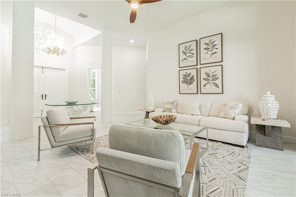 Welcome to Bonita Bay! Fall in love with this spectacular home the moment you walk through the double doors into the inviting living area overlooking the pool and lush landscape. The open kitchen and family area, complete with a fireplace mantel, are perfect for entertaining. High ceilings bring in light, volume and elegance; yet you feel a sense of being home. The Riverwalk community is close to the entrance, kayak launch, basketball court, butterfly garden, and playground. Enjoy private beach access with the new community beach area. The walking trails are picturesque. Start living and loving the Bonita Bay lifestyle.