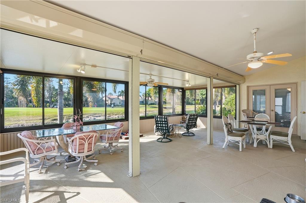 FULL GOLF MEMBERSHIP INCLUDED ($50,000 IN VALUE)! Rarely available single family home in Hunters Ridge Golf and Country Club WITH a GOLF MEMBERSHIP is now available! Step inside this 3 bedroom 2 bathroom home and you will immediately appreciate all the NATURAL LIGHT throughout, gorgeous floors, plantation shutters, updated kitchen, and the scenic golf course views right from your own PRIVATE enclosed lanai (OVERLOOKING THE 5TH HOLE)! This beautiful home also has a mini split unit outside on the enclosed lanai creating more living space! The Club is known for its welcoming, relaxed atmosphere and offers a vibrant calendar of social and golf activities. Only six miles from Barefoot Beach Preserve, Hunters Ridge provides quick access to premier shopping, dining, entertainment, and RSW Airport. Within the community, residents enjoy an 18-hole championship golf course, state-of-the-art golf simulators, a spacious resort style pool with food and beverage service, tennis courts, pickleball courts, and much more. The clubhouse features both elegant dining and a casual grill room. Adding to the lifestyle appeal, a major renovation is currently underway. The Activity and Fitness Center is being transformed into a modern, updated Community Center with expanded fitness and wellness amenities an exciting enhancement that will elevate daily living, increase home values, and truly bring resort style wellness to your doorstep.