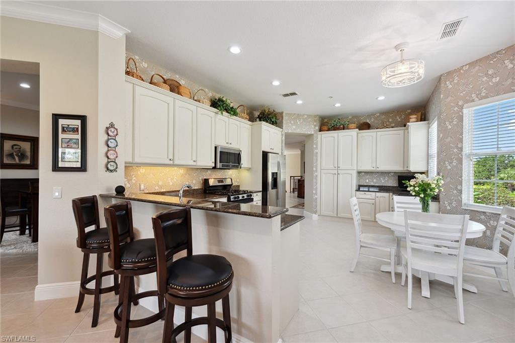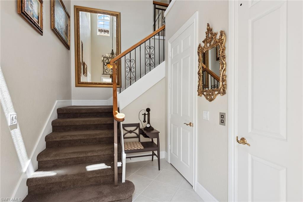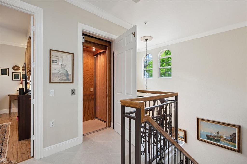 Location, location, location. Fantastic Rookery golf course views are showcased in this immaculate and stunning second-floor end coach home with private elevator in sought-after Montreux neighborhood at Fiddler's Creek, ideally near the community’s award-winning club amenities. This beautifully appointed residence offers more than 3,000 square feet of thoughtfully designed living space, featuring three bedrooms plus a study, three full baths and an attached two-car garage. New air conditioner installed in 2025. A charming brick paver driveway and walkway lead to a welcoming courtyard entry. Inside, a desirable split-bedroom floor plan ensures comfort and privacy for owners and guests. Recessed lighting, crown molding and diagonal tile flooring enhance the main living areas, while engineered wood flooring adds warmth to the bedrooms and study. The study, accessed through French doors, provides a versatile space ideal for a home office, den, media room or fourth bedroom. The bright, airy kitchen is designed for everyday living and entertaining, offering quality cabinetry with generous storage, granite countertops and bay windows that fill the space with natural light. A breakfast bar and cozy kitchen nook provide inviting spots for casual dining, complemented by a pantry and stainless-steel appliances, including a natural gas range, microwave, refrigerator with ice maker and dishwasher. The spacious living area opens seamlessly to the screened lanai through glass sliders, creating effortless indoor-outdoor flow. Overlooking the lush fairways of the beautiful Rookery course, the lanai is finished with diagonal tile flooring, a screen enclosure and electric storm shutters, making it an ideal setting for relaxing evenings or hosting guests. The owner’s suite is a sanctuary with direct lanai access, white plantation shutters and two walk-in closets. The en-suite bath features dual granite vanities, a glass-enclosed walk-in shower with gray stone accent tile and mosaic flooring, a soaking tub and a private water closet. Each guest bedroom enjoys its own en-suite bath, one with a frameless glass walk-in shower and private balcony access, the other with a glass walk-in shower and natural light from a window. Additional highlights include a well-equipped laundry room with storage cabinetry, utility sink and GE washer and dryer, a portable generator, custom garage flooring and built-in shelving. The CDD bond is paid in full! Residents enjoy an excellent location and a desired, gated community with gorgeous landscaping and newly enhanced amenities, including a resort-style pool with slides and waterfalls, updated Gator Grille for casual dining and 10 new pickleball courts. The clubhouse offers fitness and spa facilities, tennis, pickleball, dining, and an extensive activity and event calendar. Optional memberships provide access to the championship course, impressive golf clubhouse, marina and beach club.