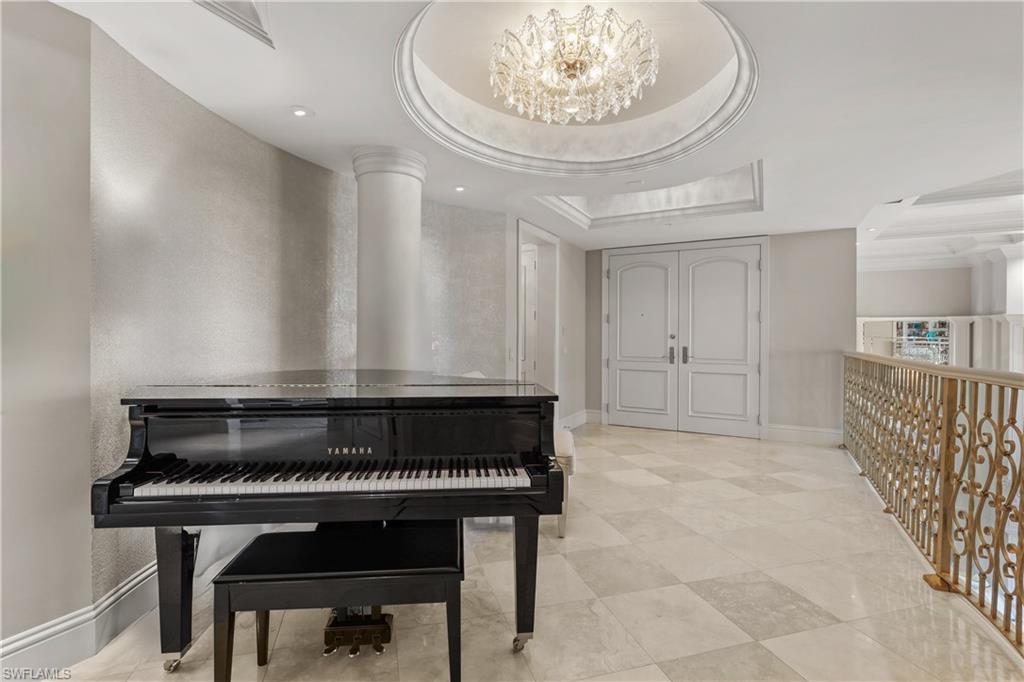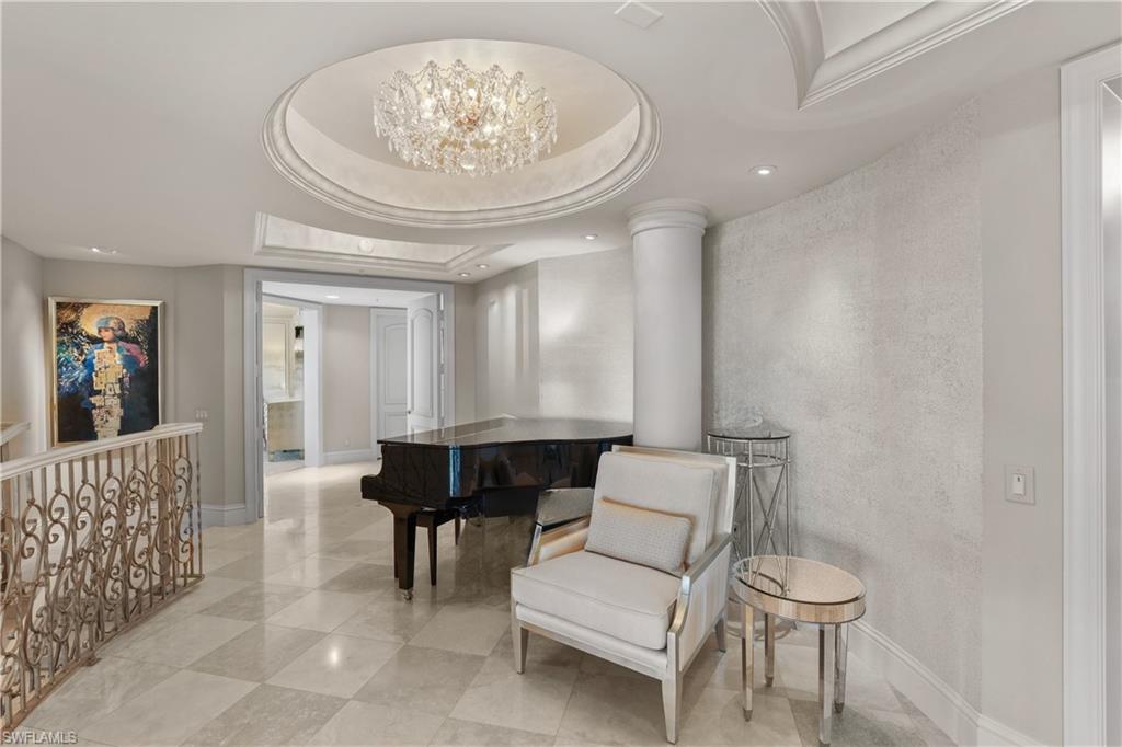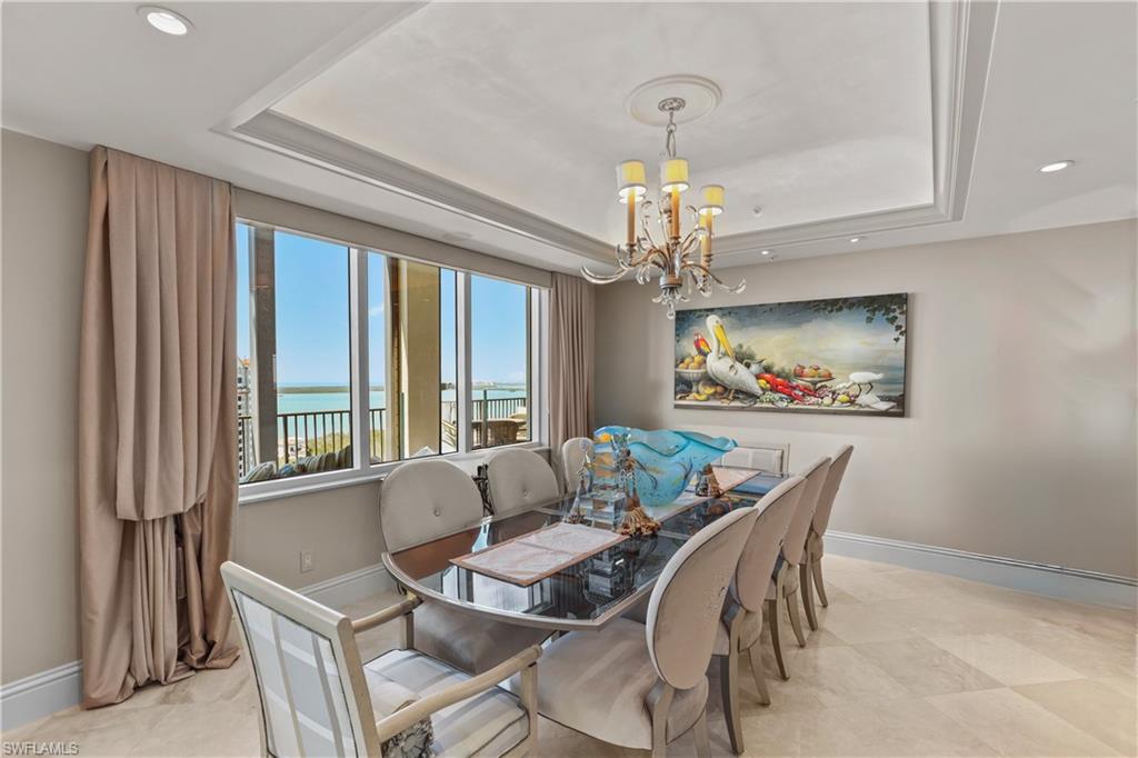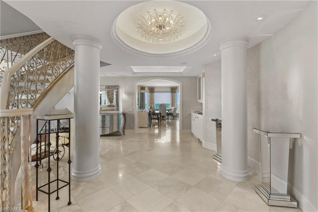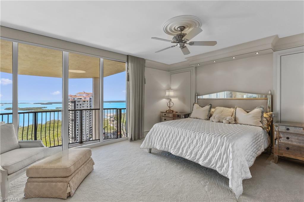 This luxurious two-story penthouse offers sweeping views of Estero Bay and the Gulf of Mexico. Polished marble tile flooring in a beautiful neutral tone creates a luxurious and timeless look. A custom-made curved staircase with wrought iron balusters adds a dramatic touch to the entryway. Soaring windows in the living room with a gas fireplace set the tone for entertaining. Subzero-built-in wine locker with temperature and humidity control to store and age your favorite wines. Top-of-the-line appliances, 6 burner gas range, and center island with additional dishwasher. Custom cabinets in the den, family room, library, upgraded lighting, laundry on both floors, and private enclosed 2-car garage with storage. Your most discerning buyers will fall in love. Palermo has 2 guest suites, a theater, billiards, a pool/spa, a BBQ pavilion, a fitness center, front desk staff, and an on-site building manager. Residents of The Colony enjoy private membership to a waterfront dining facility, The Bay Club, with exceptional views with sunset dining/entertainment. Experience a full array of amenities such as kayaking, canoeing, sailing, bocce, tennis, pickleball, and the private beach park accessed by water taxi. 15 minutes to the airport.