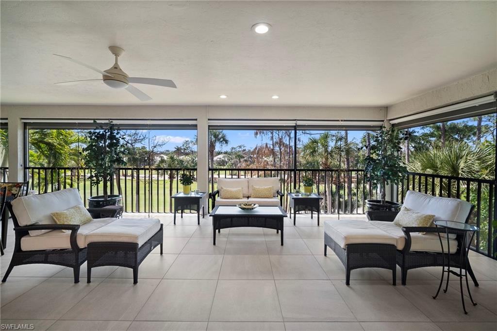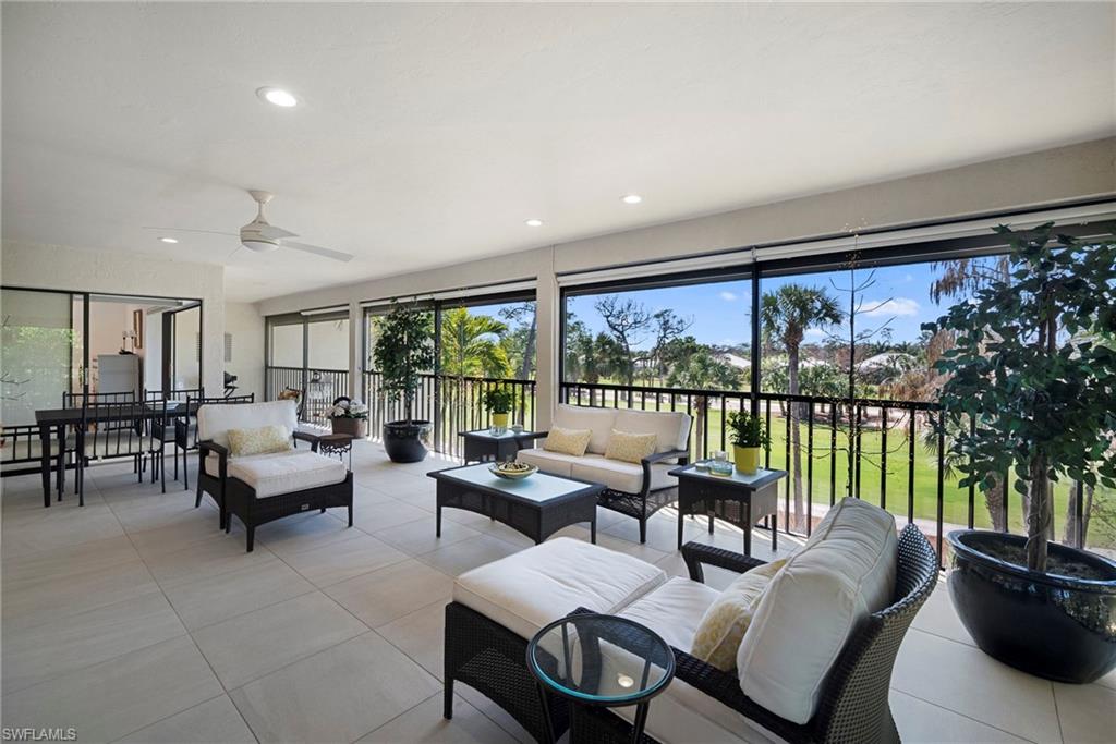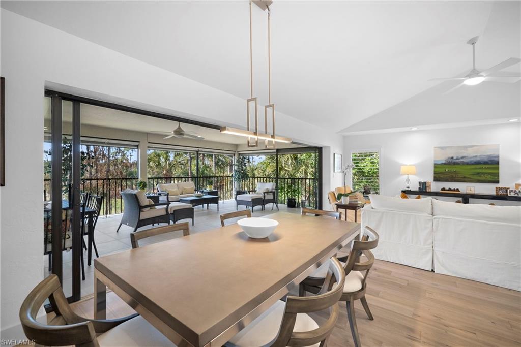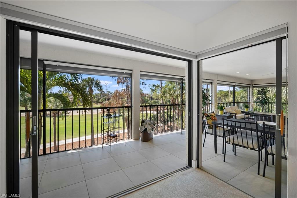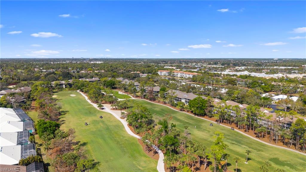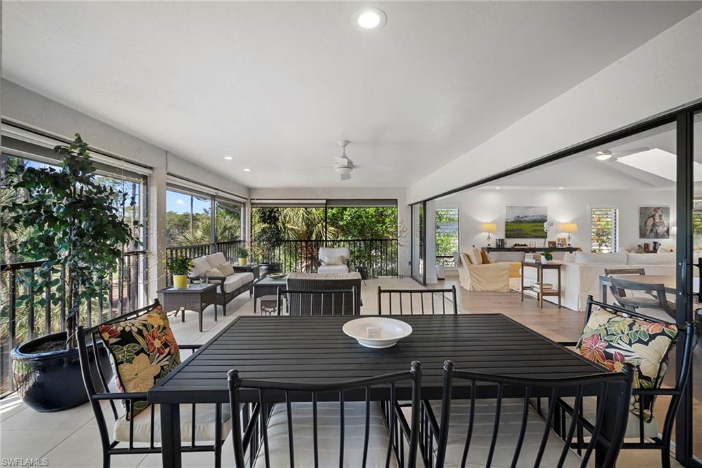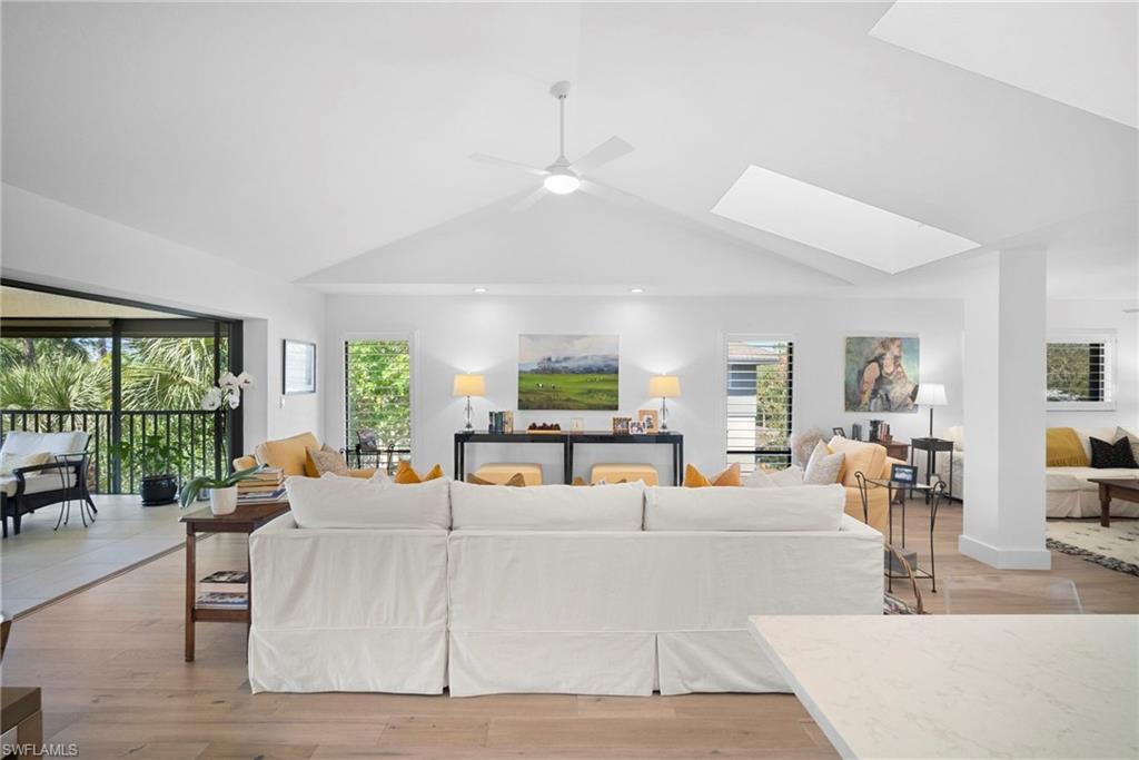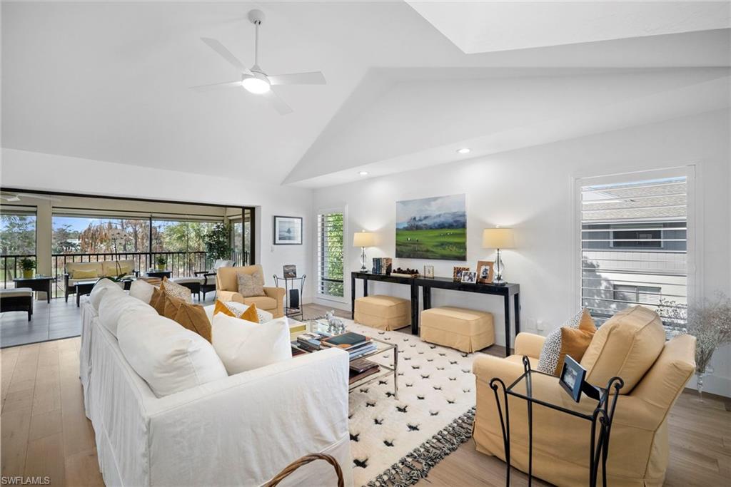 Immediate Golf Membership Available. Enjoy gorgeous treetop views overlooking the 4th fairway from this beautifully renovated corner unit residence designed to embody the Naples golf club lifestyle. A welcoming double-door entry opens to a light-filled interior enhanced by skylights and clear-view plantation shutters, allowing abundant natural light while maintaining privacy. The thoughtfully designed layout includes a spacious family room, living room, and dining room, creating seamless flow for both everyday living and entertaining. The home features two spacious primary suites, offering comfort and flexibility for both owners and guests. The stunning renovation includes Wolf and Sub-Zero appliances, rich wood flooring throughout the main living areas, and a spacious kitchen with generous granite L shaped counter top. A separate kitchen entrance adds convenience, while double doors reveal a stacked LG washer and dryer and a custom-built pantry with integrated microwave. An expansive lanai provides the perfect setting for entertaining or relaxing while taking in the serene golf course views. Electric STORM SMART screens plus sunshades ensure comfort and protection year-round. A truly stylish home designed for effortless entertaining and luxury living, located within Eagle Creek Golf & Country Club and just a short drive to Marco Island and downtown Naples.