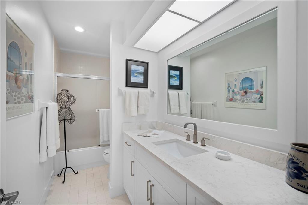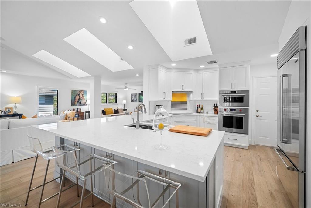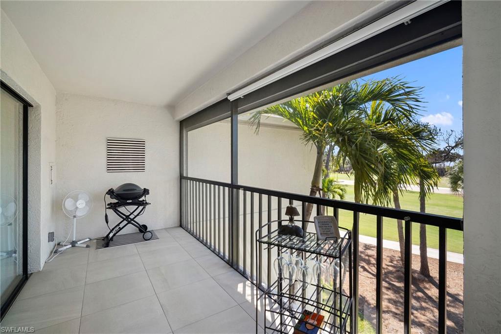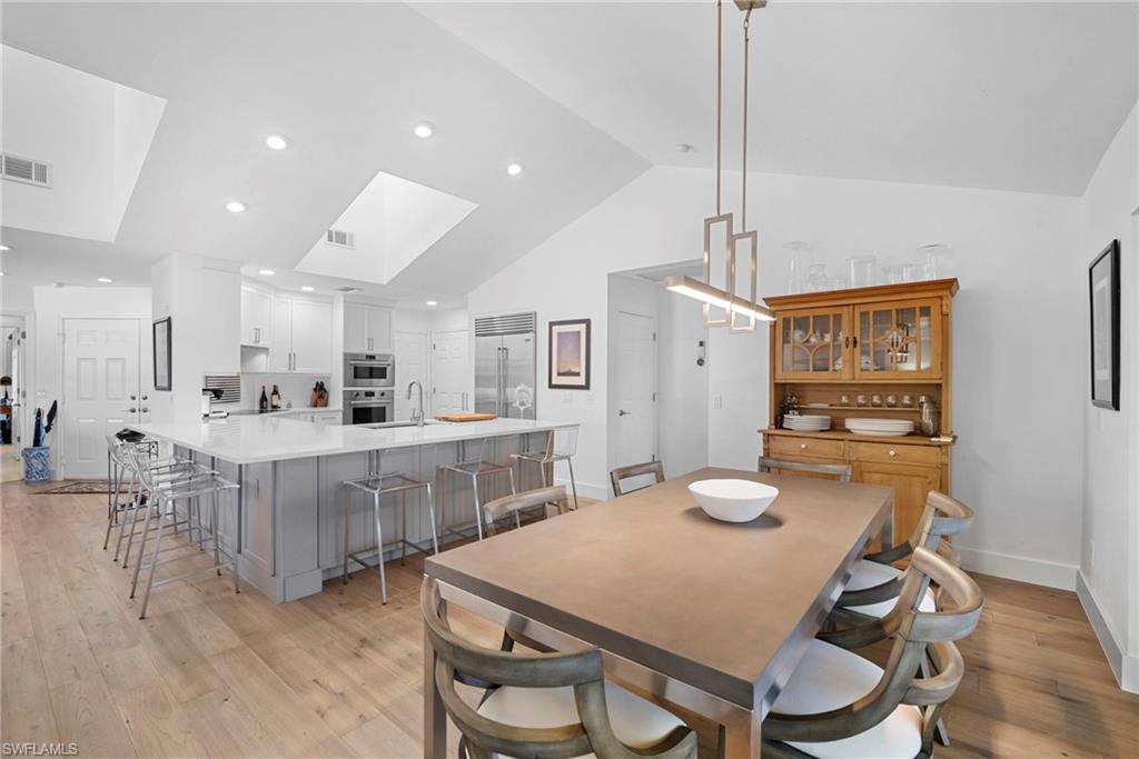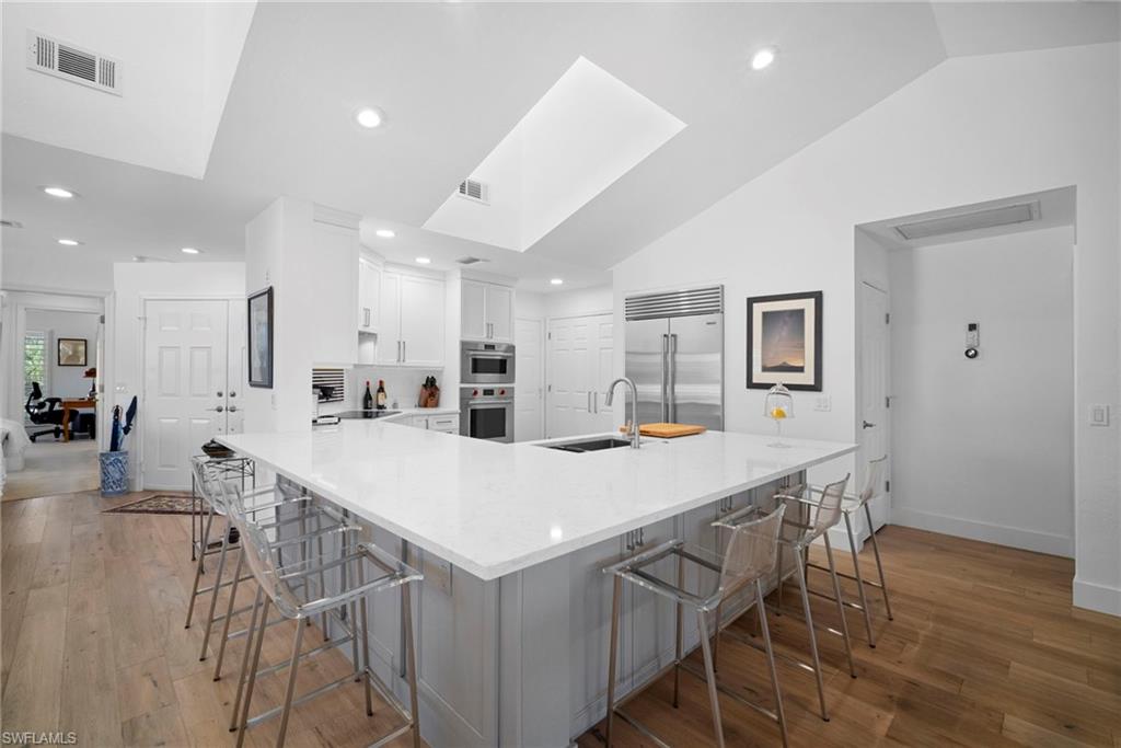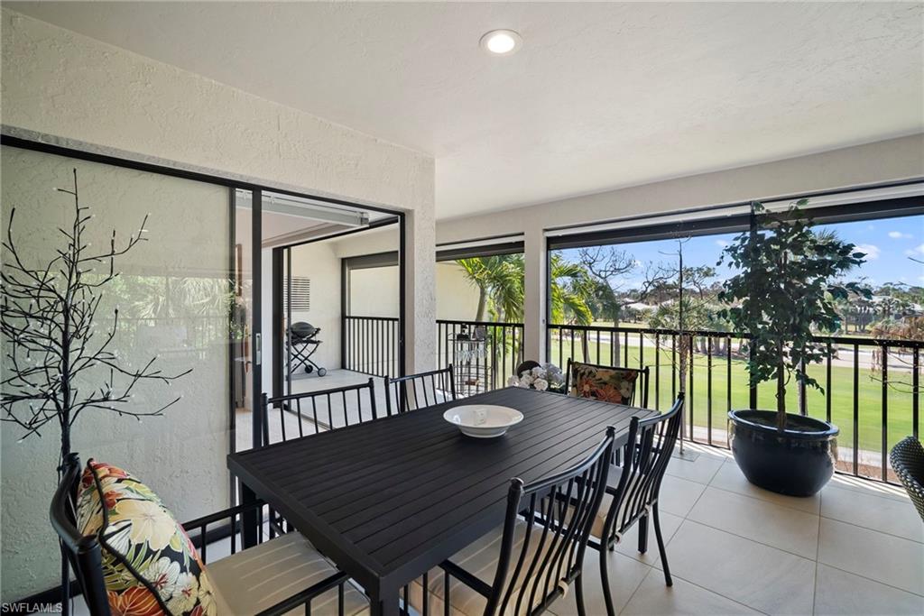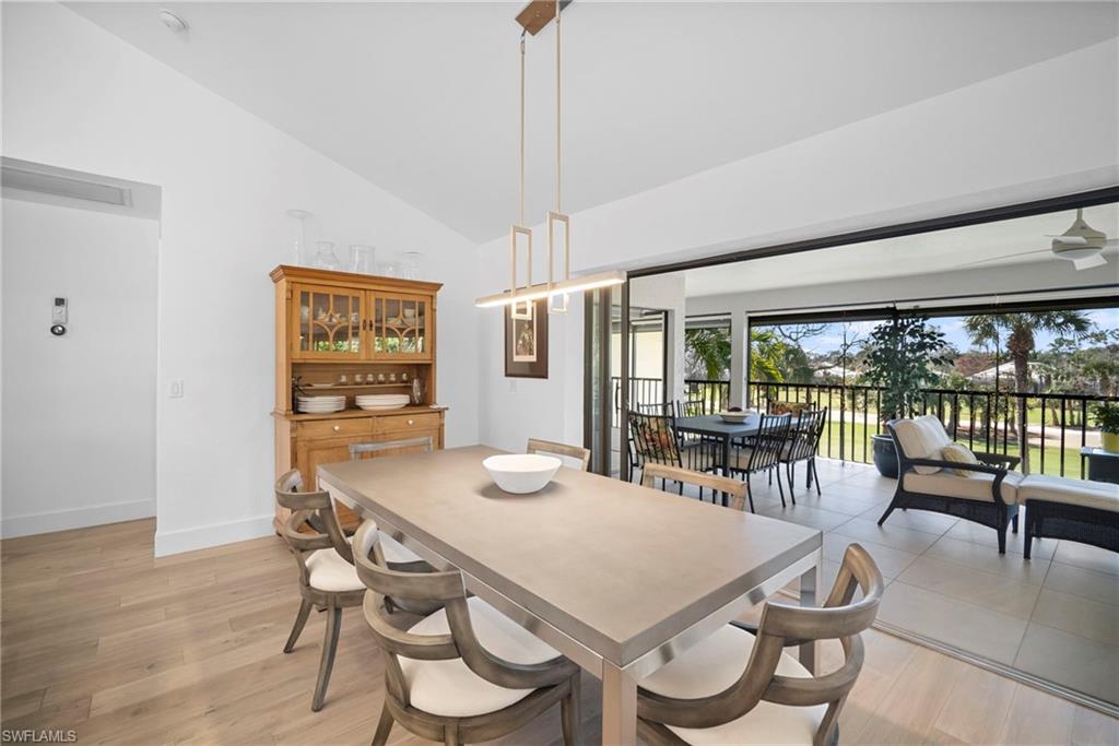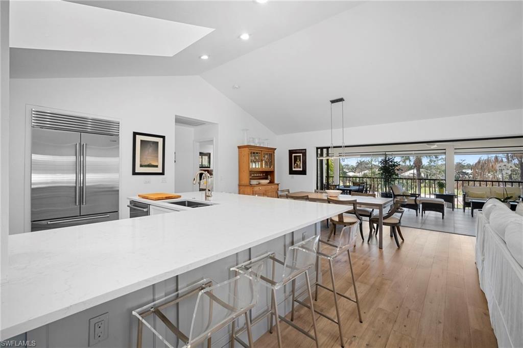 Immediate Golf Membership Available. Enjoy gorgeous treetop views overlooking the 4th fairway from this beautifully renovated corner unit residence designed to embody the Naples golf club lifestyle. A welcoming double-door entry opens to a light-filled interior enhanced by skylights and clear-view plantation shutters, allowing abundant natural light while maintaining privacy. The thoughtfully designed layout includes a spacious family room, living room, and dining room, creating seamless flow for both everyday living and entertaining. The home features two spacious primary suites, offering comfort and flexibility for both owners and guests. The stunning renovation includes Wolf and Sub-Zero appliances, rich wood flooring throughout the main living areas, and a spacious kitchen with generous granite L shaped counter top. A separate kitchen entrance adds convenience, while double doors reveal a stacked LG washer and dryer and a custom-built pantry with integrated microwave. An expansive lanai provides the perfect setting for entertaining or relaxing while taking in the serene golf course views. Electric STORM SMART screens plus sunshades ensure comfort and protection year-round. A truly stylish home designed for effortless entertaining and luxury living, located within Eagle Creek Golf & Country Club and just a short drive to Marco Island and downtown Naples.