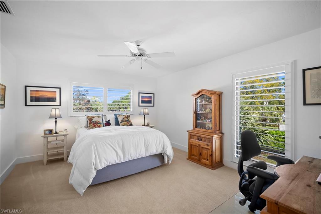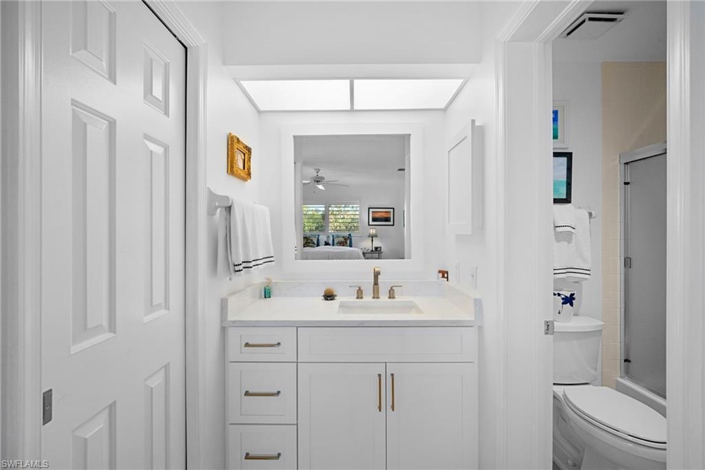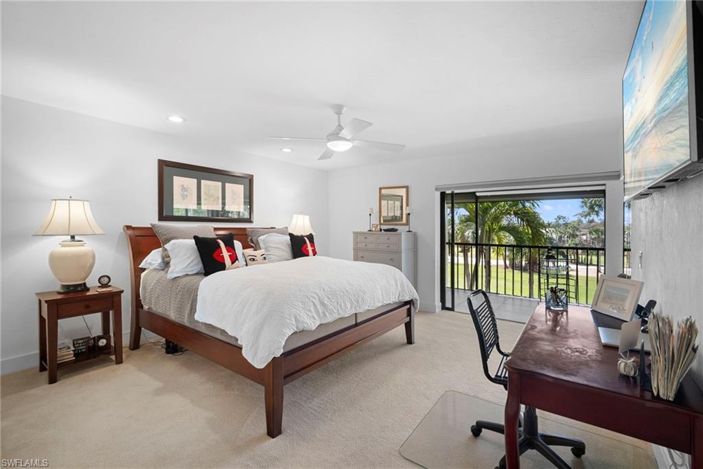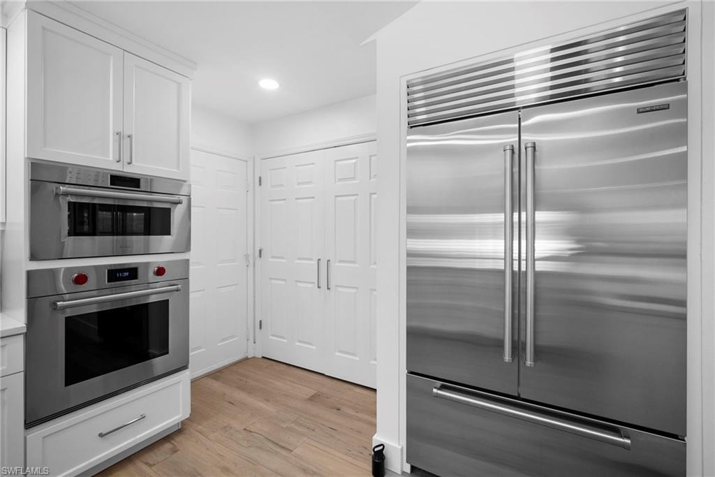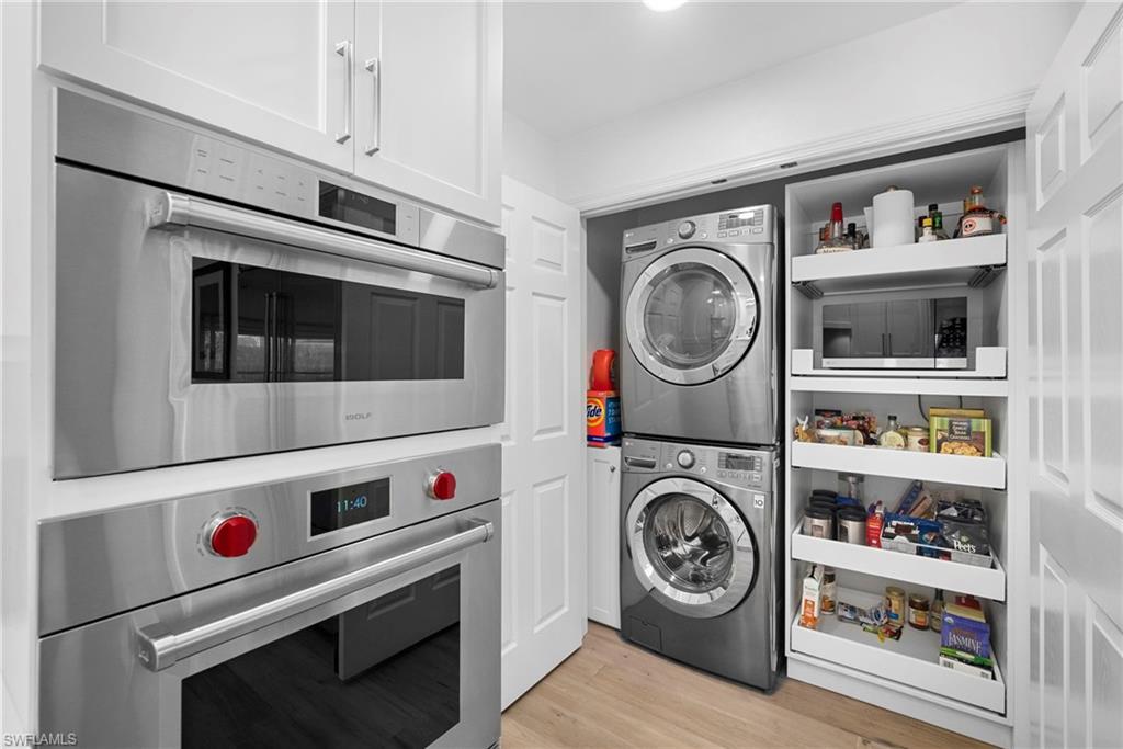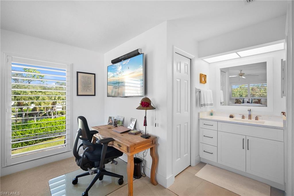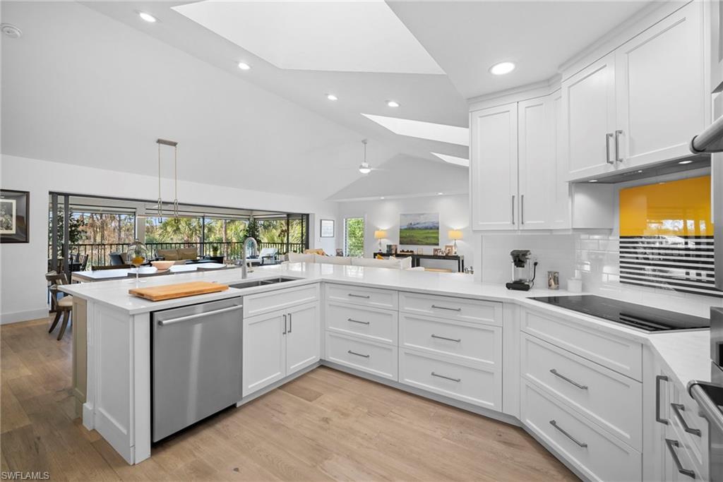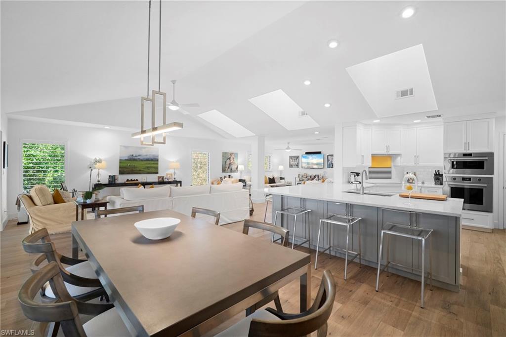 Immediate Golf Membership Available. Enjoy gorgeous treetop views overlooking the 4th fairway from this beautifully renovated corner unit residence designed to embody the Naples golf club lifestyle. A welcoming double-door entry opens to a light-filled interior enhanced by skylights and clear-view plantation shutters, allowing abundant natural light while maintaining privacy. The thoughtfully designed layout includes a spacious family room, living room, and dining room, creating seamless flow for both everyday living and entertaining. The home features two spacious primary suites, offering comfort and flexibility for both owners and guests. The stunning renovation includes Wolf and Sub-Zero appliances, rich wood flooring throughout the main living areas, and a spacious kitchen with generous granite L shaped counter top. A separate kitchen entrance adds convenience, while double doors reveal a stacked LG washer and dryer and a custom-built pantry with integrated microwave. An expansive lanai provides the perfect setting for entertaining or relaxing while taking in the serene golf course views. Electric STORM SMART screens plus sunshades ensure comfort and protection year-round. A truly stylish home designed for effortless entertaining and luxury living, located within Eagle Creek Golf & Country Club and just a short drive to Marco Island and downtown Naples.