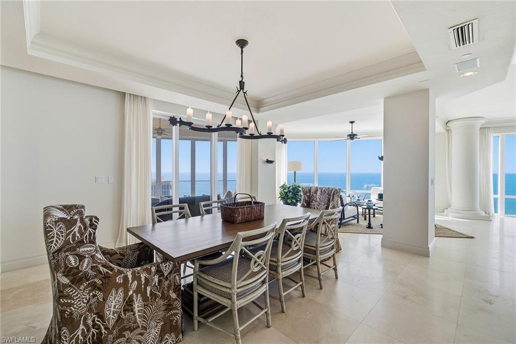 Enter this stunningly crafted beachfront residence from your private entry foyer to reveal endless views of the sparkling blue waters of the Gulf. Behind the gates of the prestigious and opulent Regent condominium building. Encompassing over 8,250 square feet, designed to meet the discerning taste of quality living and elegance while spanning an entire half of the 17th floor of the Regent. Features include the finest of artisan marble and wood flooring, custom cabinetry and millwork, custom draperies, elegant seating areas, spacious grand salon and custom multi-tiered six-seat media theater, private office and library, magnificent chef's kitchen with state-of-the-art appliances including gas cooktop and Sub-Zero refrigeration. The primary suite is a masterpiece of luxury with dual baths, custom closets and office. Car enthusiasts will appreciate the three-car parking spaces. The Regent offers unmatched amenities with professionally staffed 24-hour front desk, boardroom, social room, fitness, guest suites, pool and spa. Experience and unrivaled Naples beachfront lifestyle with close access to Park Shore boutique shops and some of the best restaurants in Naples.
