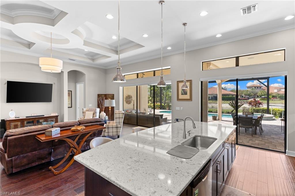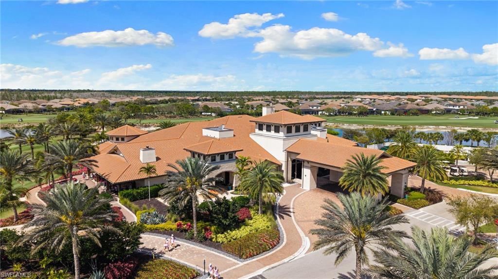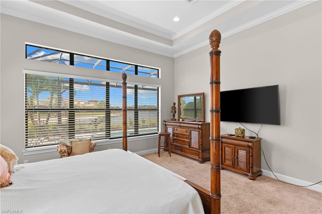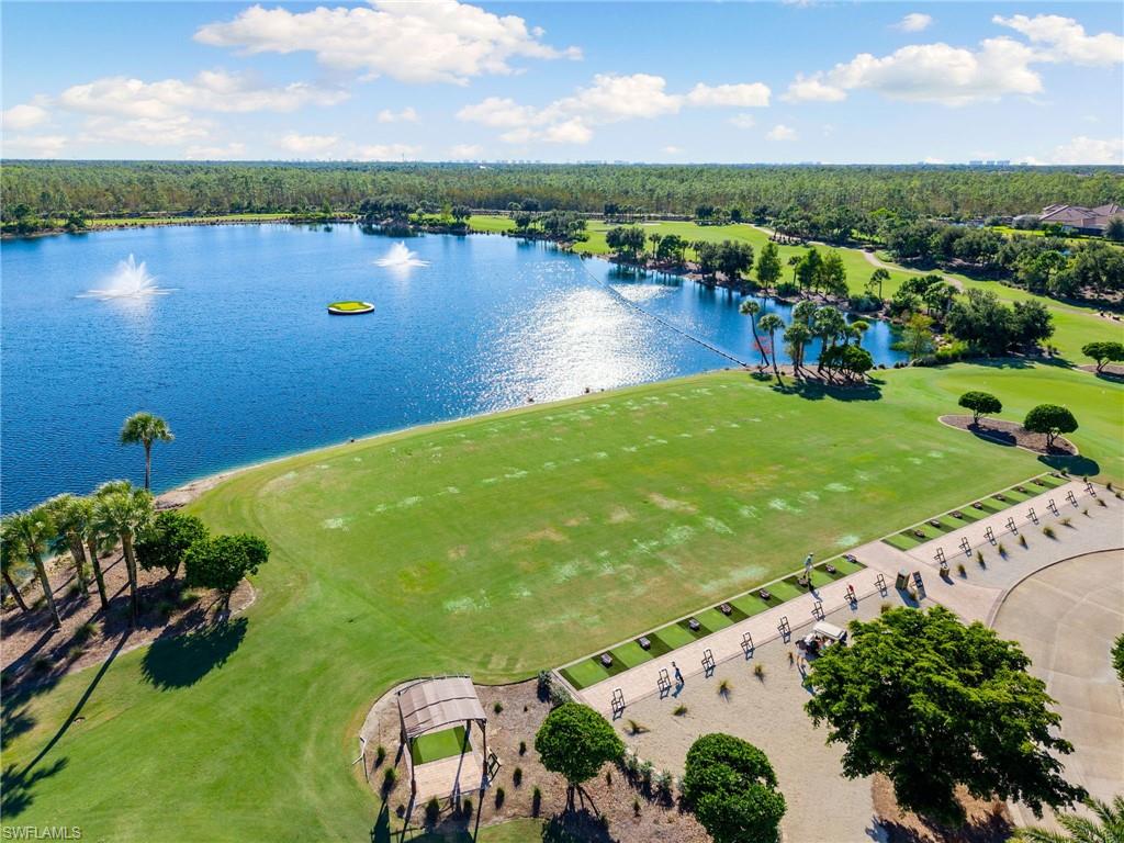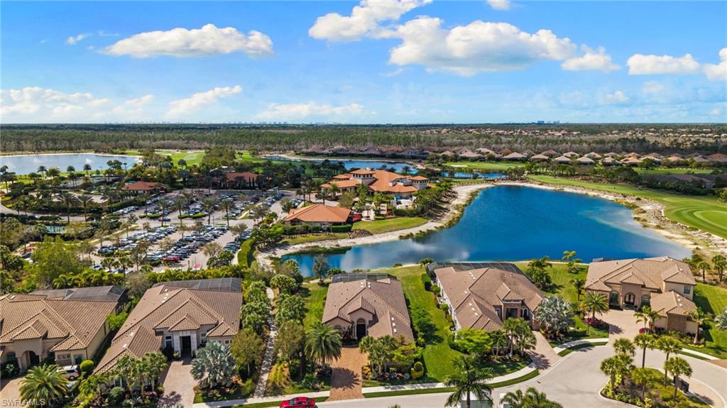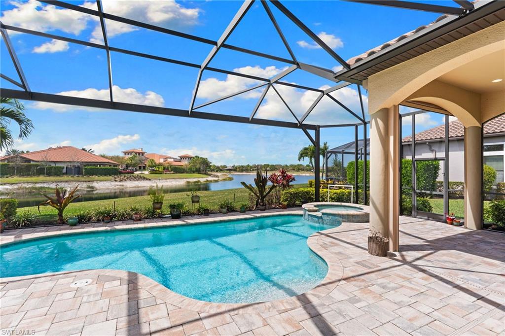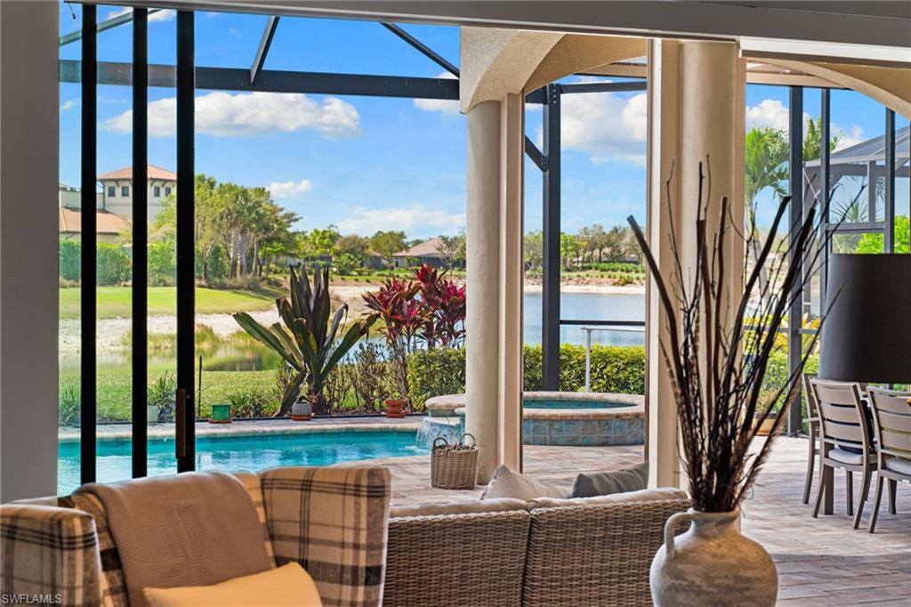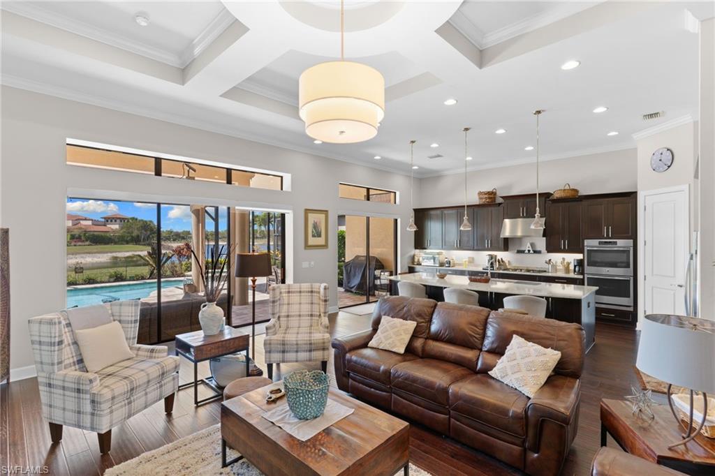 Discover unparalleled luxury and sophistication at 9012 Sorreno Ct, one of a kind home is nestled in the prestigious Esplanade Golf & Country Club of Naples. This Francesco floor plan sits on a premier, oversized lot with long water views, western exposure, and includes a FULL GOLF MEMBERSHIP. Located conveniently next to the club pathway, affording you privacy but quick access to all Esplanade has to offer. Inside the beautiful wood floors give way to a large open floor plan and up to soaring coffered ceilings. Waking up in the master suite is a treat - private, long lake views and warm sun flood the room through the large windows. For maximum privacy, your guest bedrooms are split to provide peace and tranquillity, each with private en-suite baths. The oversized pool and elevated spa sits under a modern, panoramic screen - allowing you to soak in every warm sunset over the lake. Open the pocketing sliding doors and let down your lanai hurricane screens to enjoy the true Florida indoor-outdoor lifestyle. Your 3-car-garage is ideal for car enthusiasts or for shop space - complete with elevated storage and workbench. Esplanade offers the ultimate Florida lifestyle, granting access to world-class amenities including an 18-hole private golf course, resort-style pool with cabanas and Bahama Bar, tennis, pickleball, bocce, Koquina Day Spa, fitness center, dog parks, 14 miles of biking and walking trails, and a 15,000-square-foot clubhouse with fine dining, bar, wine tasting room, wine lockers, and a coffee cafe —all covered under low quarterly dues with no additional fees. Don't miss this rare opportunity to own a slice of paradise; schedule your private showing today!