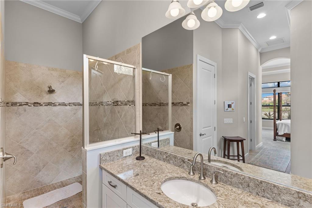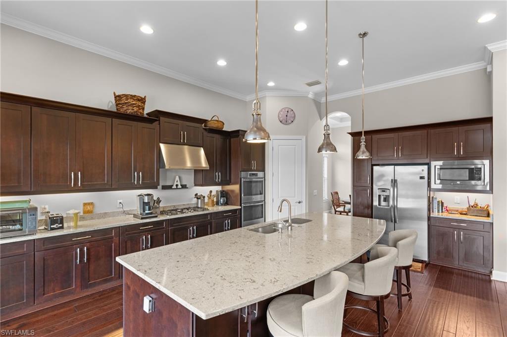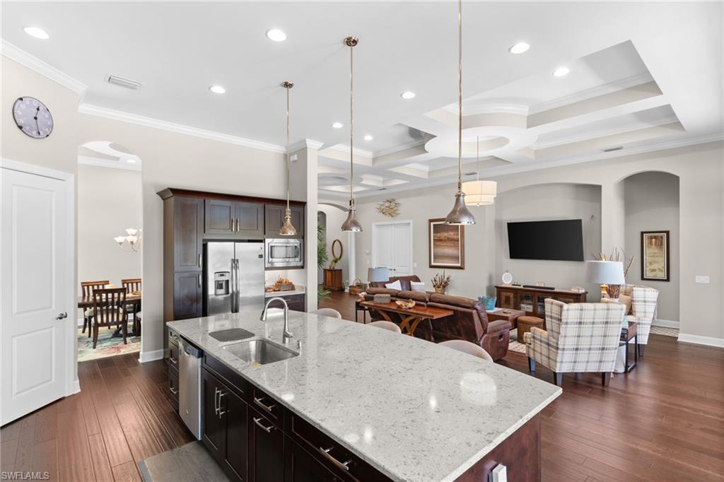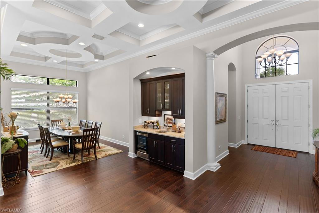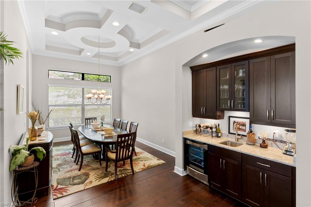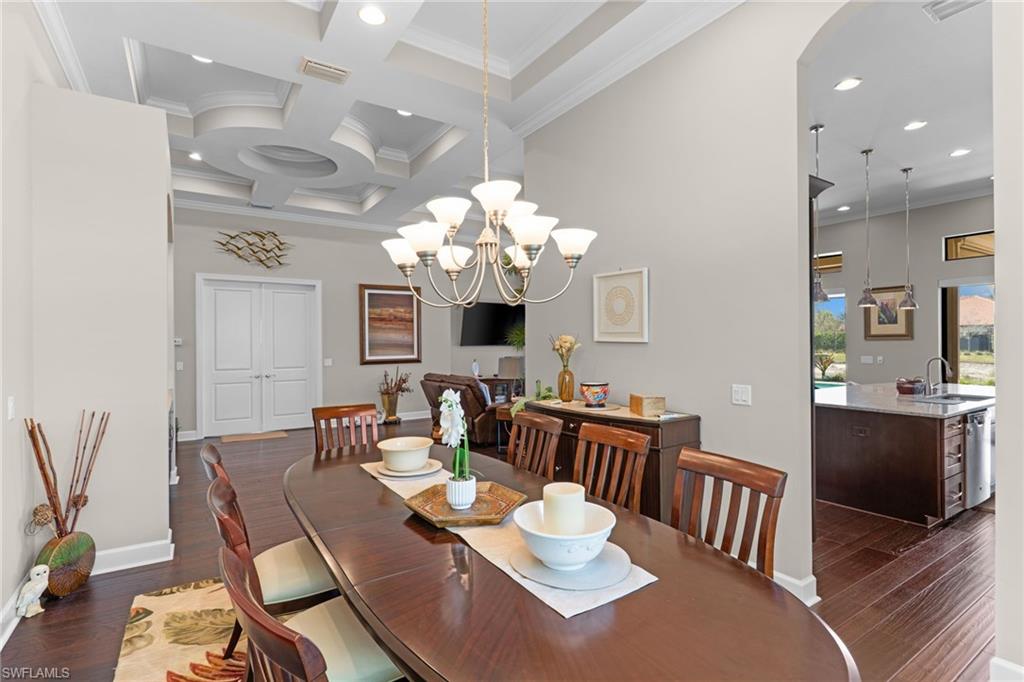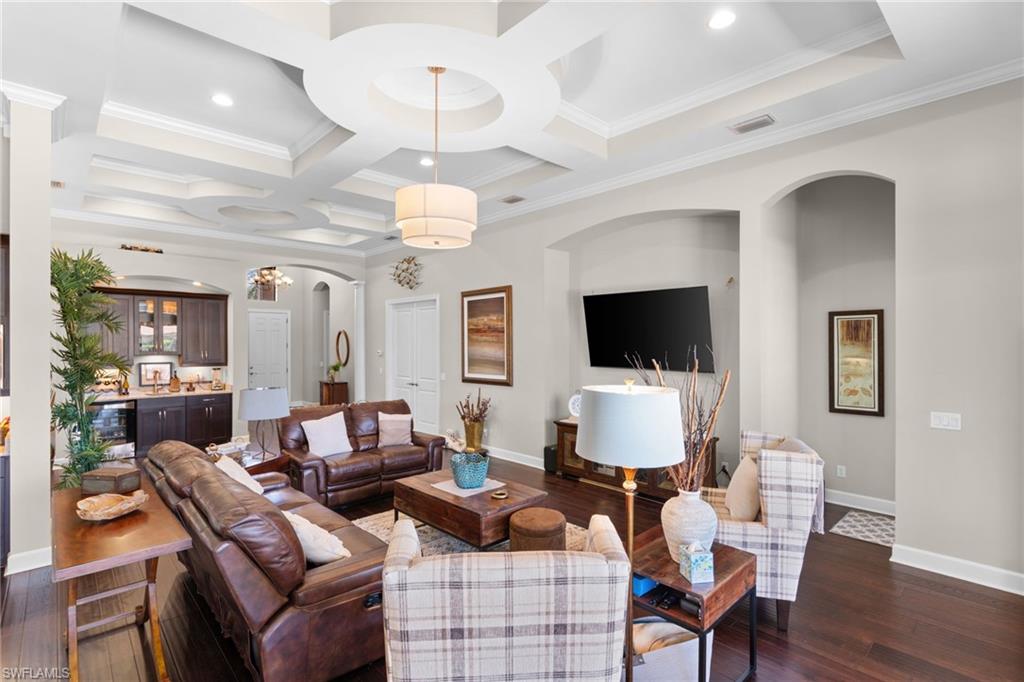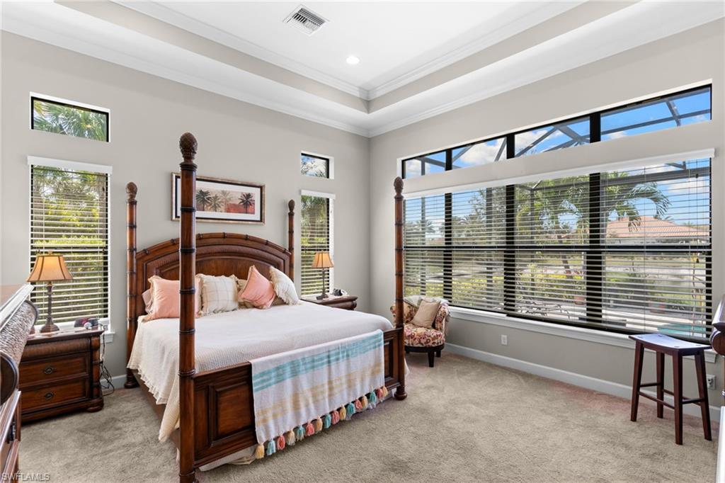 Discover unparalleled luxury and sophistication at 9012 Sorreno Ct, one of a kind home is nestled in the prestigious Esplanade Golf & Country Club of Naples. This Francesco floor plan sits on a premier, oversized lot with long water views, western exposure, and includes a FULL GOLF MEMBERSHIP. Located conveniently next to the club pathway, affording you privacy but quick access to all Esplanade has to offer. Inside the beautiful wood floors give way to a large open floor plan and up to soaring coffered ceilings. Waking up in the master suite is a treat - private, long lake views and warm sun flood the room through the large windows. For maximum privacy, your guest bedrooms are split to provide peace and tranquillity, each with private en-suite baths. The oversized pool and elevated spa sits under a modern, panoramic screen - allowing you to soak in every warm sunset over the lake. Open the pocketing sliding doors and let down your lanai hurricane screens to enjoy the true Florida indoor-outdoor lifestyle. Your 3-car-garage is ideal for car enthusiasts or for shop space - complete with elevated storage and workbench. Esplanade offers the ultimate Florida lifestyle, granting access to world-class amenities including an 18-hole private golf course, resort-style pool with cabanas and Bahama Bar, tennis, pickleball, bocce, Koquina Day Spa, fitness center, dog parks, 14 miles of biking and walking trails, and a 15,000-square-foot clubhouse with fine dining, bar, wine tasting room, wine lockers, and a coffee cafe —all covered under low quarterly dues with no additional fees. Don't miss this rare opportunity to own a slice of paradise; schedule your private showing today!