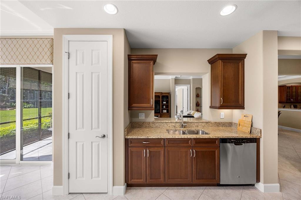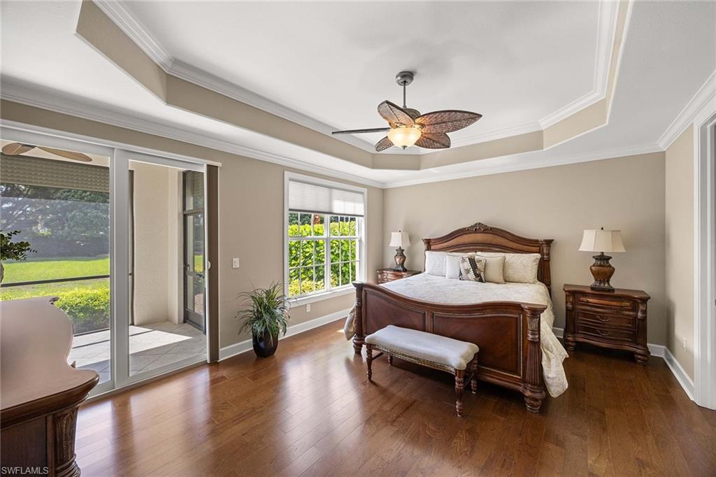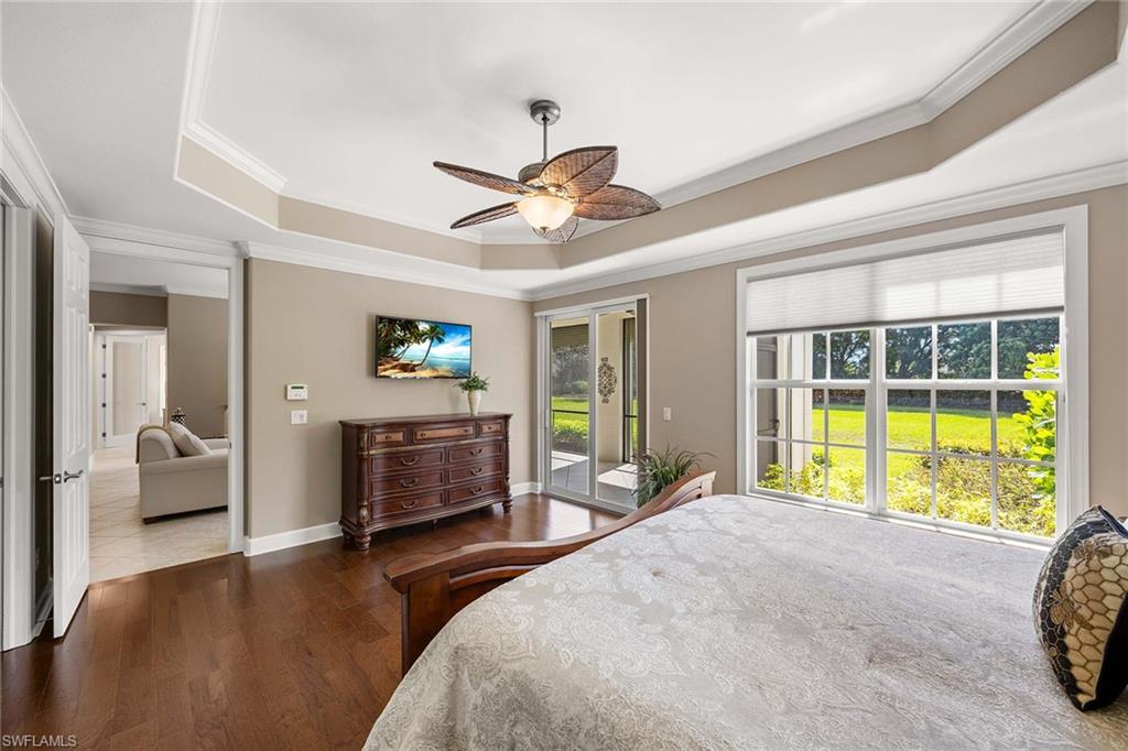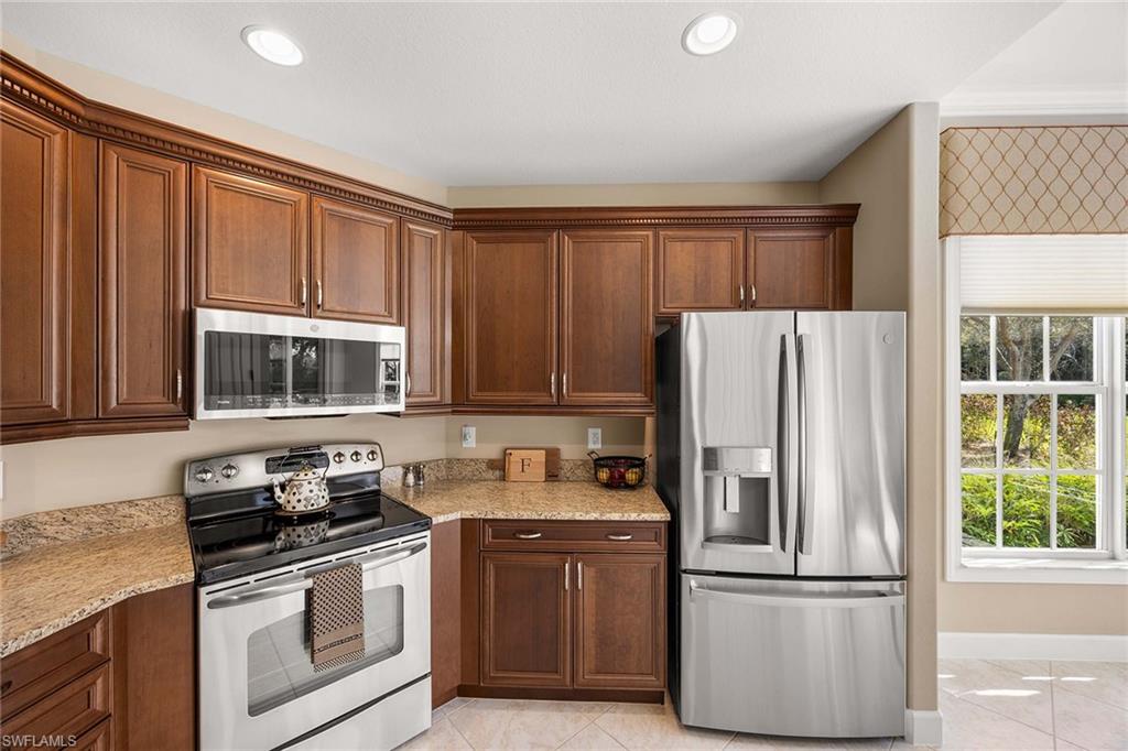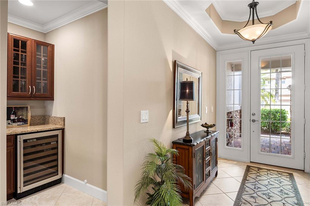 Welcome to Players Cove within the private, gated community of Lely Resort. This meticulously maintained first-floor end residence offers three bedrooms, two full baths and one half bath, with a spacious layout and immediate access to community amenities. Near The Players Club and Spa, this home provides convenient access to resort-style pools, tennis, pickleball, fitness facilities and on-site dining. Lely Resort is home to three championship 18-hole golf courses, including the Mustang and Flamingo Island courses, as well as the Classics Country Club. Interior features include impact-resistant windows and doors, Storm Smart roll-down shutters on the lanai and recently replaced air HVAC system and hot water tank. Large diagonal tile flooring extends through the main living areas and baths, while the primary bedroom offers elegant hardwood. The kitchen is appointed with granite countertops, and a new stainless steel refrigerator and microwave. Additional upgrades include crown molding, detailed woodwork around windows, custom window coverings, a wet bar with wine refrigerator and custom-built closet cabinetry. The residence also features a new washer and dryer and peaceful views of rock water fountains from the lanai, offering a private outdoor setting. Residents of Players Cove enjoy mandatory membership to The Players Club and Spa, providing access to an active social calendar and extensive recreational amenities in Lely Resort.