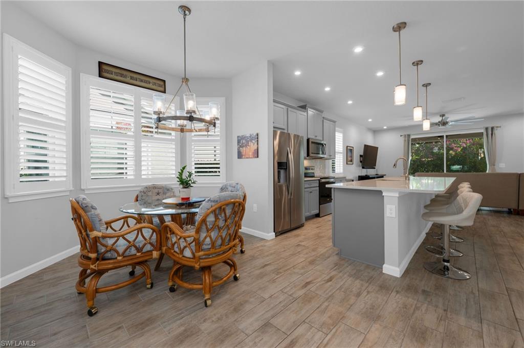 Southern exposure end unit filled with natural light and ideally located in the heart of the vibrant Bayshore Arts District. This move in ready residence offers a rare blend of comfort and convenience, featuring a two car garage, private patio, modern lighting, plantation shutters, and a spacious kitchen with a large island perfect for gathering and entertaining. Enjoy true lock and leave living with dues covering practically everything except electric, allowing for a low maintenance, hands free lifestyle. The thoughtfully designed amenities area captures stunning nightly sunsets, where you can swim in the resort style pool, unwind in the oversized spa, relax by the firepit, and enjoy the evening glow alongside friendly neighbors. Additional community features include a fitness center, grilling area, dog park, and scenic sidewalks winding around the lake and throughout the neighborhood. Just moments away, stroll to Naples Bay for sunsets over the Gulf and Port Royal, walk to the Naples Botanical Garden and Sugden Park, and enjoy local breweries, coffee shops, waterfront experiences, Downtown Naples, and pristine Gulf beaches only minutes away.