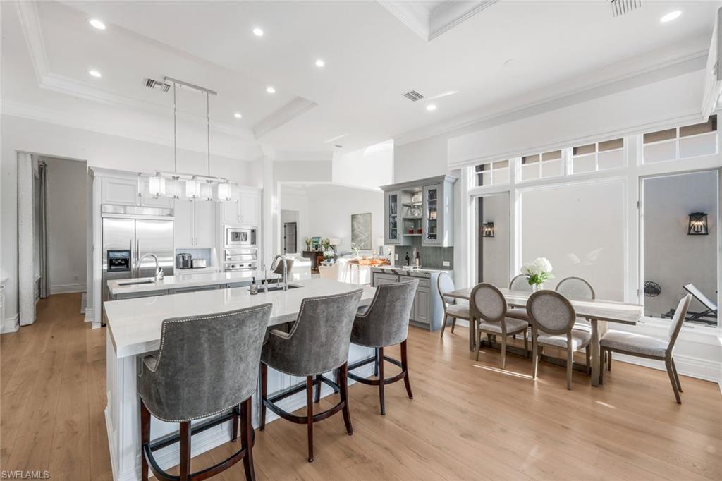 Located within the distinguished Estuary enclave of Grey Oaks Country Club, this exceptional Marsh Wren Lane residence offers 3,460 square feet under air and 5,170 total square feet of refined living space. Built in 2007, the home features Three Bedrooms plus a Den, Three full Baths, and two half Baths, thoughtfully designed for both comfort and entertaining. This property includes a two car garage as well as a single car garage -which makes it unique! Recent enhancements Elevate the interior, including brand new wide-plank white oak flooring throughout, a complete interior repaint, a new Lutron system which controls new LED Can lights and decorative light fixtures as well as landscape lighting. The redesigned kitchen showcases an updated configuration with a new bar area, creating a seamless flow for gatherings. The primary suite has been enhanced with a fully renovated spa-inspired bath, complemented by abundant custom storage and closets throughout the home. The outdoor area includes a new grill and an outdoor fireplace with plenty of room to entertain and enjoy the magnificent Sunsets! Additional upgrades include a Whole-house generator, new roll-down screens, hurricane shutters, new Kinetco Reverse Osmosis system, new tankless water heater, an Updated ADT Security system and mini-split air conditioning systems in both garages. Set within one of Naples’ most prestigious private golf communities, residents enjoy world-class amenities, championship golf, dining, fitness, and an unparalleled lifestyle in a secure, beautifully maintained setting. This is truly a special property!